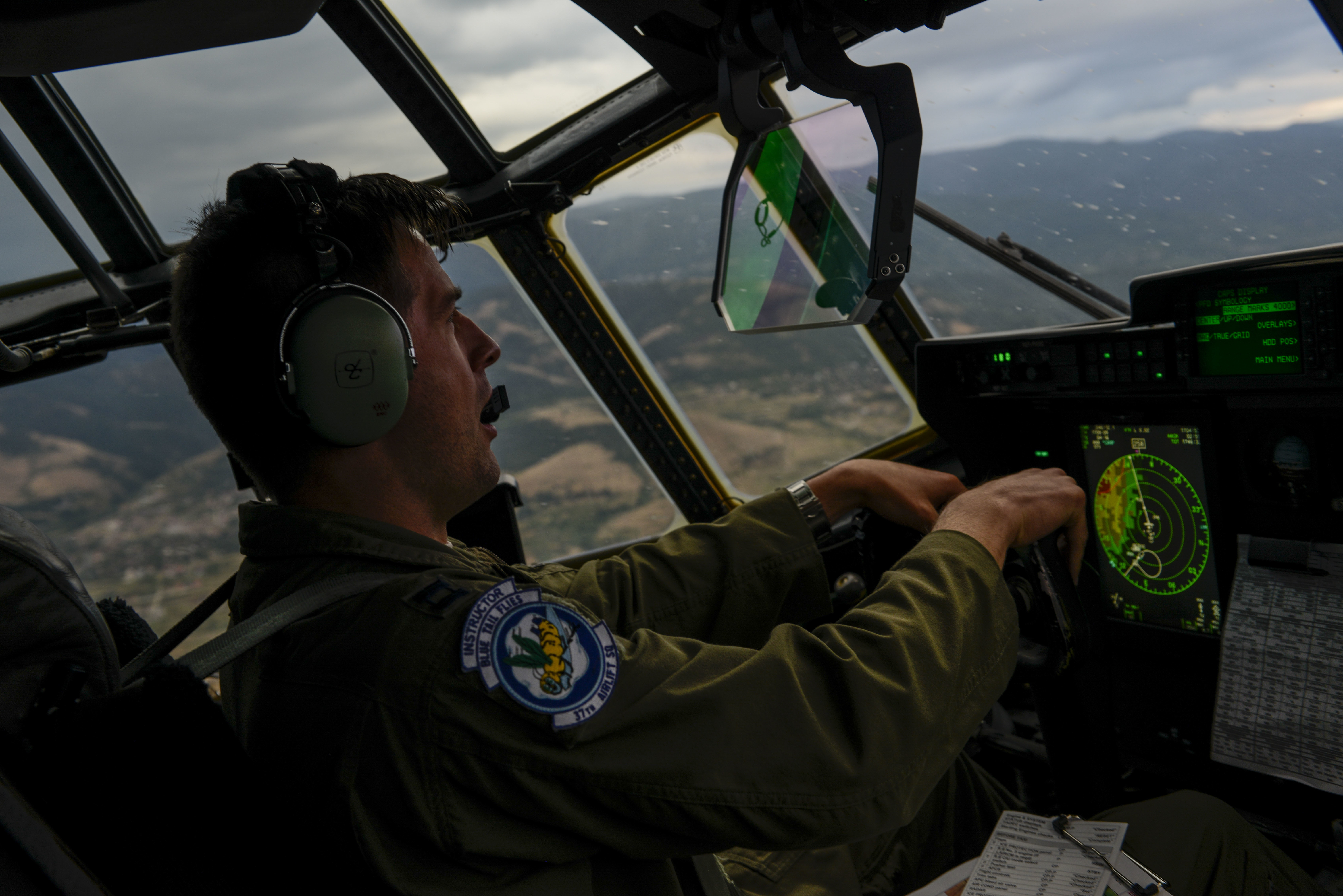 Capt. Derek Patrick, 37th Airlift Squadron pilot, flies over Plovdiv, Bulgaria during a formation flight during Exercise Thracian Summer 2016 July 17, Plovdiv, Bulgaria. Through Exercise Thracian Summer, the U.S. and Bulgaria will enhance their mutual ability to work together, with other NATO nations, and with key partners on regional security (U.S. Air Force photo/Senior Airman Nicole Keim)