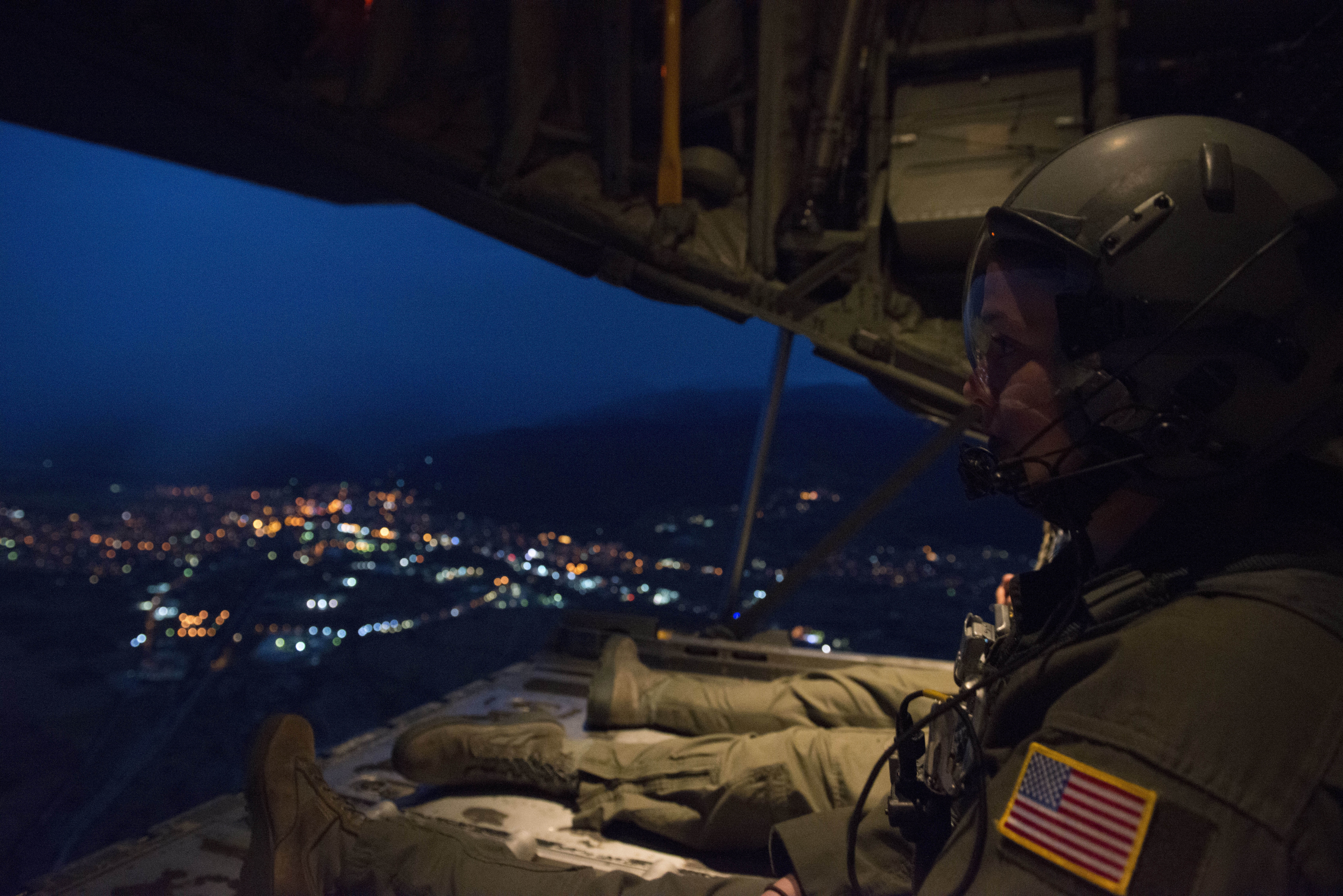 Senior Airman Emily Mitchell and Staff Sgt. Joshua Nelson, both 37th Airlift Squadron loadmasters sit on the ramp of a C-130J Super Hercules during a formation flight during Exercise Thracian Summer 2016 July 17, Plovdiv, Bulgaria. Through Exercise Thracian Summer, the U.S. and Bulgaria will enhance their mutual ability to work together, with other NATO nations, and with key partners on regional security (U.S. Air Force photo/Senior Airman Nicole Keim)
