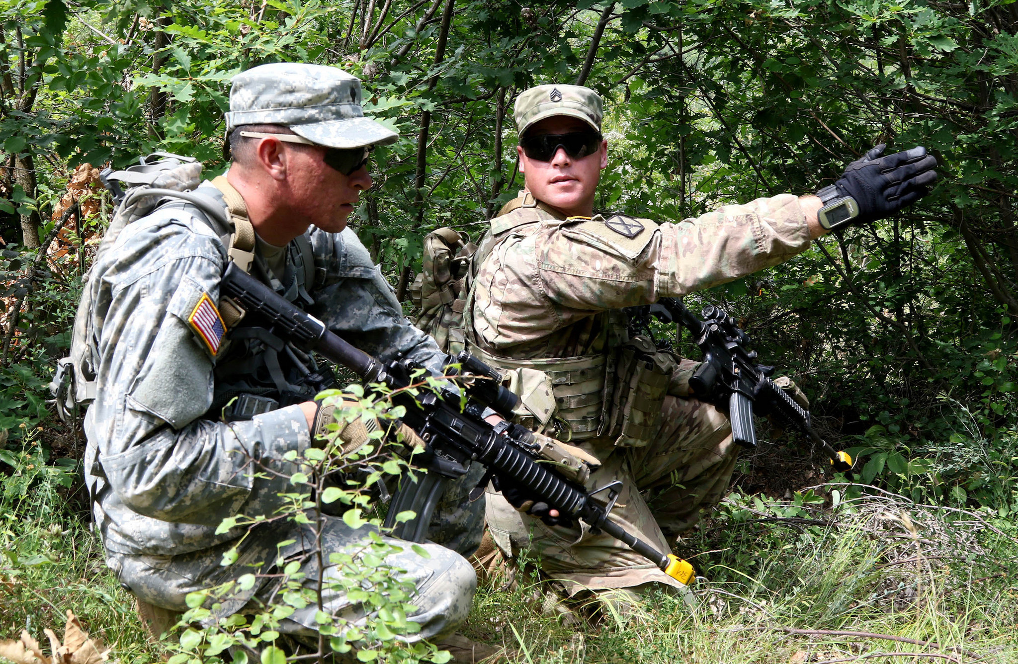 Staff Sgt. Daniel Dalton, squad leader with the 1st Battalion, 41st Infantry Regiment, 2nd Infantry Brigade Combat Team, assigns security positions to his team during a squad-level situational training exercise held in Dumnice, Kosovo, July 25, 2016. The purpose of the exercise was to train individual squad movements in preparation for a larger scale operation deemed Iron Eagle, later this year. (U.S. Army photo by: Staff Sgt. Thomas Duval, Multinational Battle Group-East Public Affairs)