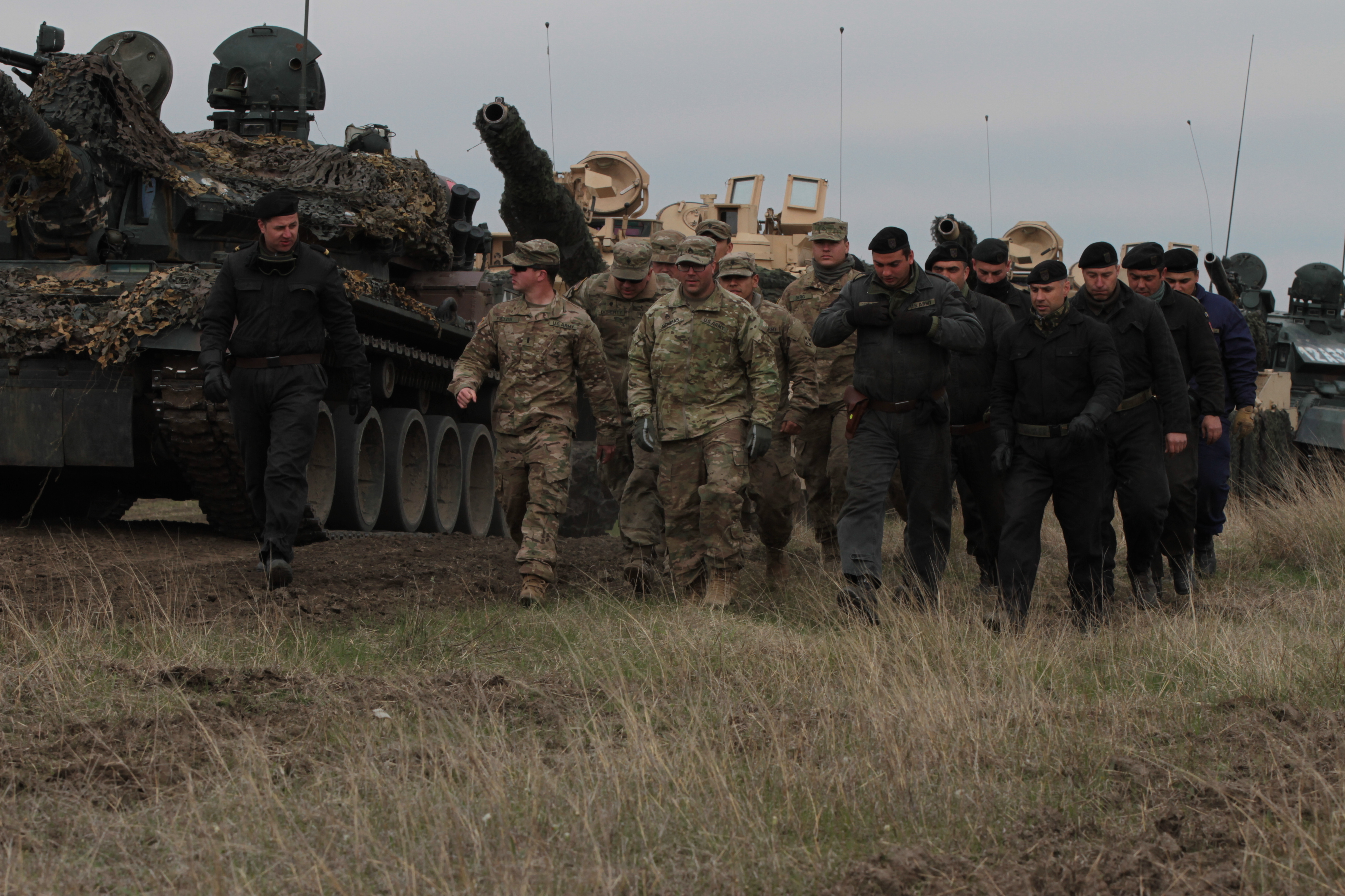 U.S. and Romanian soldiers march from their tanks in formation after a live fire training exercise at Smardan Training Area on April 19, 2017. Both forces have been training closely together as a part of Operation Atlantic Resolve, a NATO mission involving the U.S. and its European Allies and partners in a combined effort to strengthen friendships and promote peace in Eastern Europe. (Photo by Army Pvt. Nicholas Vidro, 7th Mobile Public Affairs Detachment)