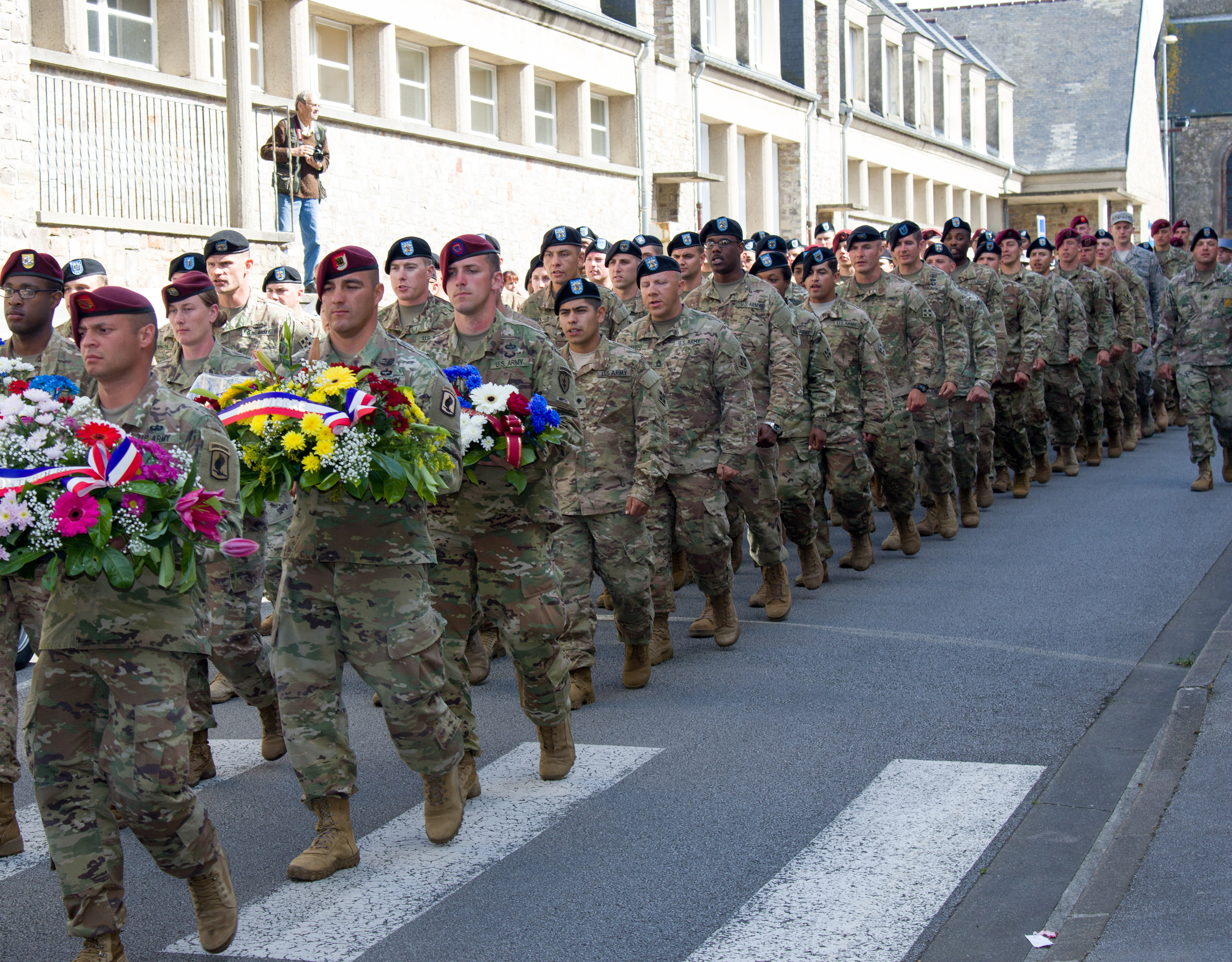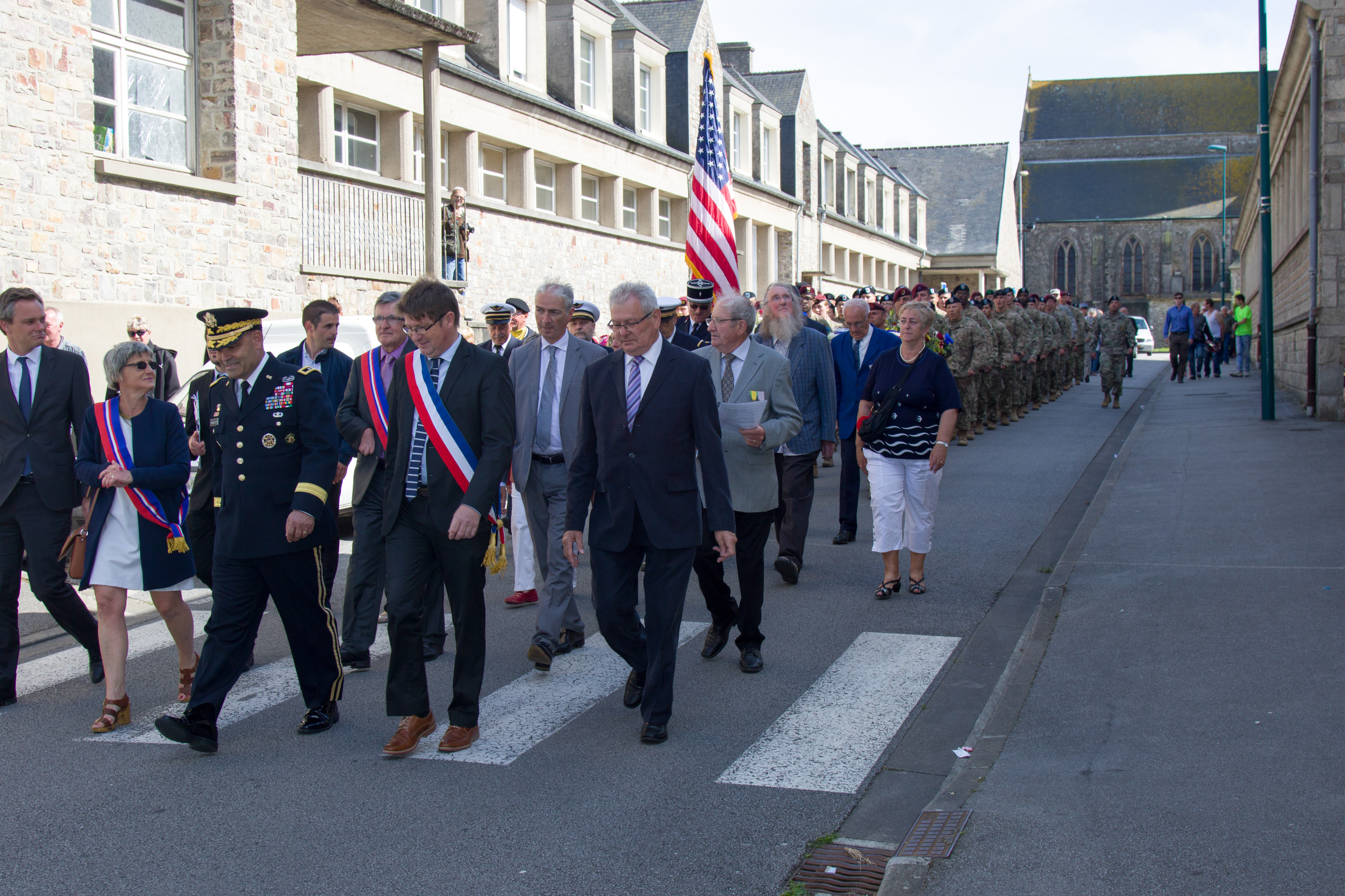 More than 100 Soldiers, joined the commanding general, French compatriots and people of Montebourg, during a march from the town center to the memorial wall. Select Soldiers from "Fighting Eagles" Battalion of the 3rd ABCT, 4th Inf. Div., participated in the march, the memorial dedication ceremony and dinner hosted by Montebourg civic leaders.