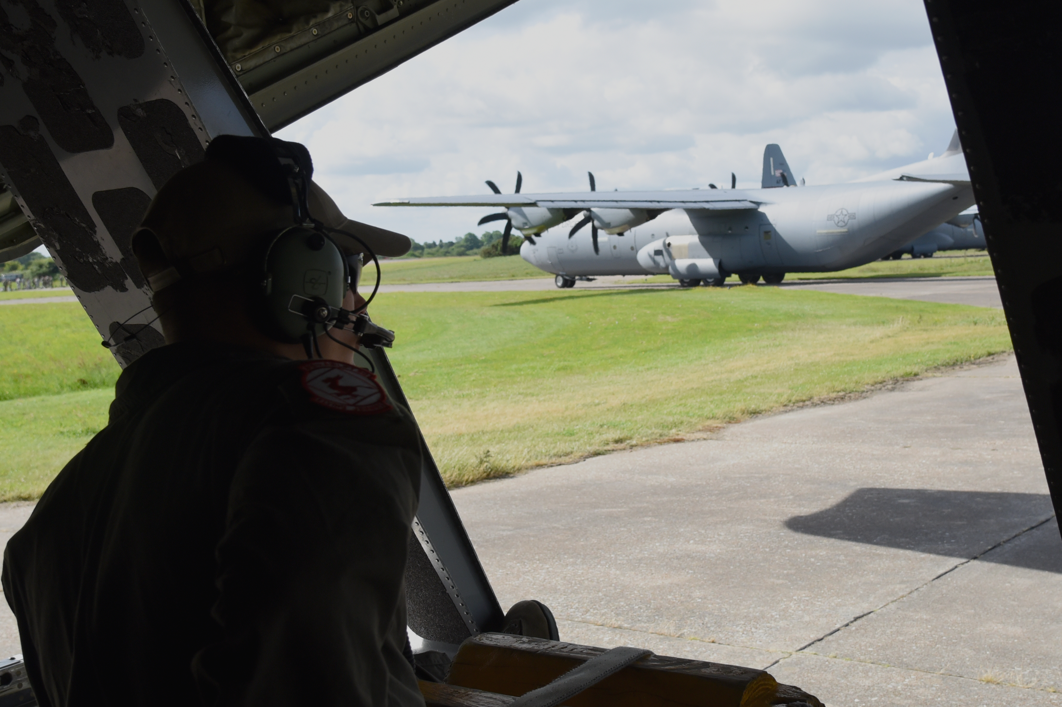 Senior Airman Shane Hague, loadmaster with the 815th Airlift Squadron, prepares to guide pilots as they back out of their parking spot before taking part in a paratroop drop over Normandy, France. This event commemorates the 73rd anniversary of D-Day, the largest multi-national amphibious landing and operational military airdrop in history, and highlights the U.S.' steadfast commitment to European allies and partners. Overall, approximately 400 U.S. service members from units in Europe and the U.S. are participating in ceremonial D-Day events from May 31 to June 7, 2017(U.S. Air Force photo by Staff Sgt. Nicholas Monteleone)