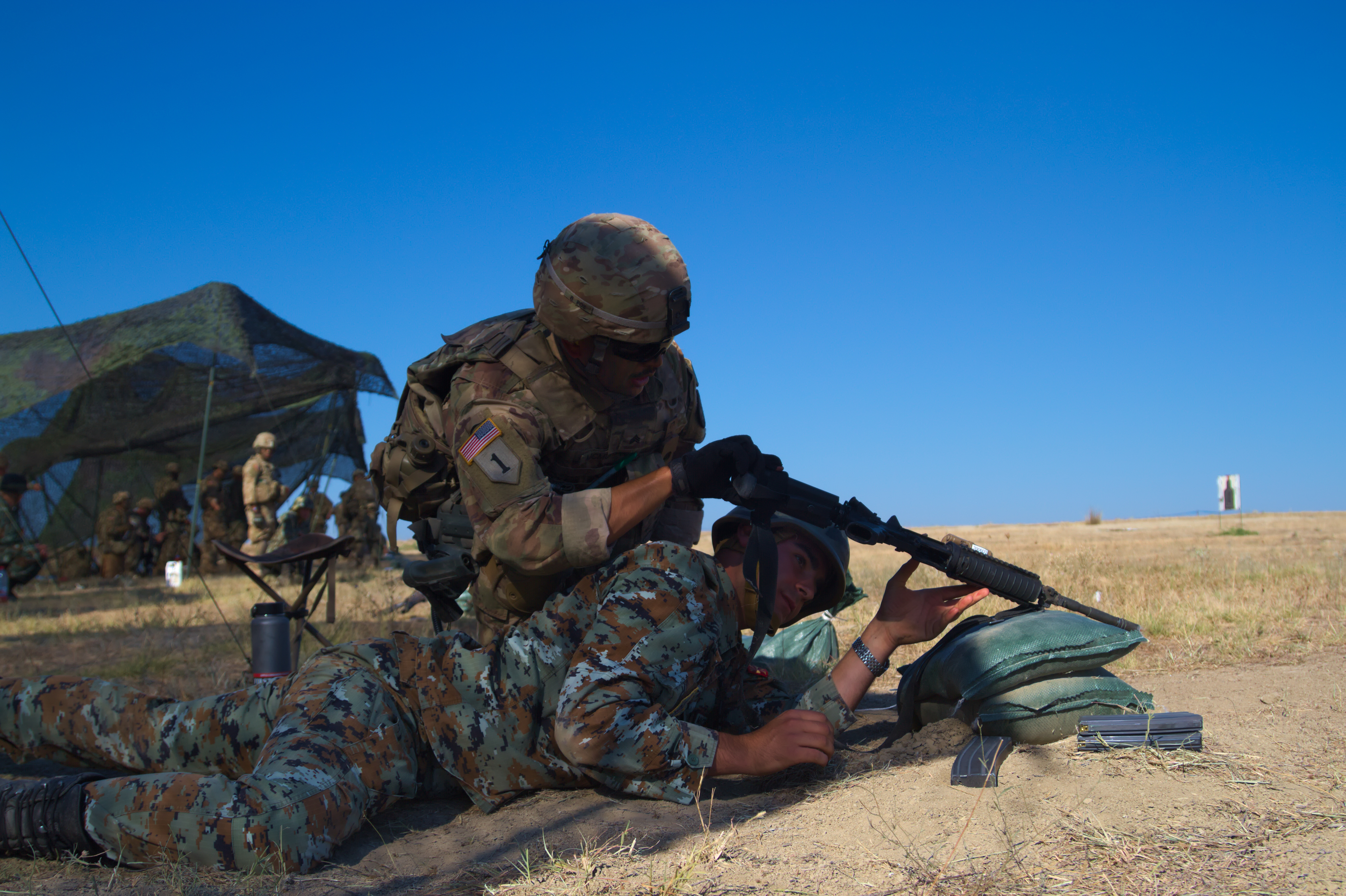 U.S. Army 1st Sgt. Roy Rodriguez, first sergeant of Troop A, Regimental Engineering Squadron, 2nd Cavalry Regiment, guides Macedonian Pvt. Ivica Petrov, a soldier with 1st Platoon, Engineering Battalion, on firing an M4 rifle during a firing range at Krivolak Training Area, Macedonia on August 1, 2017. The Regimental Engineering Squadron is currently working in country as a part of Dragoon Guardian, an offshoot of Operation Atlantic Resolve, a NATO mission involving the U.S. and Allied and partnered nations in Europe, designed to promote peace and deter aggression across the region. (Photo by Army Pfc. Nicholas Vidro, 7th Mobile Public Affairs Detachment)