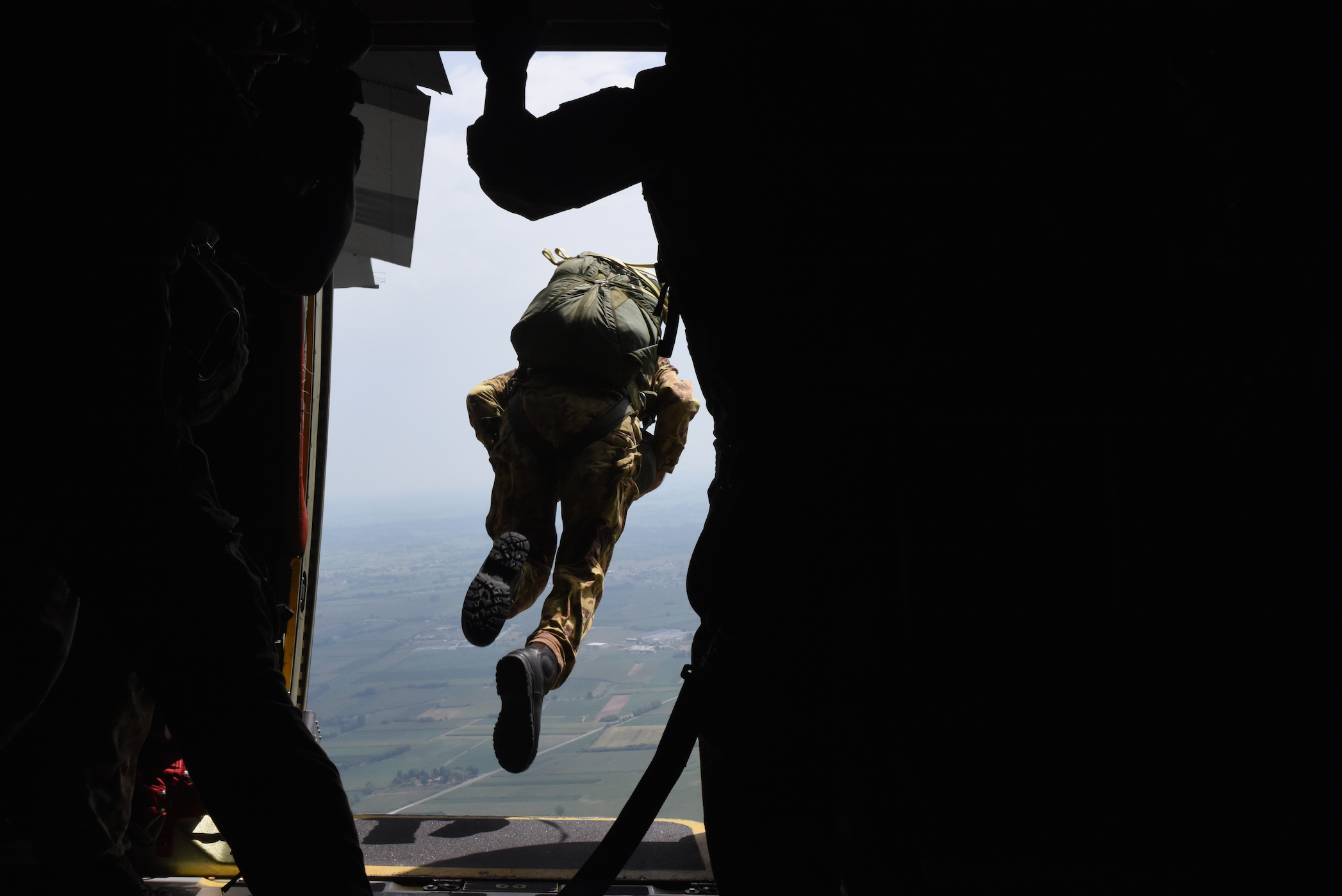 A member of the Italian armed forces performs a static line jump from a 37th Airlift Squadron C-130J Super Hercules during exercise Ares Shadow, Aug. 10. This exercise marked the first time the 57th Rescue Squadron jumped with the Italian armed forces. (U.S. Air Force photo/Airman 1st Class Eli Chevalier)