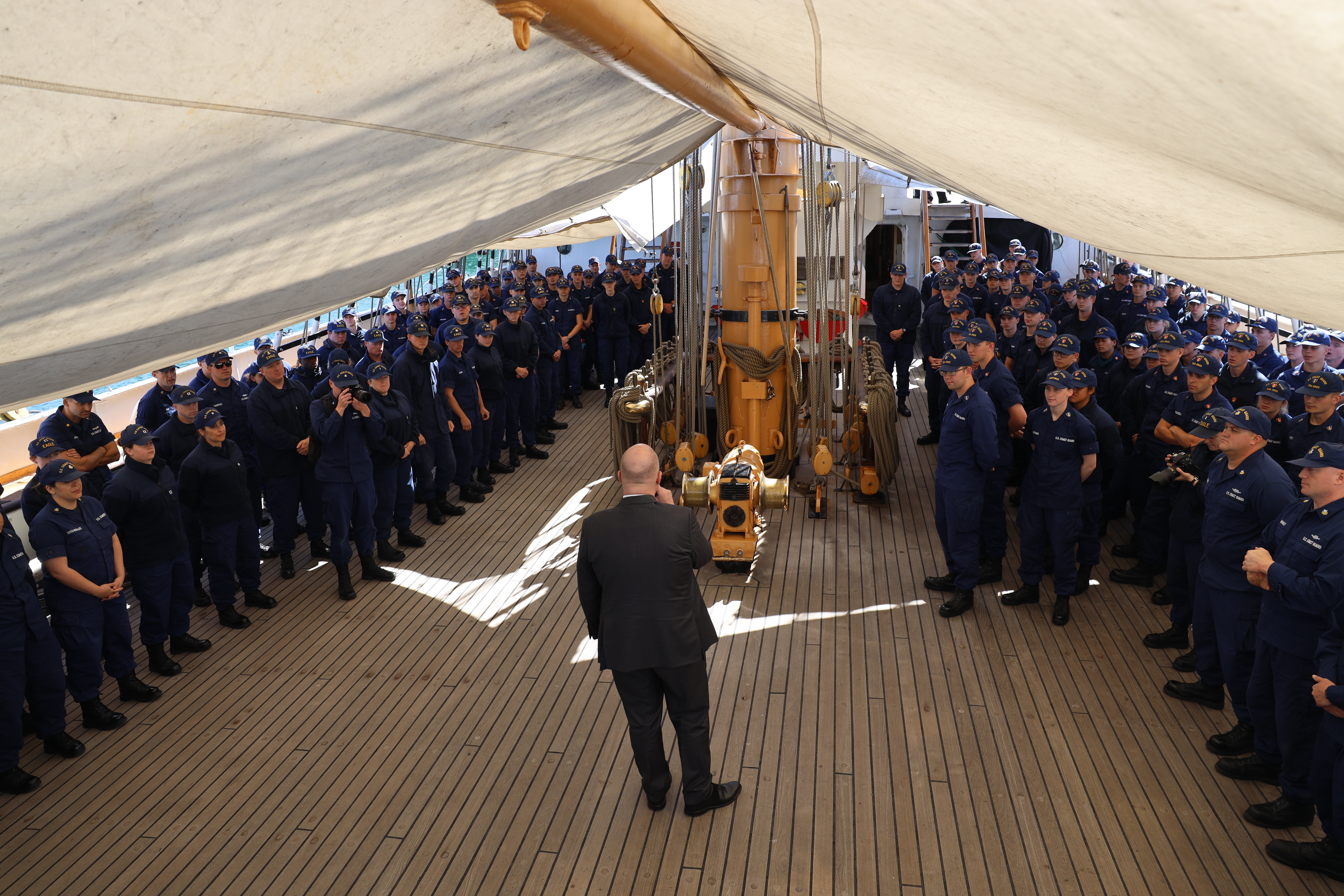 Jonathan Moore, principal deputy assistant secretary, Bureau of Oceans and International Environmental and Scientific Affairs, addresses the crew of USCGC Eagle (WIX 327), "America's Tall Ship," in Reykjavik, Iceland, June 12, 2021. Eagle is currently conducting summer U.S. Coast Guard Academy cadet training in at-sea leadership and professional development, first visiting Portugal, now Iceland, followed by Bermuda. (U.S. Coast Guard photo by Petty Officer 3rd Class Ryan Schultz)