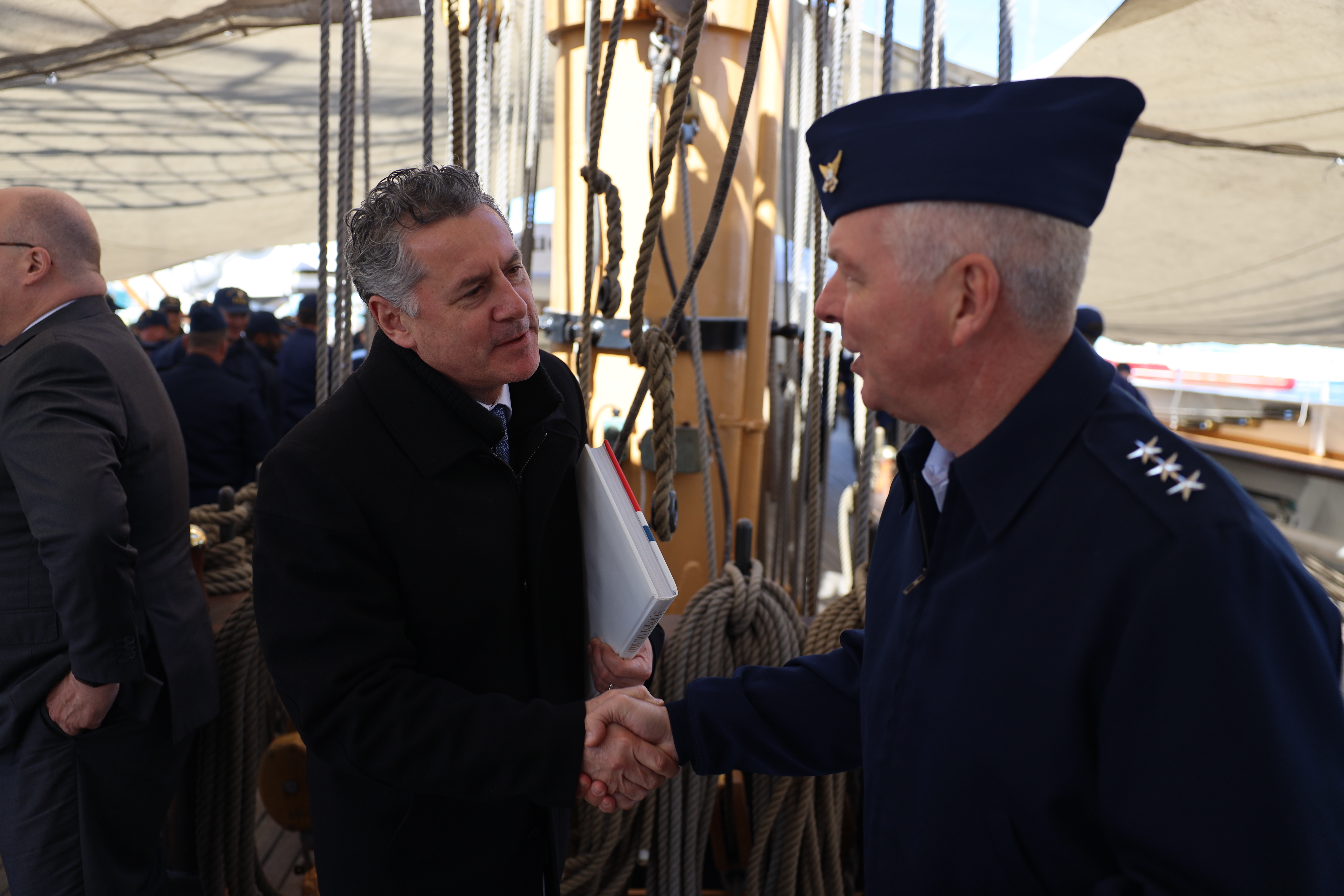 Vice Adm. Steven Poulin, commander U.S. Coast Guard Atlantic Area, shakes hands with Chargé d'Affaires Harry Kamian aboard USCGC Eagle (WIX 327), "America's Tall Ship," in Reykjavik, Iceland, June 12, 2021. Poulin was in Iceland to meet with the embassy, ministry, and coast guard officials. (Photo courtesy U.S. Embassy Reykjavik, Kristjan Petersson)