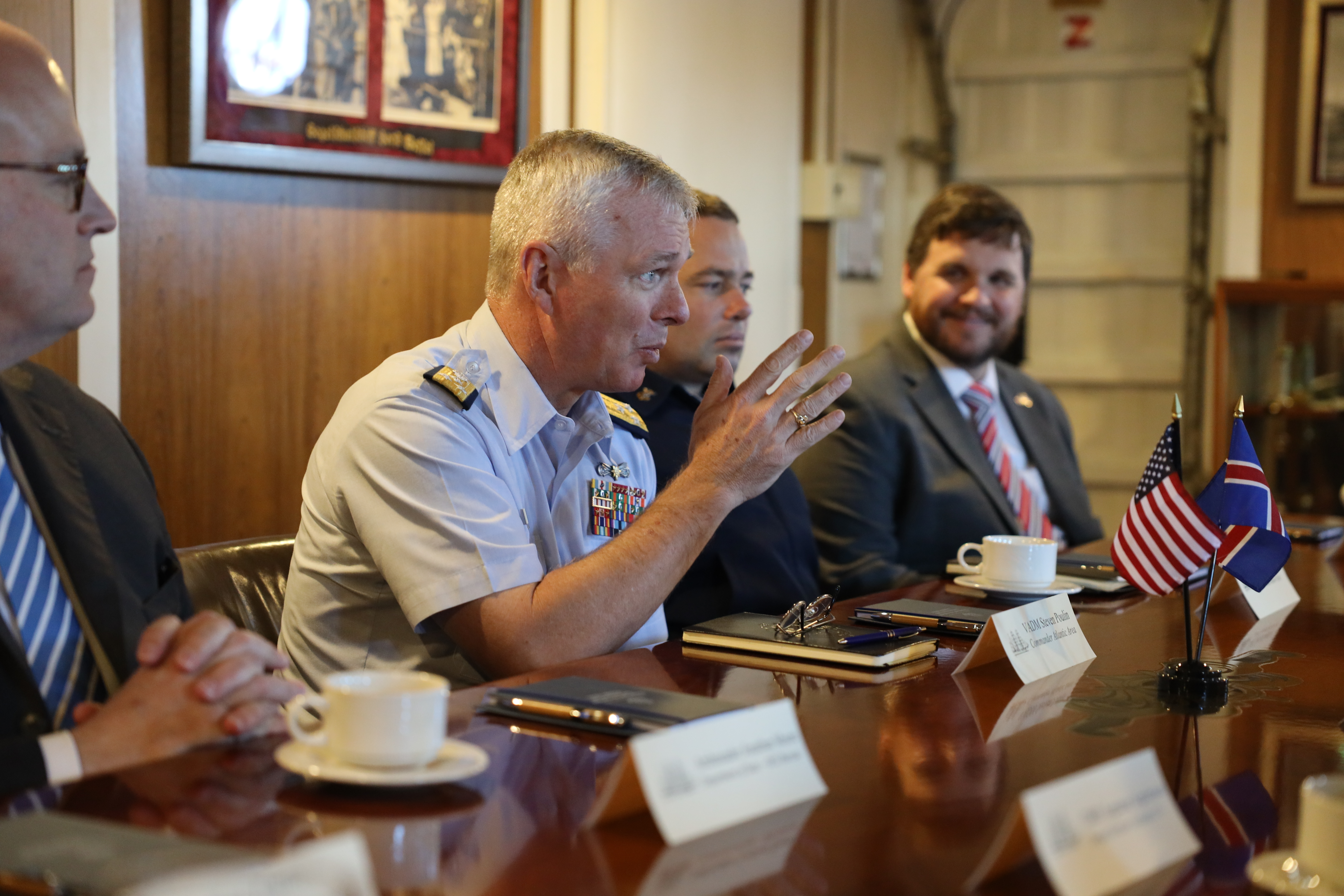 Aboard Eagle moored in the harbor, Vice Adm. Steven Poulin, commander U.S. Coast Guard Atlantic Area, joined by Jonathan Moore, principal deputy assistant secretary, Bureau of Oceans and International Environmental and Scientific Affairs, met with Commadore Asgrimur Asgrimsson of the Icelandic coast guard, Chargé d'Affaires Harry Kamian, and Byrndis Kjartansdottir, director of security and defense directorate in the Icelandic Ministry of Foreign Affairs.