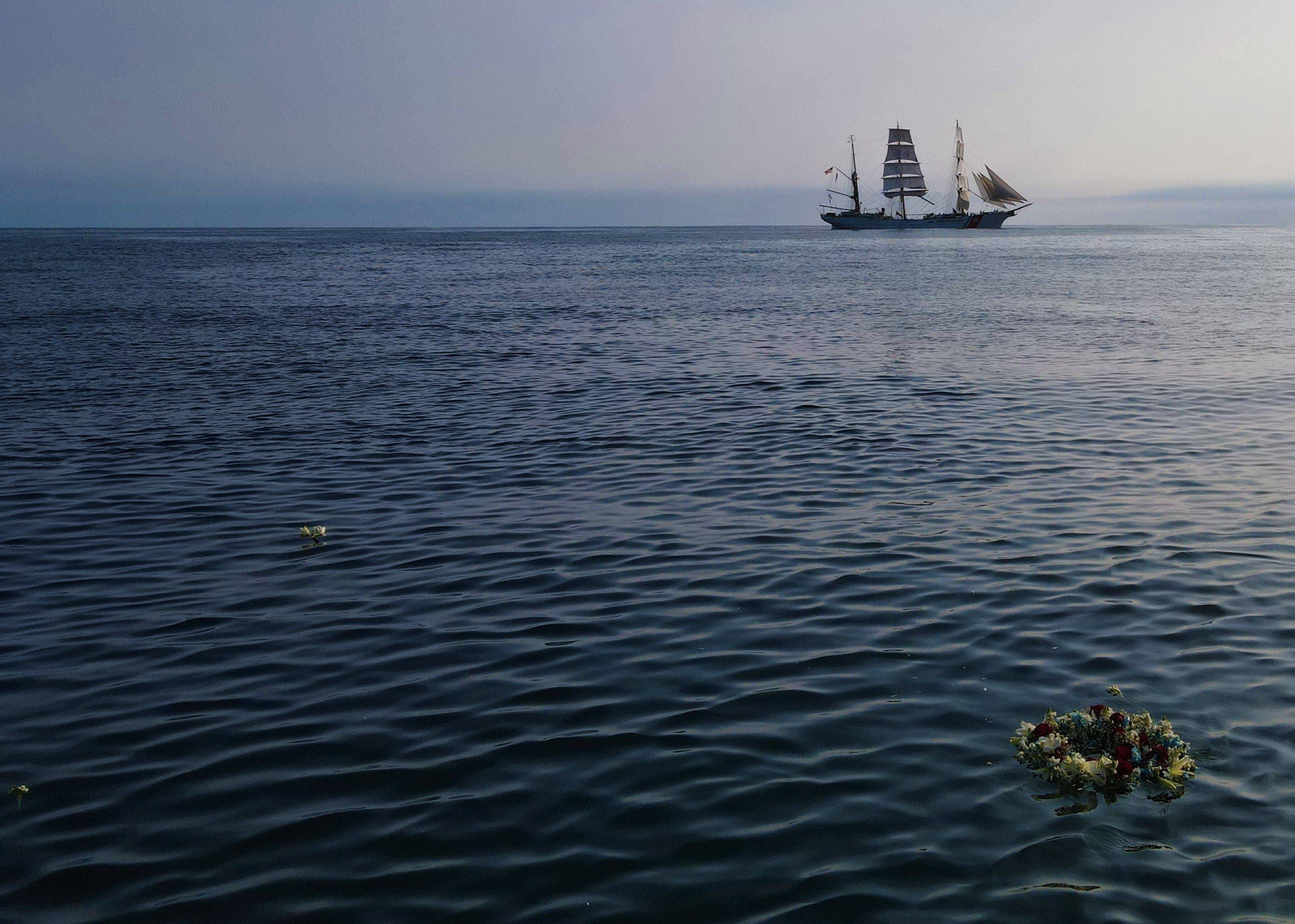 On approach to Iceland on June 6, 2021, the USCGC Eagle (WIX 3287) crew conducted a wreath-laying in memory of the Treasury-class USCGC Hamilton (WPG 34), torpedoed by German submarine U-132 in 1942 while patrolling the Icelandic coast near Reykjavík. Of the 221 person crew, 26 members were lost. (U.S. Coast Guard photo courtesy Ensign Elena Calese)