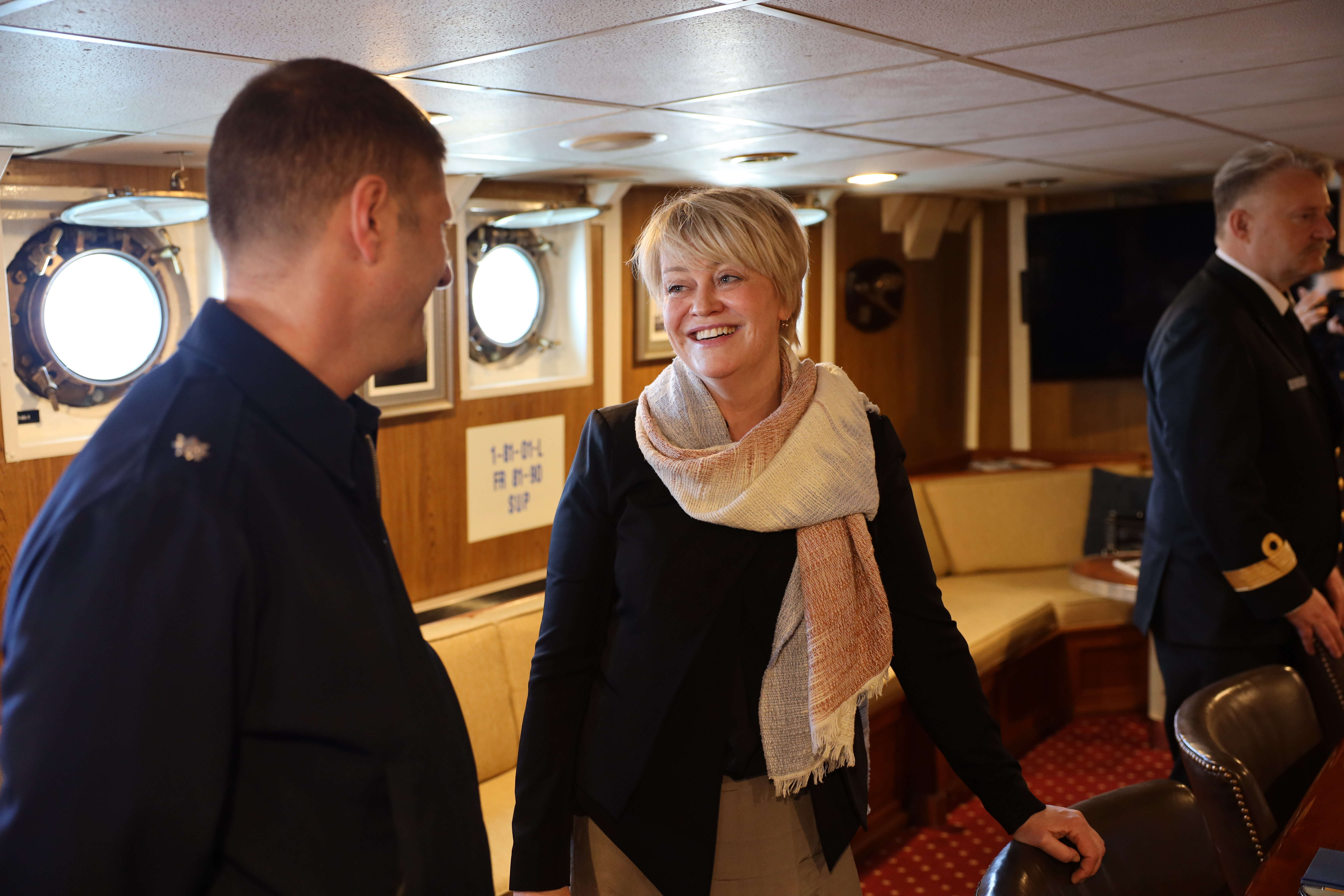 Capt. Michael Turdo, commanding officer of USCGC Eagle (WIX 327), speaks with Byrndis Kjartansdottir, director of security and defense directorate in the Icelandic Ministry of Foreign Affairs, aboard Eagle in Reykjavik, Iceland, June 12, 2021. Eagle is currently conducting summer U.S. Coast Guard Academy cadet training in at-sea leadership and professional development, first visiting Portugal, now Iceland, followed by Bermuda. (Photo courtesy U.S. Embassy Reykjavik, Kristjan Petersson)