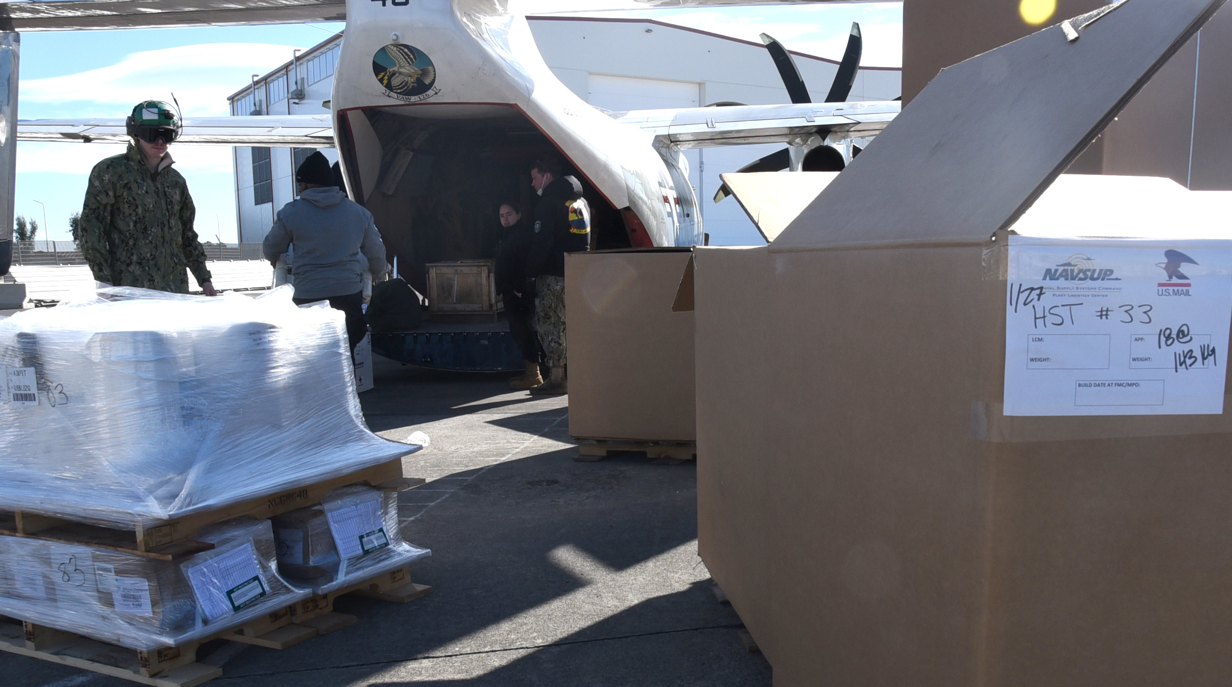 NAS SIGONELLA, Italy (Feb. 2, 2022) Naval Aircrewmen assigned to the Nimitz-class aircraft carrier USS Harry S. Truman (CVN 75) Beach Detachment 1 load mail and packages destined for HST Carrier Strike Group (HSTCSG) crewmembers. The HSTCSG participated in the NATO-led activity Neptune Strike 2022, Jan. 24-Feb. 4, 2022. (U.S. Navy photo by Joe Yanik)