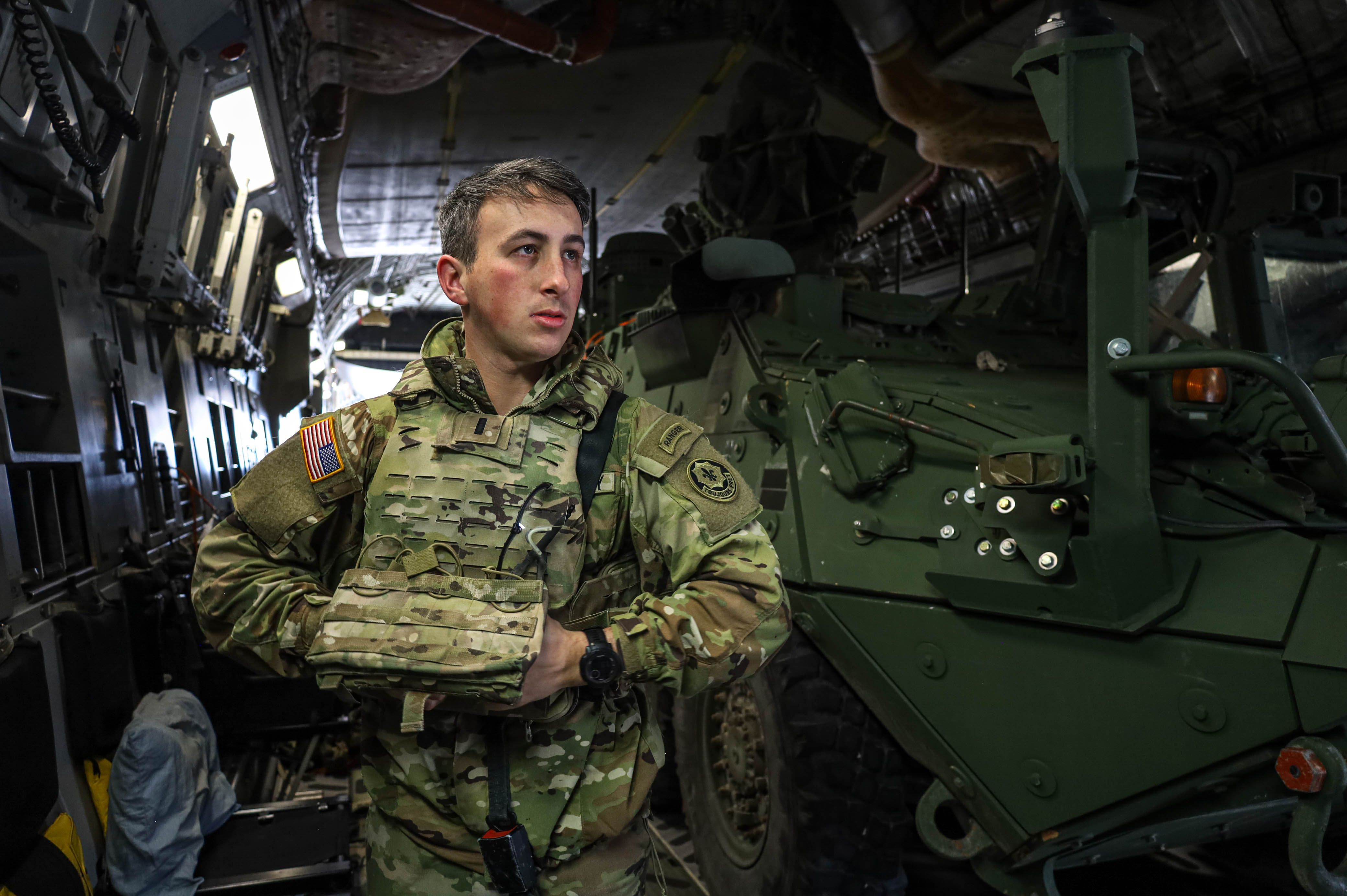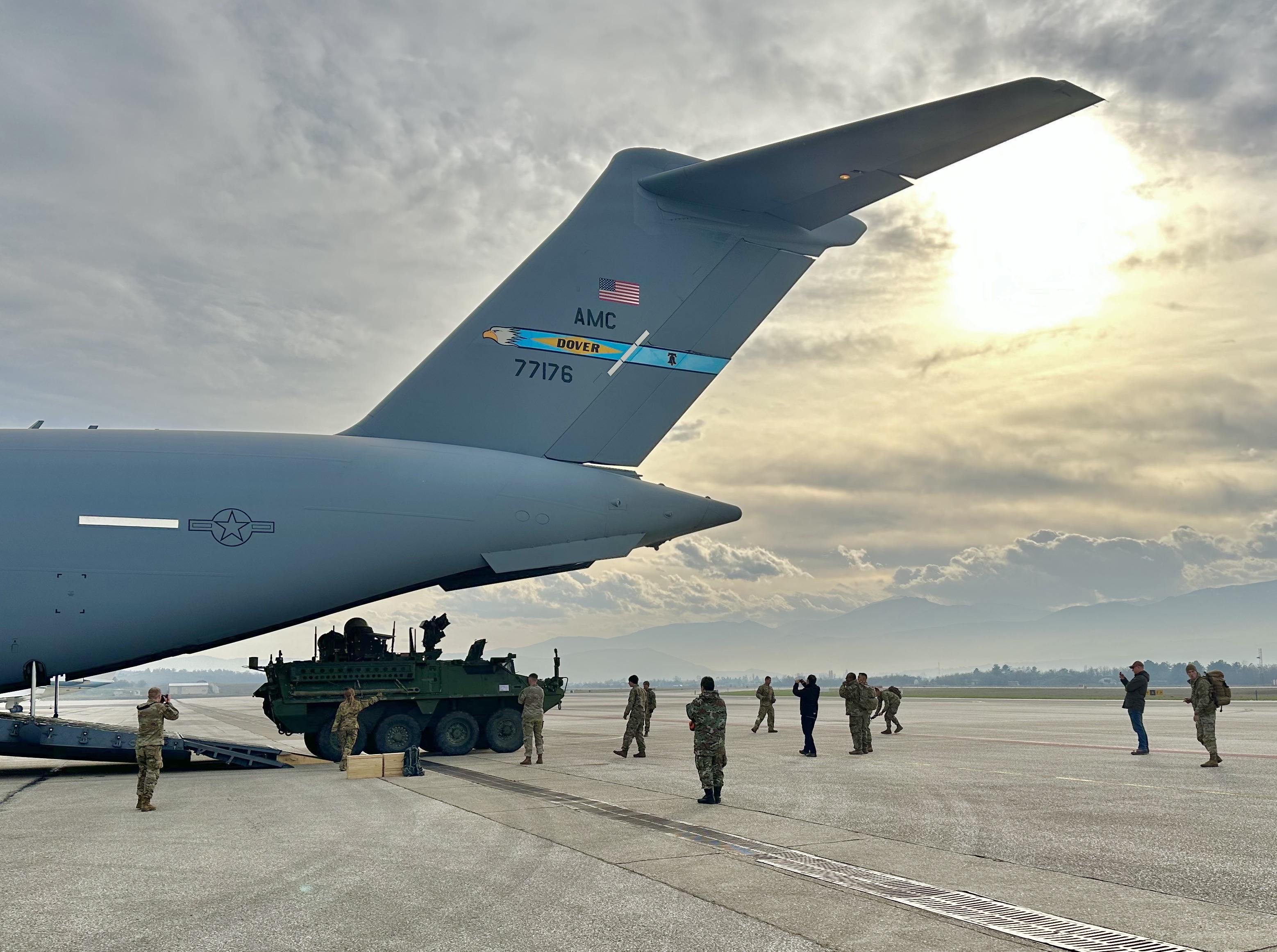 As part of USAREUR-AF’s Tactical Mission Data Platform, 2CR’s Stryker vehicles were a command post aboard a C-17 aircraft, demonstrating innovation and speed in exchanging information and tools between commanders en route in the sky and warfighters on the battlefield.