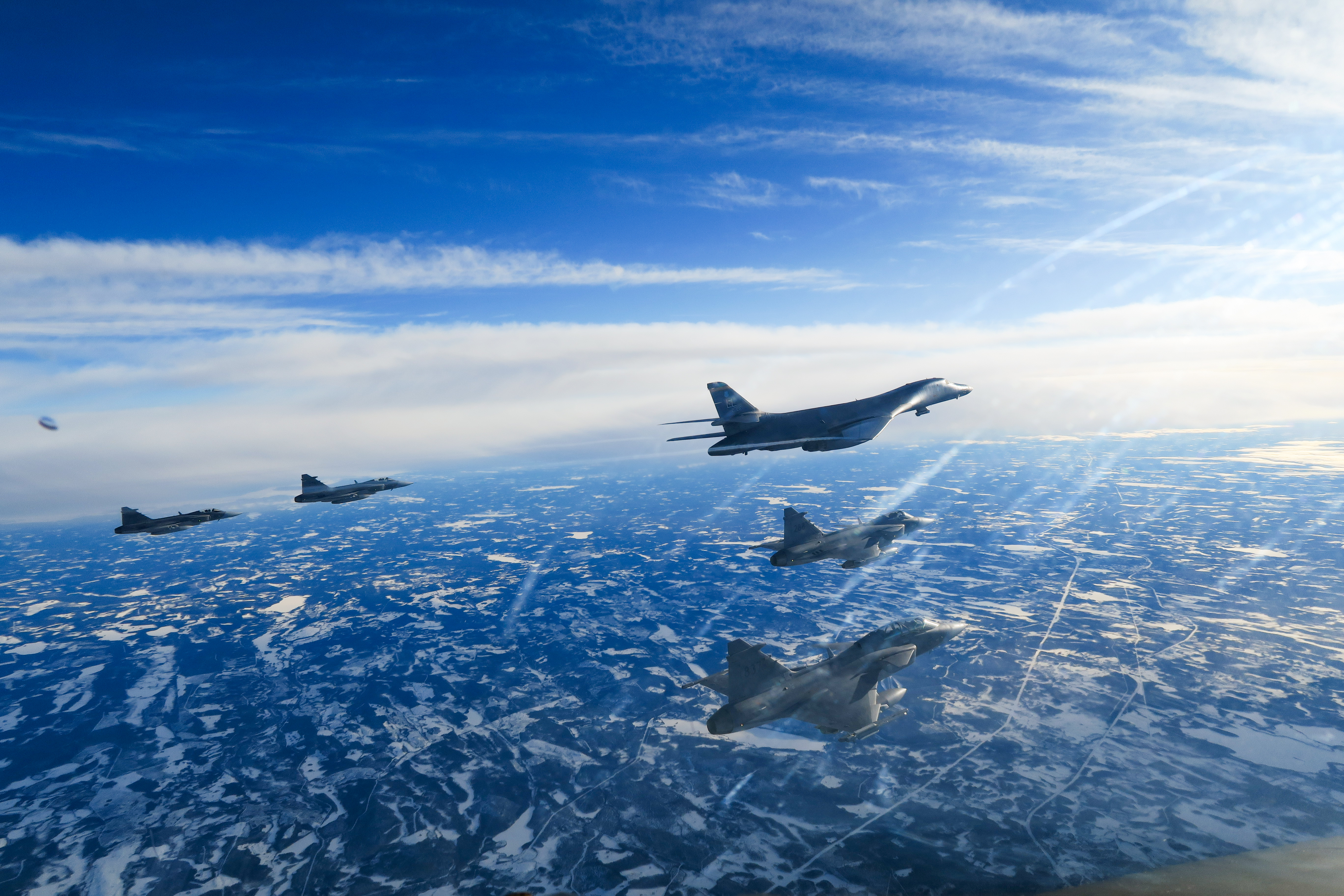 At various intervals of the mission across northern Europe, the bombers were accompanied by an array of aircraft - including fuelers and fighters - from Denmark, Finland, Netherlands, Sweden and the U.K.
