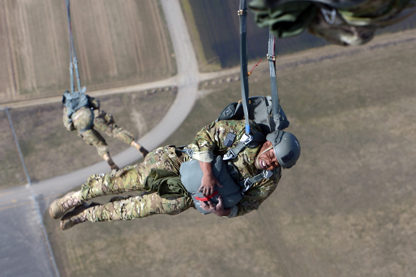 A U.S. Soldier assigned to 1st Battalion, 10th Special Forces Group (Airborne) free falls as his parachute opens after jumping out of a C-130 Hercules aircraft over a drop zone in Germany, March 17, 2015. (U.S. Army photo by Visual Information Specialist Jason Johnston/Released)