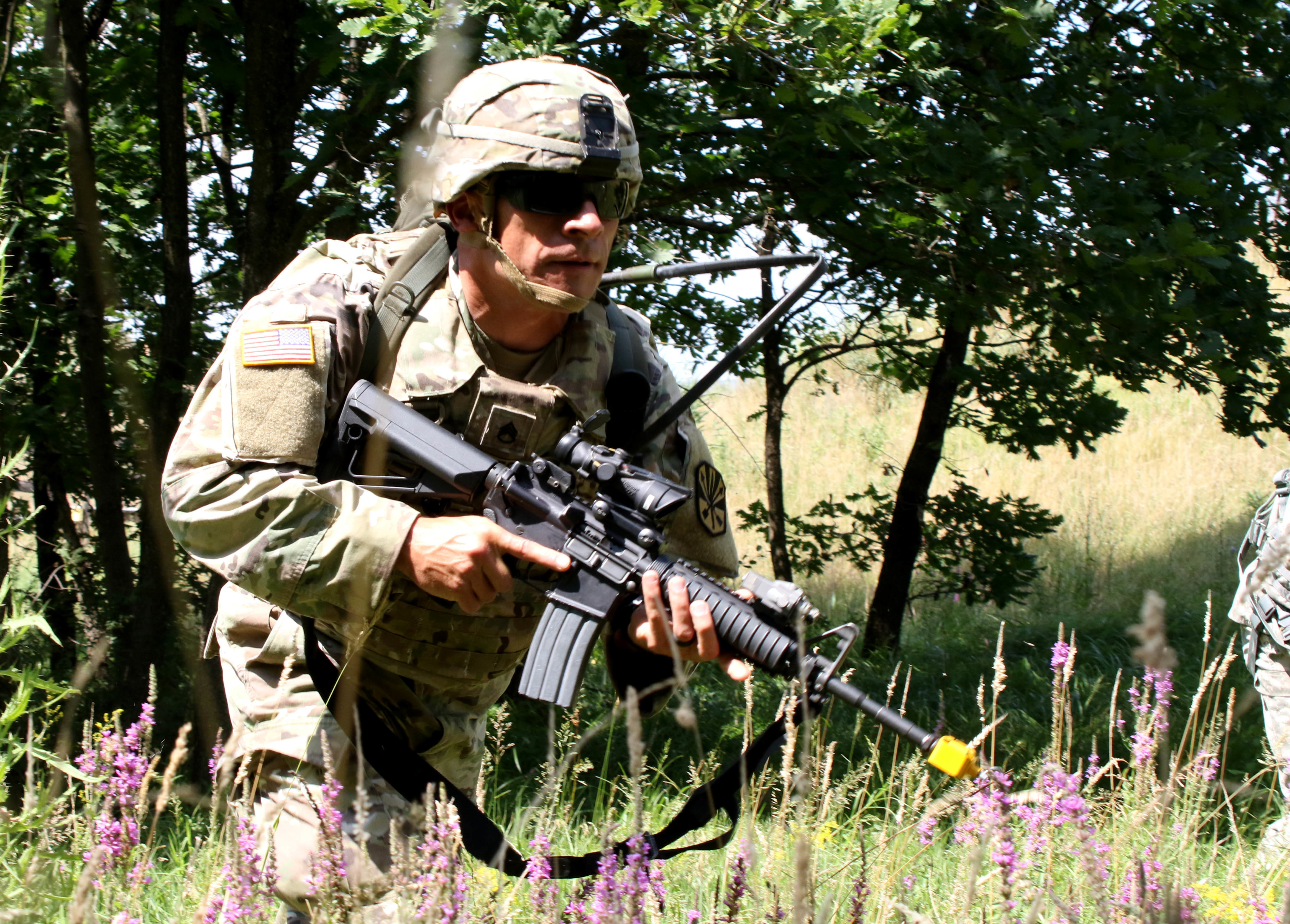 Staff Sgt. Oscar Morales, an infantryman and Arizona Army National Guardsman assigned to the 2nd Assault Helicopter Battalion, 285th Aviation Regiment, navigates through a field of high brush during the Multinational Battle Group-East's Best Warrior Competition held on Camp Bondsteel, Kosovo, July 9. (U.S. Army photo by: Staff Sgt. Thomas Duval, Multinational Battle Group-East Public Affairs)