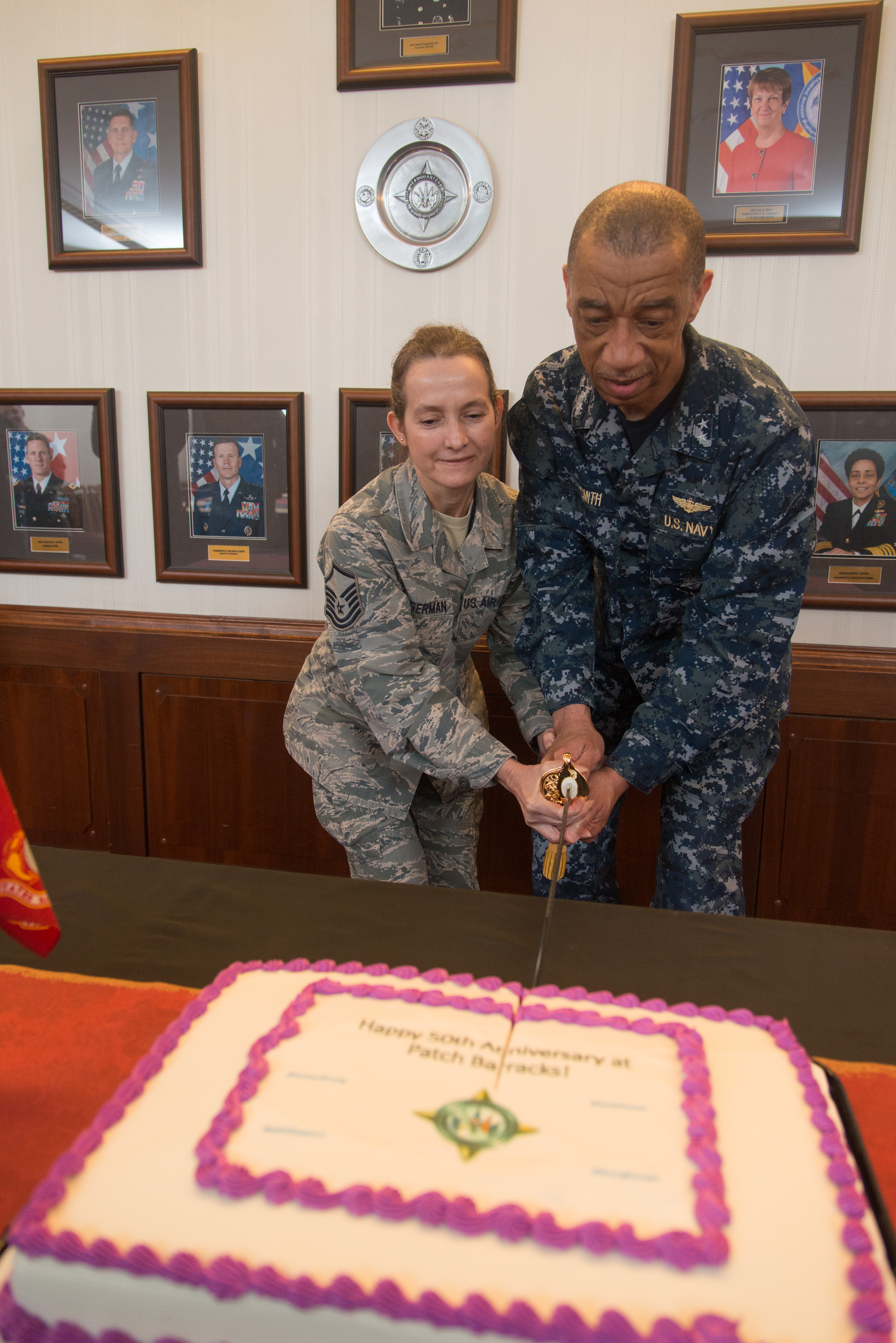 STUTTGART, Germany - Rear Adm. John W. Smith,U.S. European Command, Chief of Staff, and Master Sgt. Alicia Singerman, EUCOM Secretary of the Joint Staff, Superintendent, cut the cake at a ceremony to commemorate 50 years in Stuttgart Mar. 15, 2017. “Fifty years ago today, the U.S. flag was unfurled here at Patch Barracks -- and ever since then, the men and women of EUCOM remain postured and ready to face a rapidly changing international security environment,” said Rear Adm. Smith. (U.S. European Command photo by Martin Greeson)