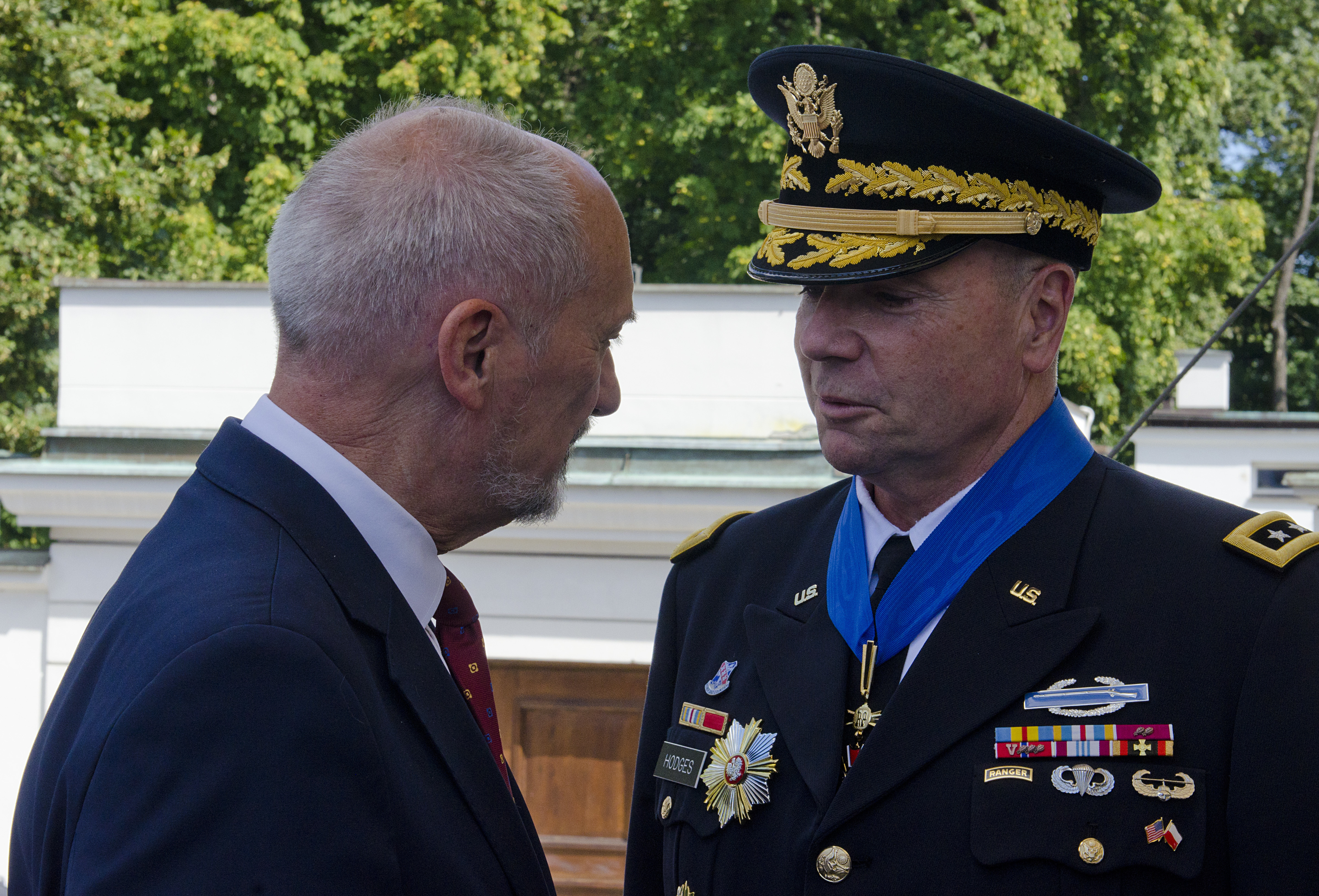 Minister of National Defense, Antoni Macierewicz thanked the Commanding General of U.S. Army Europe, Lt. Gen. Ben Hodges for his service during the 97th anniversary of the Battle of Warsaw Aug. 15, 2017, in Warsaw, Poland. This national holiday in Poland, known as the Feast of the Polish Armed Forces, which included soldiers from Canada, Estonia, Romania, United States and the United Kingdom. As part of the unified Alliance, the NATO Soldiers and their collective combat vehicles participated in the annual Polish parade to celebrate that historic victory and honor active duty services members, veterans and fallen Soldiers.