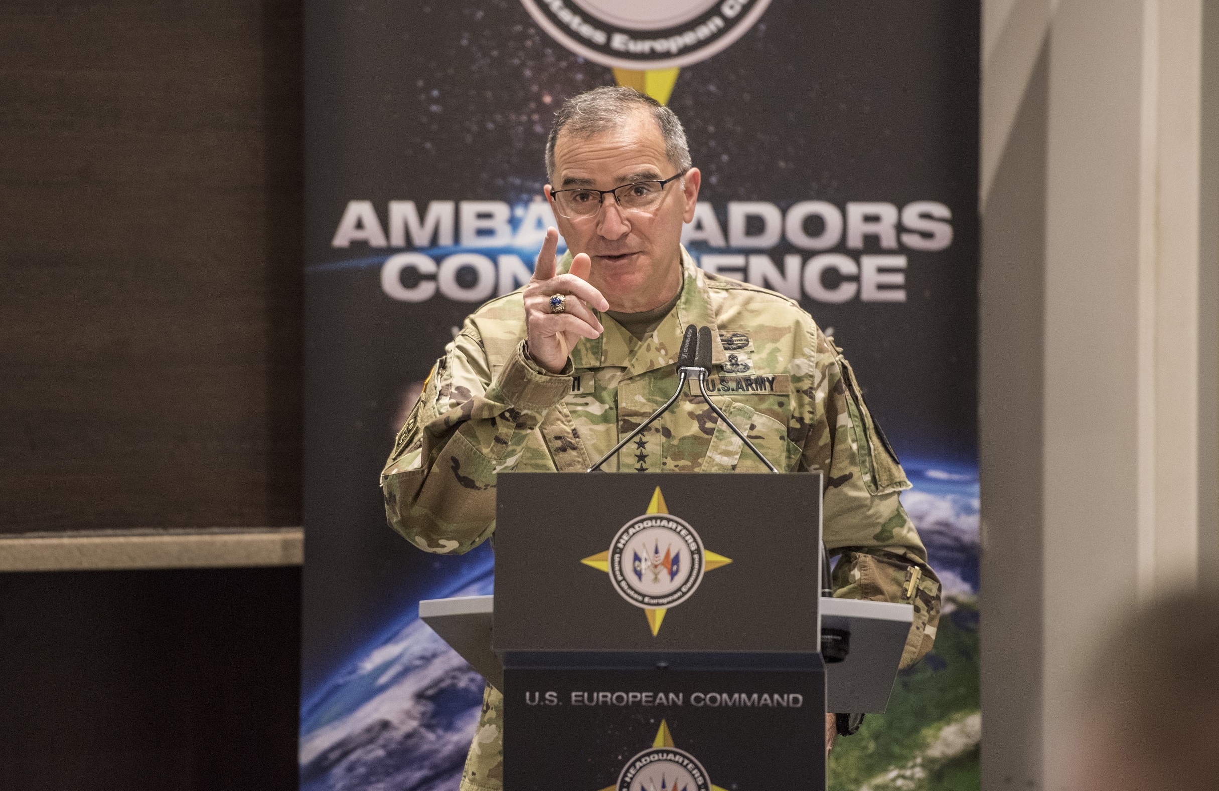 Gen. Curtis M. Scaparrotti, Commander of United States European Command, gives an introduction speech during the Ambassadors Conference held in Wiesbaden, Germany, May 23, 2018.