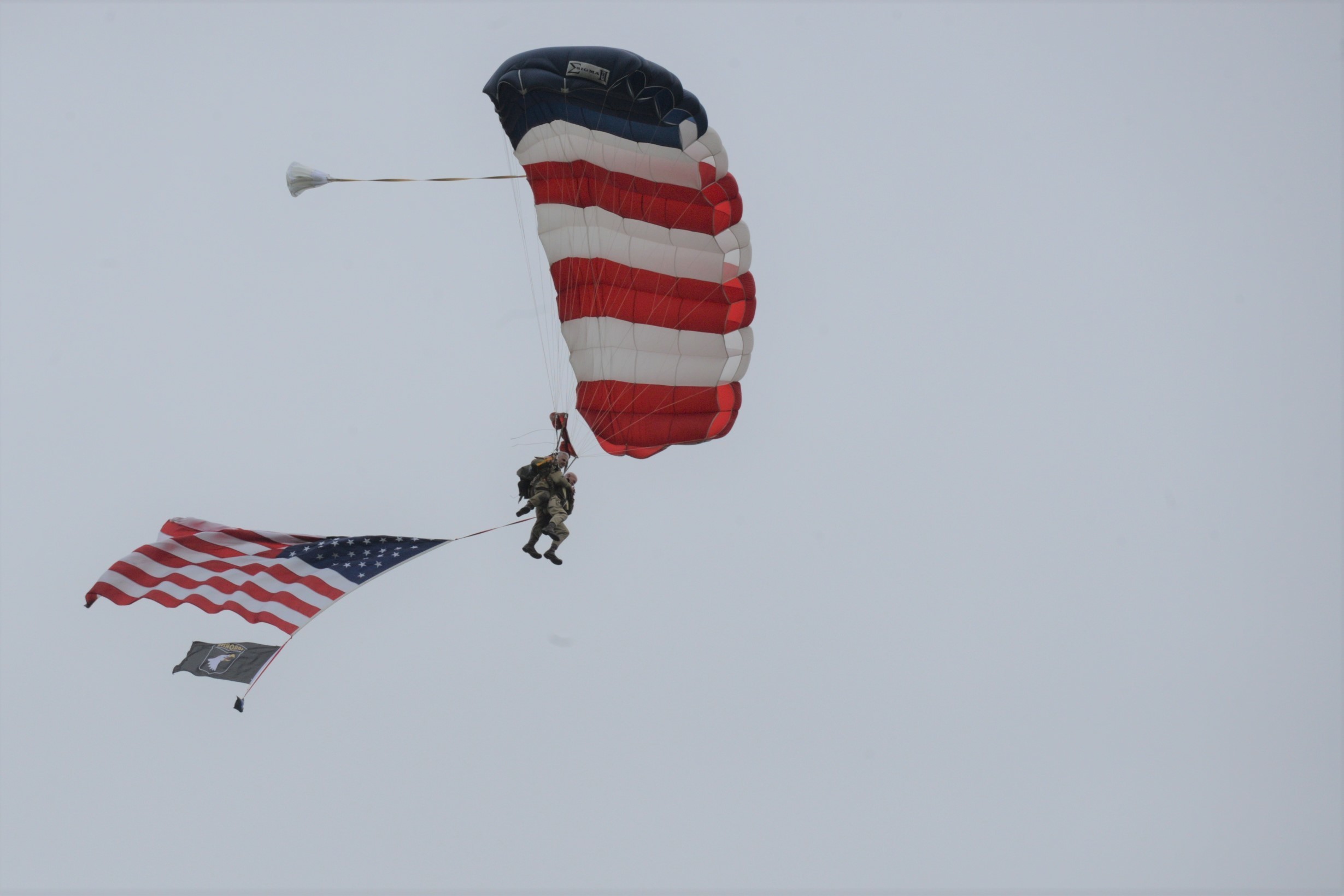 Tom Rice, WWII veteran from the Army's 101st Airborne Division, 501st Parachute Infantry Regiment, jumps out of a C-47, into Carentan, France, June 6, 2019, to recreate his D-Day parachute jump, 75 years ago. Hundreds of parachutists participated in jumps over Normandy June 1-9, recreating airborne operations, U.S. soldiers made on June 6, 1944.