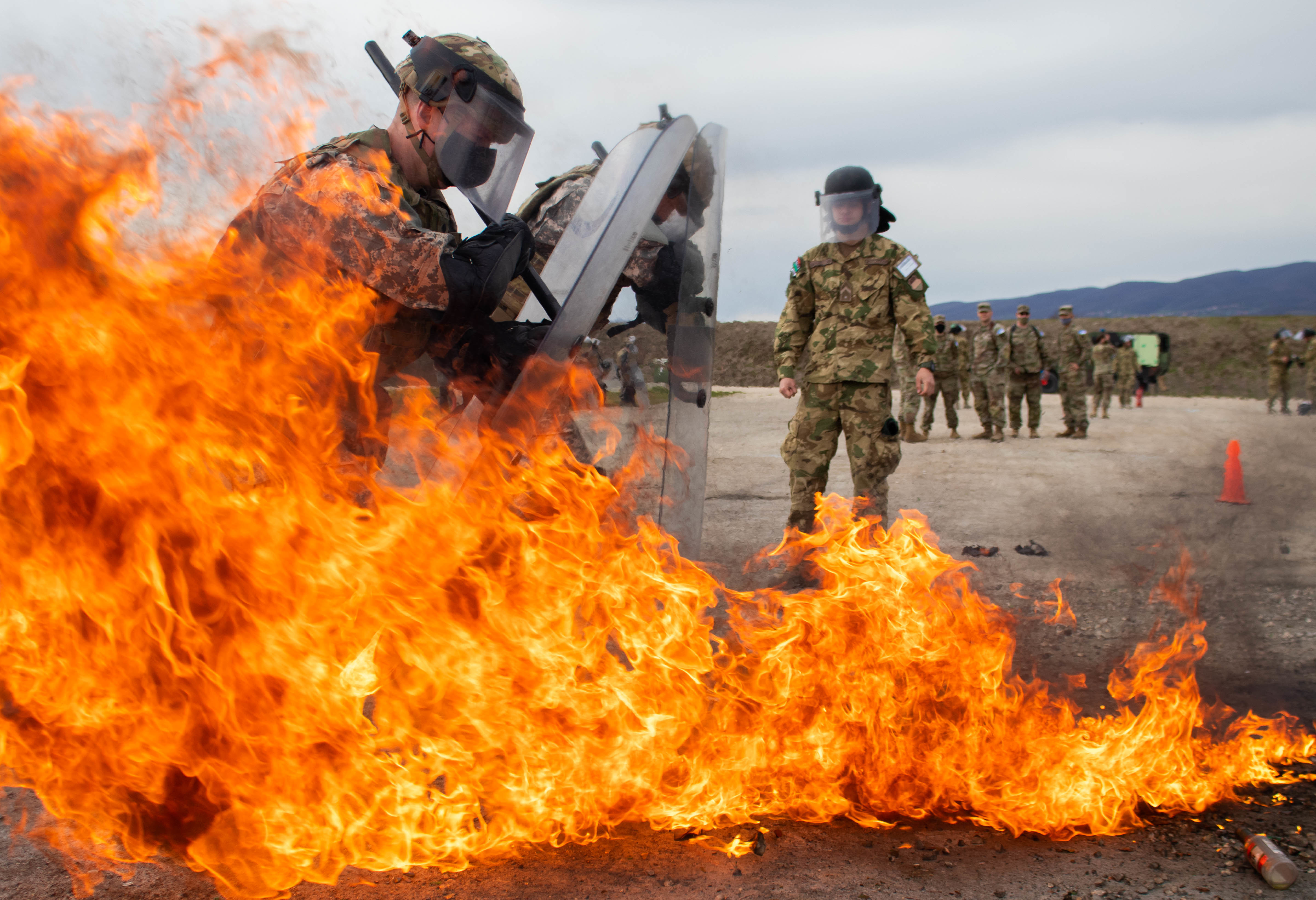 Iowa Army National Guard Soldiers with Troop B, 1st Squadron, 113th Cavalry Regiment, react to flames during fire phobia training at Camp Novo Selo, Kosovo, on April 13, 2021. Troop B is assigned to the Maneuver Battalion for Regional Command-East, Kosovo Force. Hungarian Defense Forces troops provided individual, squad and platoon level instruction on how to prevent injury and maintain structure when faced with fire threats.