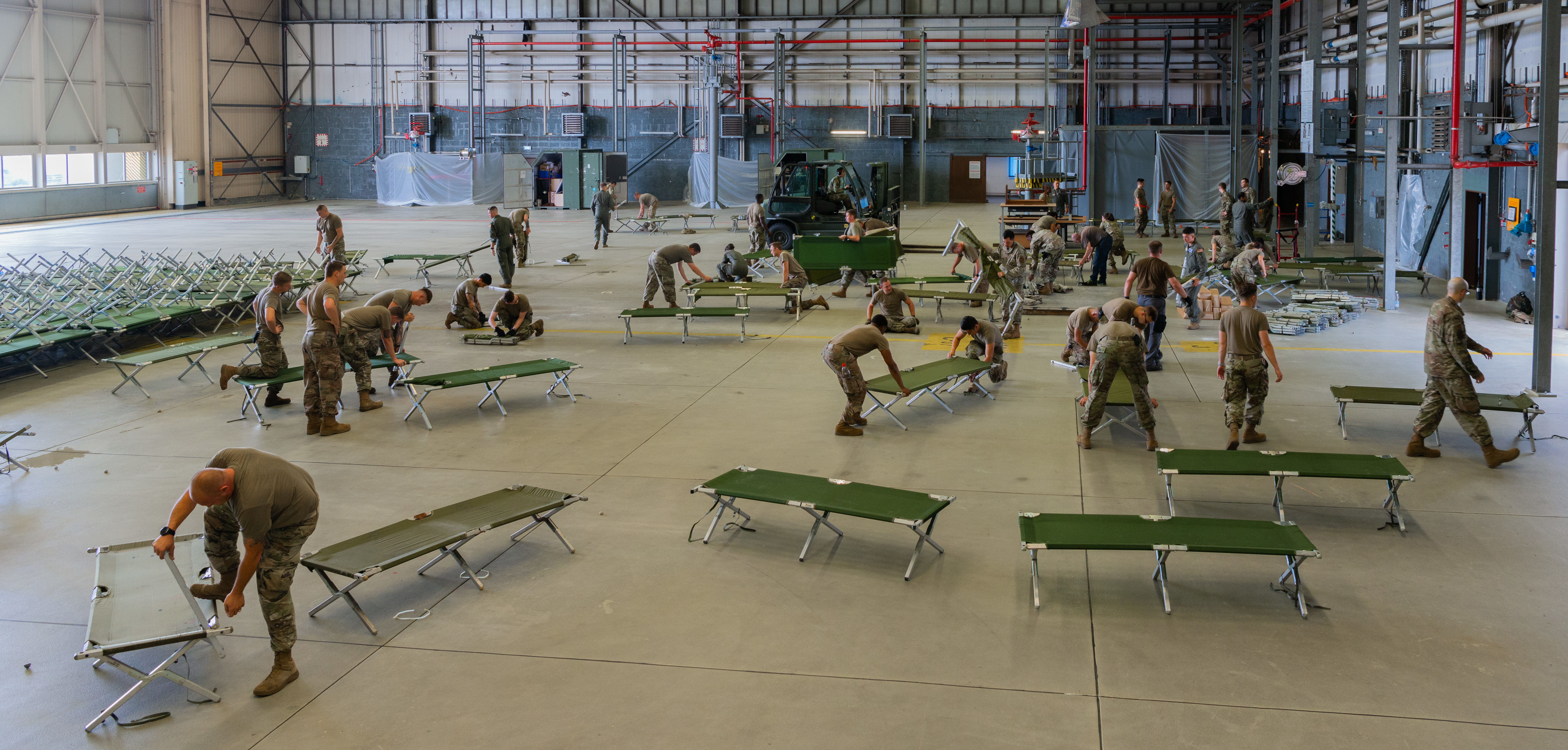 Volunteers assemble additional cots inside a hangar at Ramstein Air Base, Germany, Aug. 21, 2021. Ramstein Air Base is providing safe, temporary lodging for evacuees from Afghanistan as part of Operation Allies Refuge. This operation is facilitating the quick, safe evacuation of U.S. citizens, Special Immigrant Visa applicants, and other at-risk Afghans from Afghanistan. Evacuees will receive support, such as temporary lodging, food and water and access to medical care as well as religious care at Ramstein Air Base while preparing for onward movements to their final destinations. (U.S. Air Force photo by Senior Airman Caleb Kimmell)