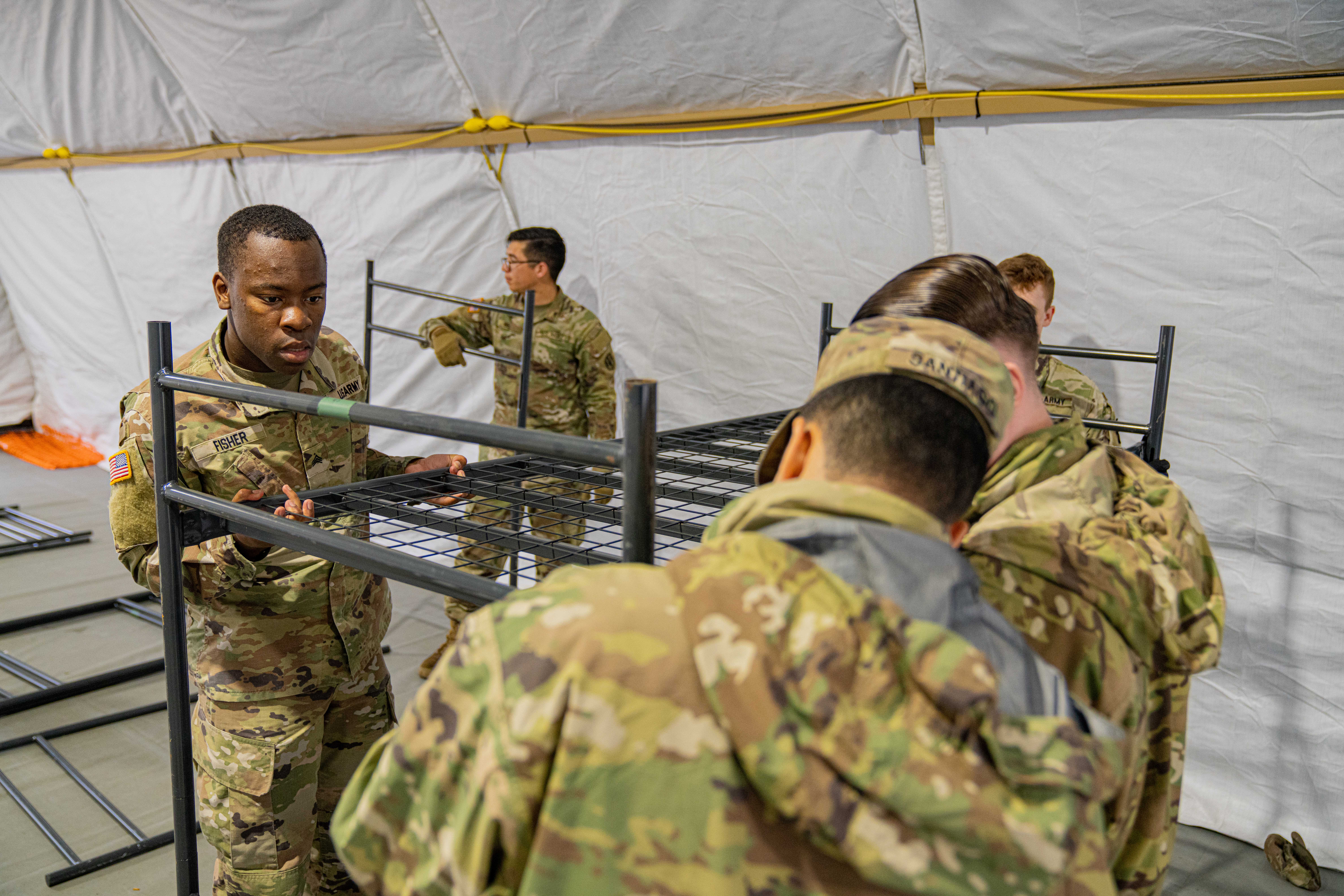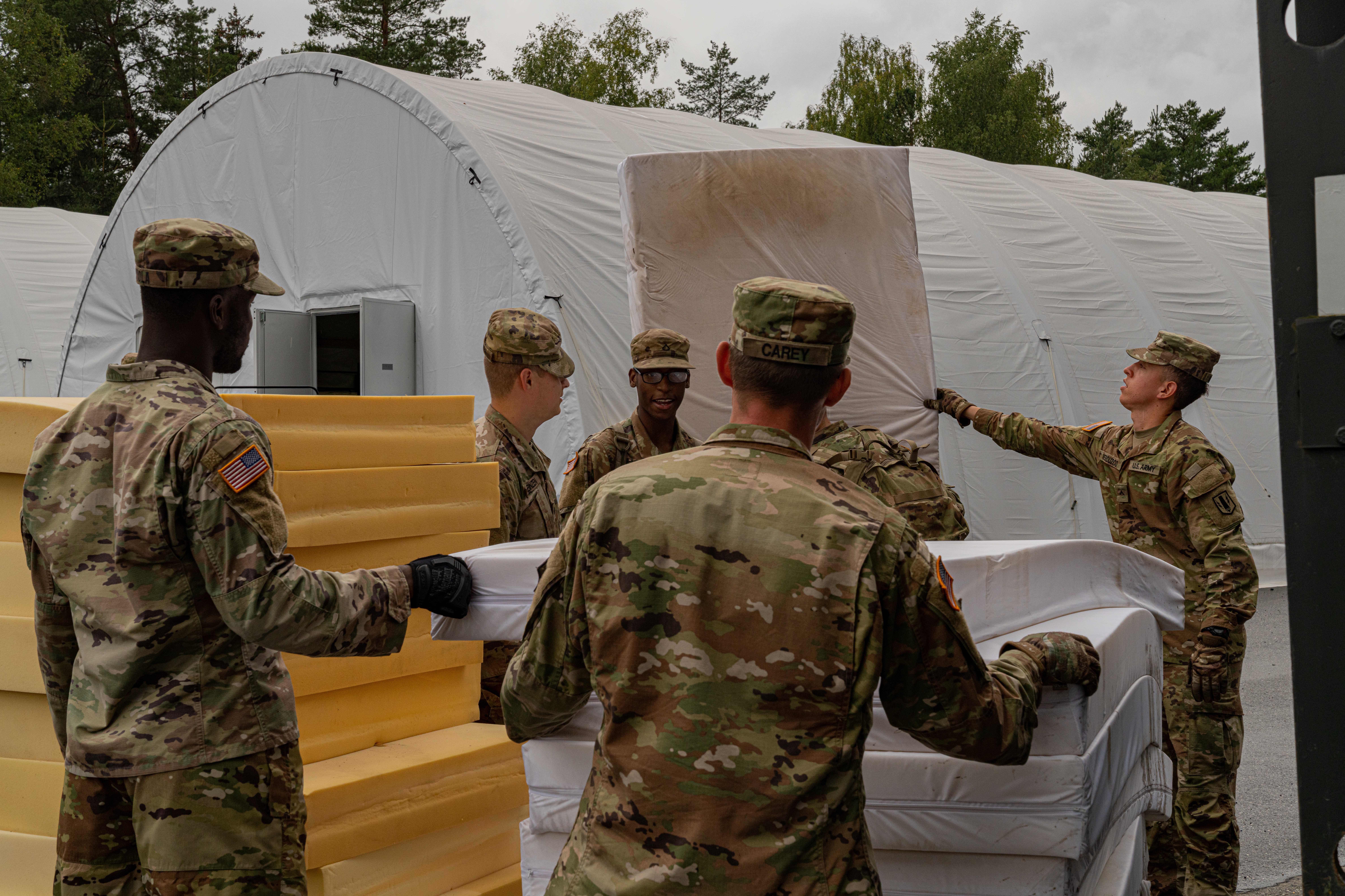 U.S. Army Soldiers assigned to 41st Field Artillery Brigade, 7th Army Training Command, work together to set up cots at Camp Kasserine at Grafenwoehr Training Area, Germany, Aug. 22, 2021. The 7th ATC and the local community rallied to support the possibility of Afghan evacuees temporarily lodging here before their onward movement to a more permanent location. (U.S. Army photo by Staff Sgt. Christopher Stewart)