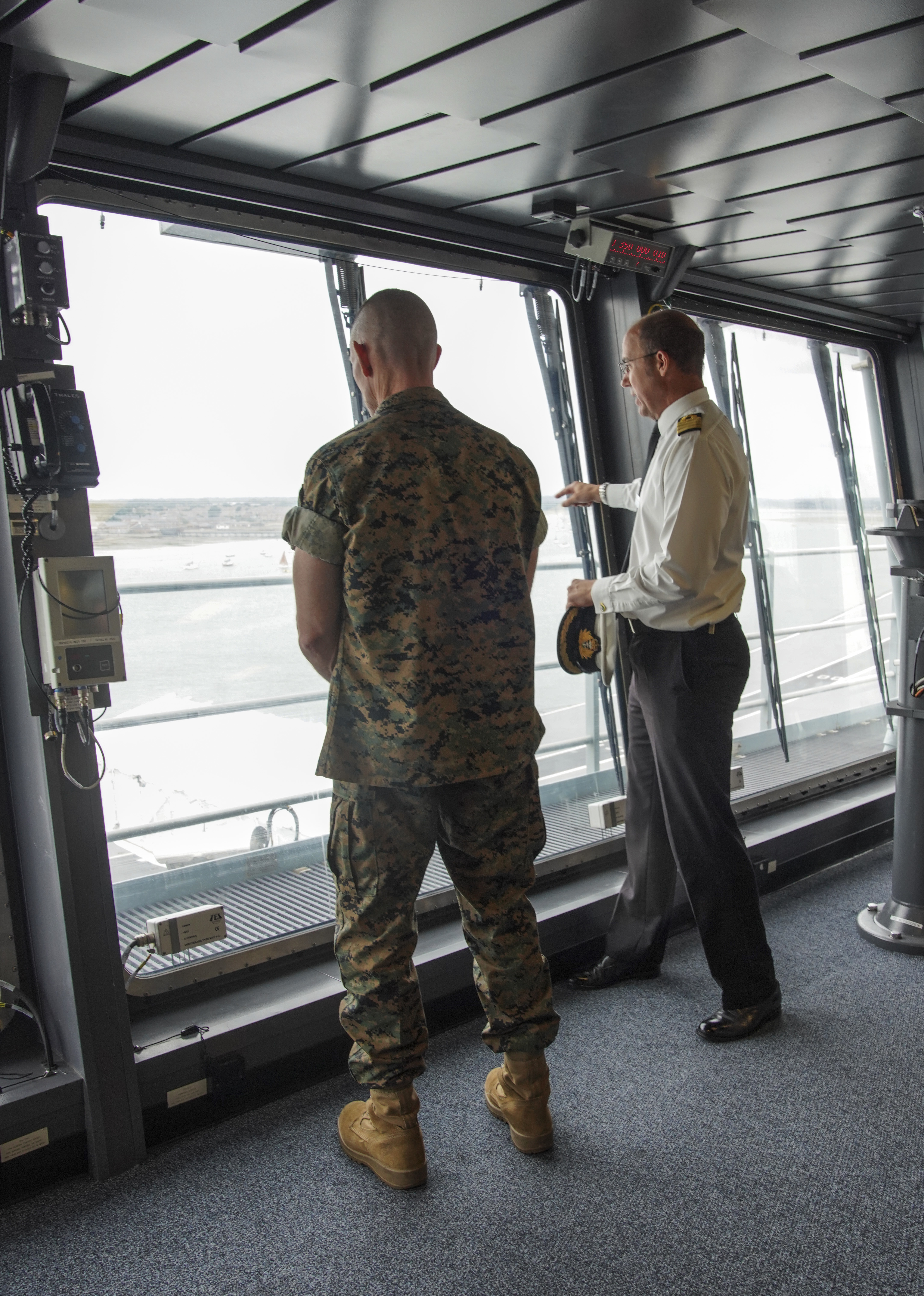 Maj. Gen. Stephen M. Neary, center, commander of U.S. Marine Corps Forces Europe and Africa, visits with members of the UK Royal Navy and Col. Doran, right, the senior U.S. national representative to Carrier Strike Group-21, aboard the HMS QNLZ in Portsmouth, England, August 27, 2020. Maj. Gen. Neary toured the ship to increase understanding of Marine Fighter Attack Squadron (VMFA) 211’s future operations with the UK’s Carrier Strike Group-21 during an upcoming deployment alongside their Royal Navy and Royal Marine Corps counterparts. (U.S. Marine Corps photo by Staff Sgt. Brytani Musick)