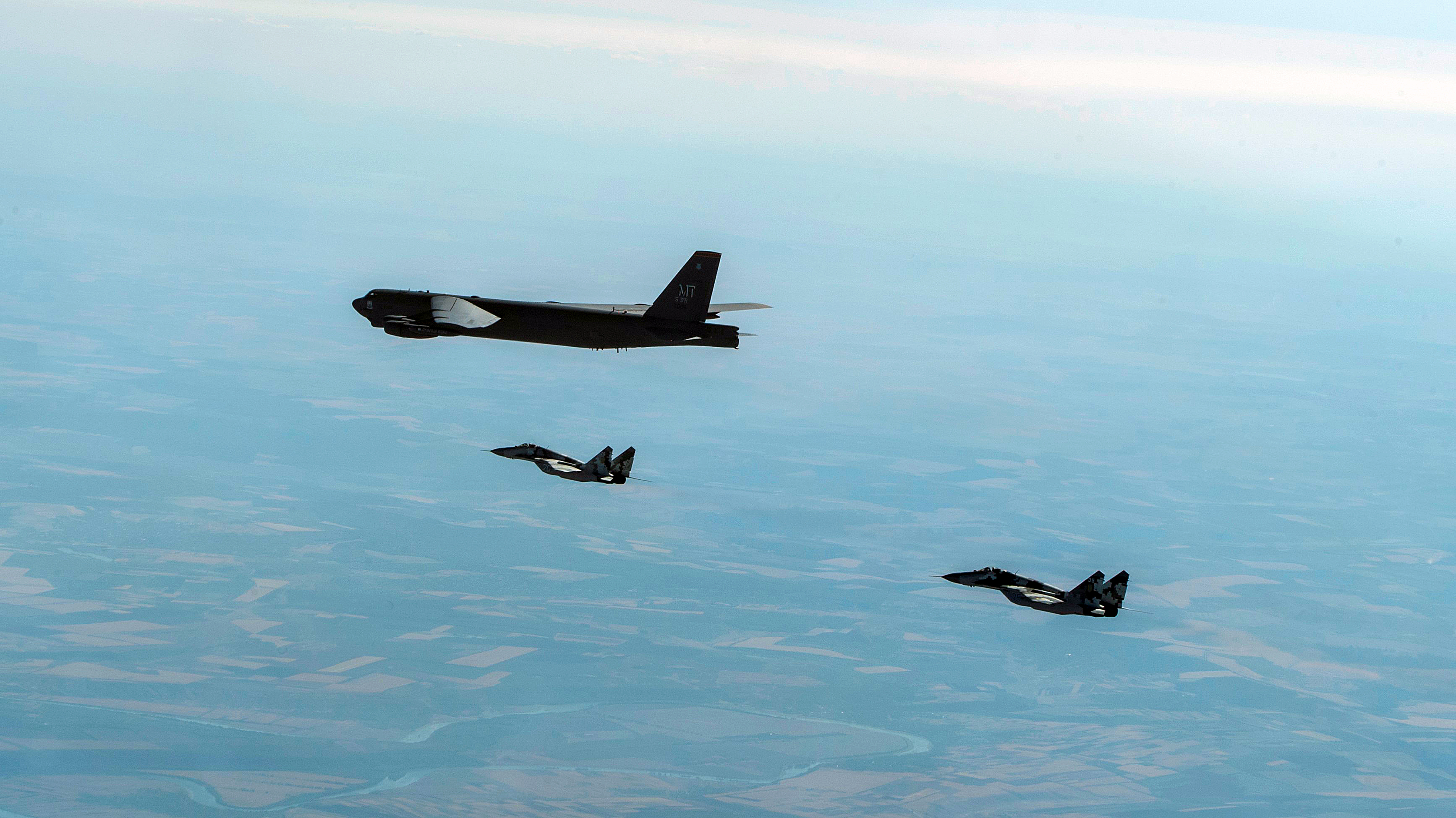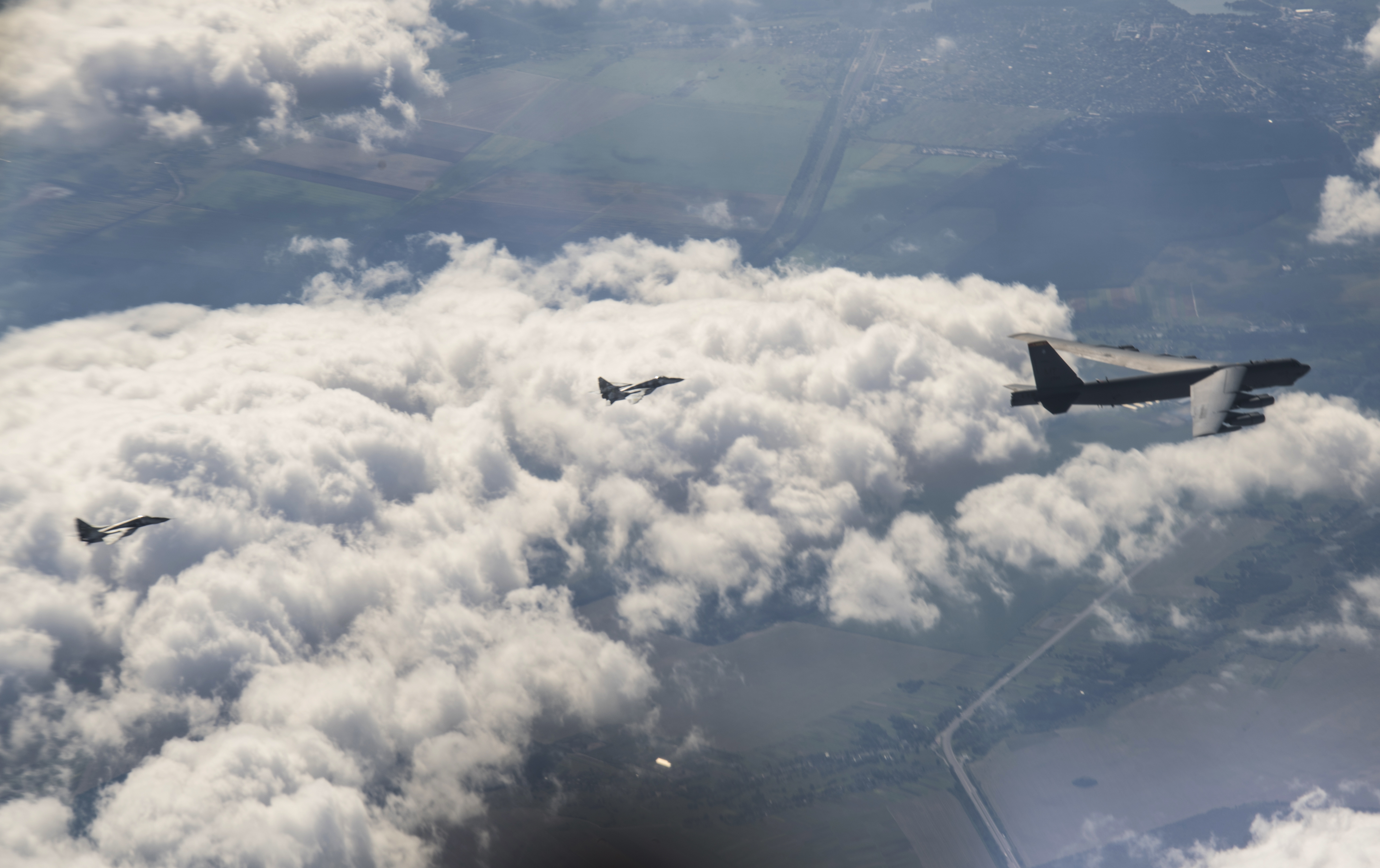 A B-52H Stratofortress, assigned to the 5th Bomb Wing at Minot Air Force Base, North Dakota, is escorted by Ukrainian Air Force aircraft over the Ukraine during a Bomber Task Force Europe Mission Sep 14, 2020. The strategic bomber missions provide theater familiarization for aircrew members and opportunities for U.S. integration with NATO allies and regional partners. (U.S. Air Force photo by Master Sgt. Burt Traynor)