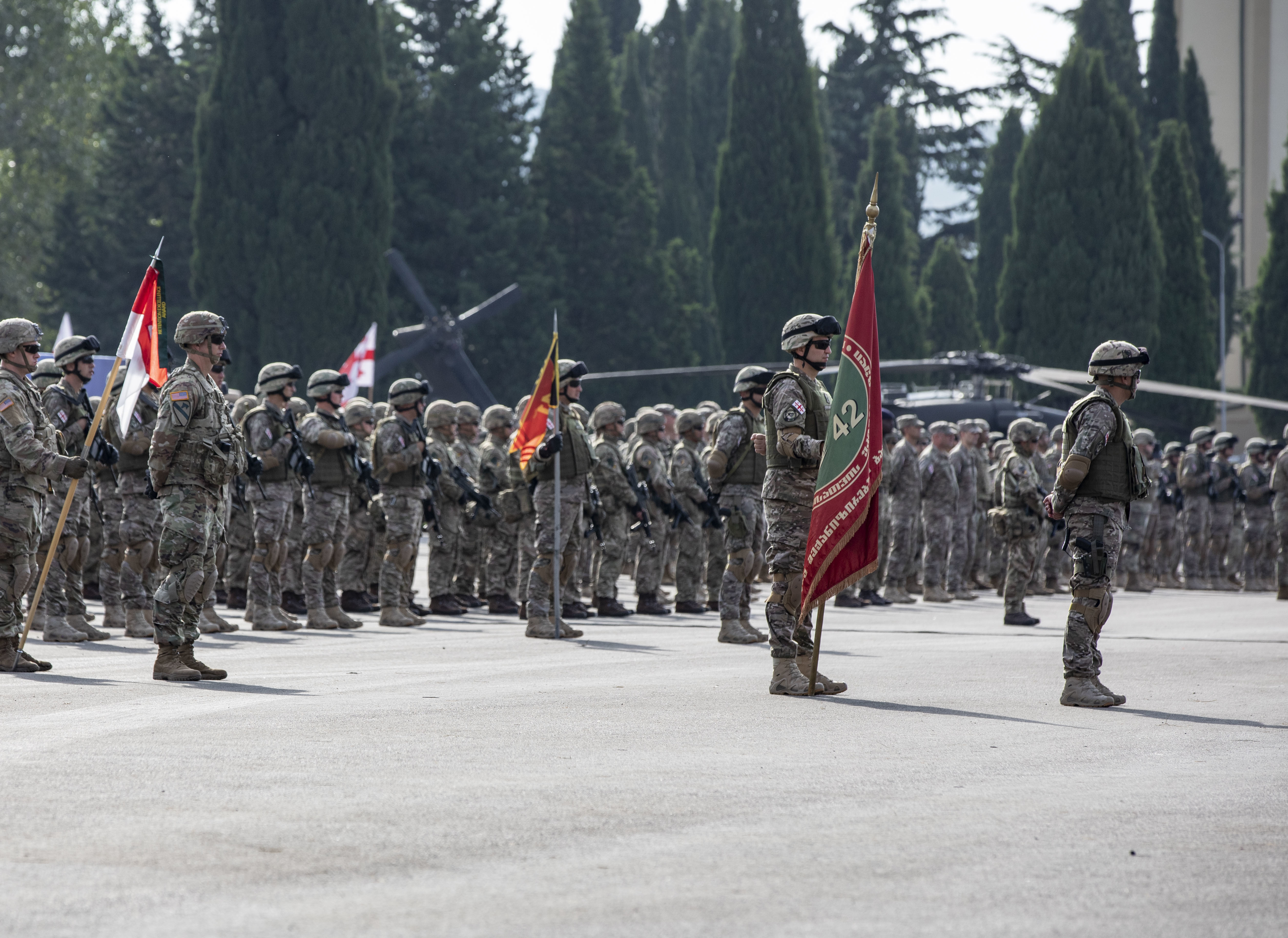Georgian Defense Forces and U.S. Army soldiers participate in the opening ceremony for Noble Partner 20 at Vaziani Training Area, Georgia, Sept. 7, 2020. Noble Partner 20 is a Georgian Defense Force and U.S. Army Europe cooperatively-led exercise hosted at Vaziani and Camp Norio training areas in Georgia designed to enhance Georgian, regional partner, and U.S. force readiness and interoperability in a realistic, multinational training environment.