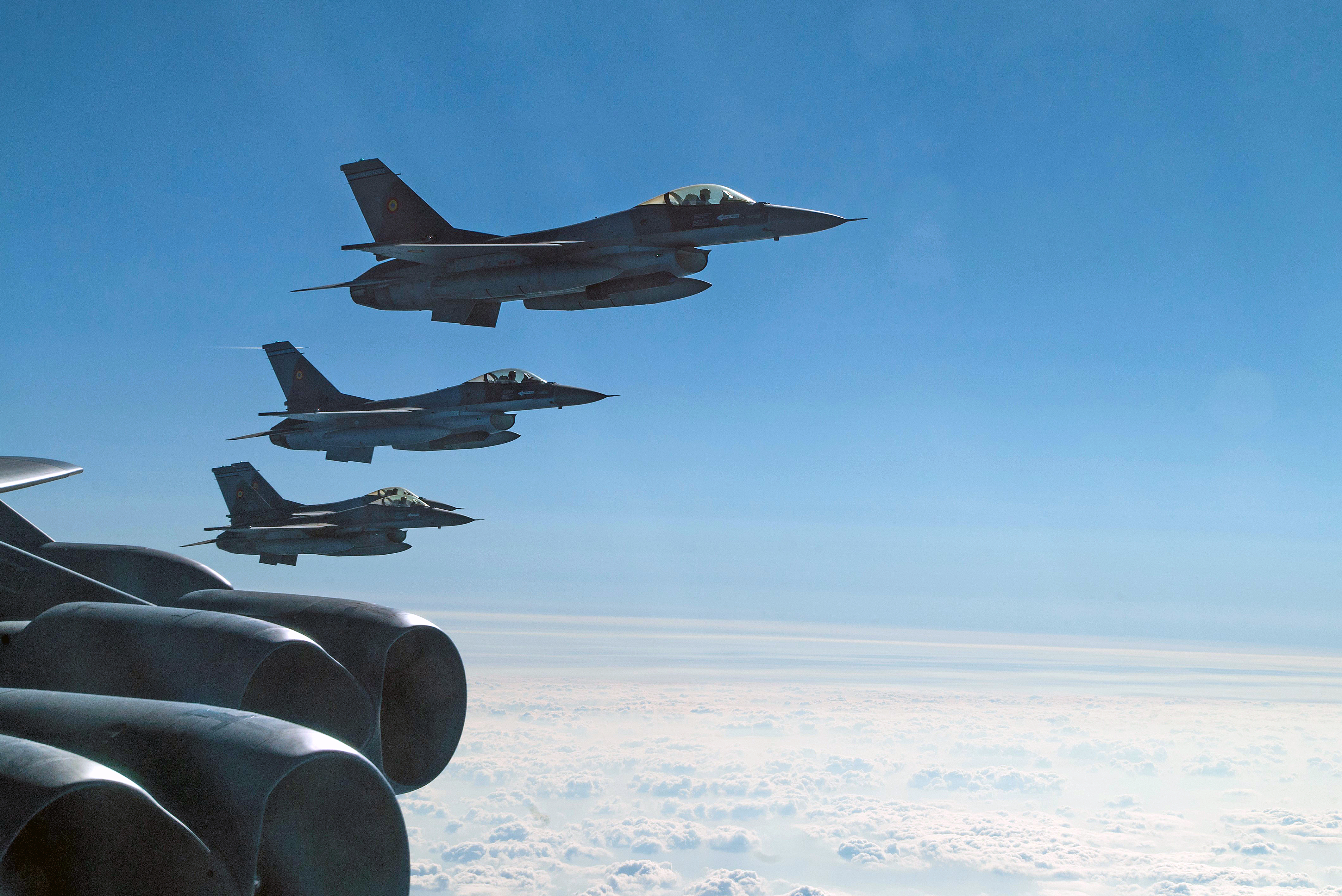 Four Romanian Air Force F-16 aircraft integrate with a B-52H Stratofortress, assigned to the 5th Bomb Wing at Minot Air Force Base, North Dakota, over Romania during a Bomber Task Force Europe Mission on Sep. 14, 2020. The U.S. Air Force is engaged, postured and ready with credible force to assure, deter and defend in an increasingly complex security environment. (U.S. Air Force photo by Master Sgt. Burt Traynor