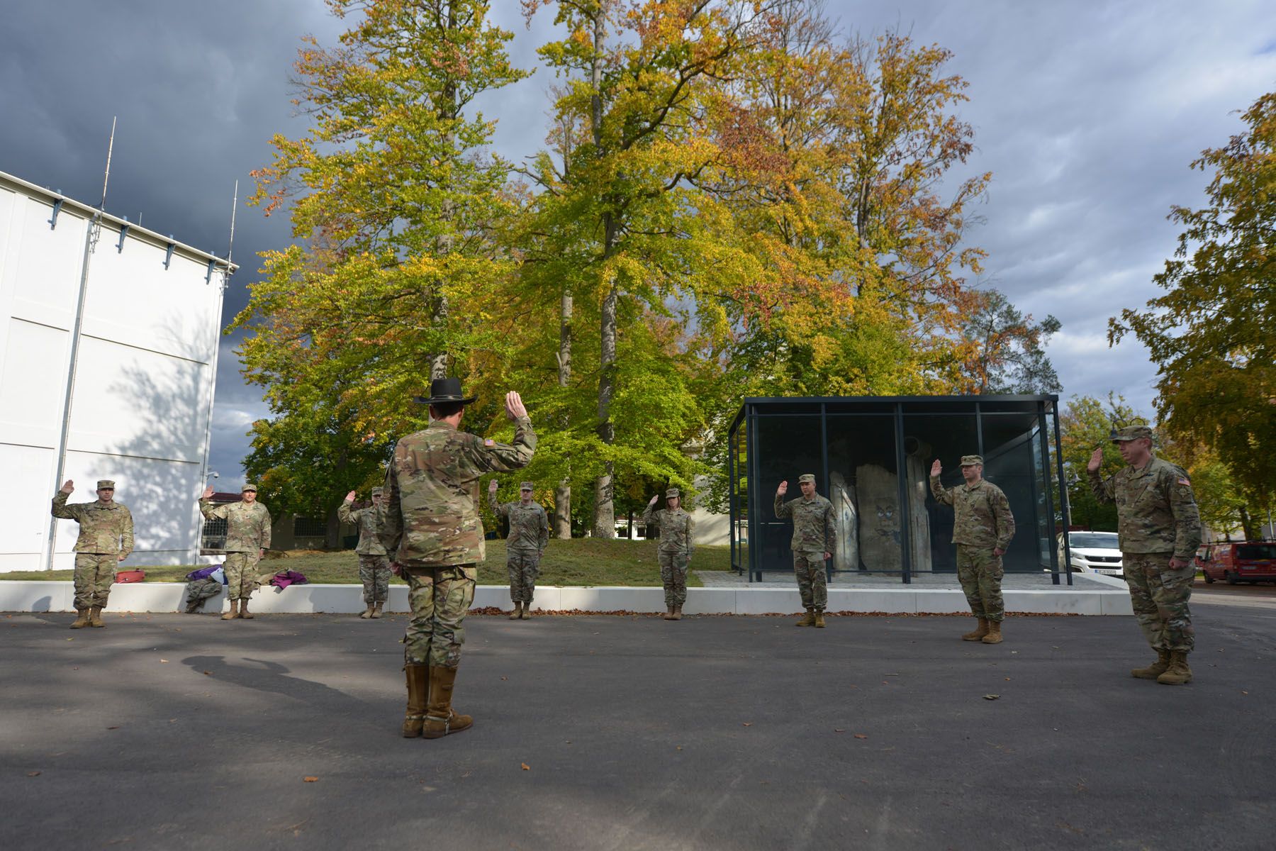 STUTTGART, Germany (Oct. 13, 2020) U.S. Army Col. James Bushong, Director, U.S. Space Command (USSPACECOM) Integrated Planning Element to USEUCOM and NATO, administers the oath of enlistment and oath of office to eight U.S. Air Force service members as they transfer into the U.S. Space Force (USSF). (U.S. Army photo by Visual Information Specialist Jason Johnston)