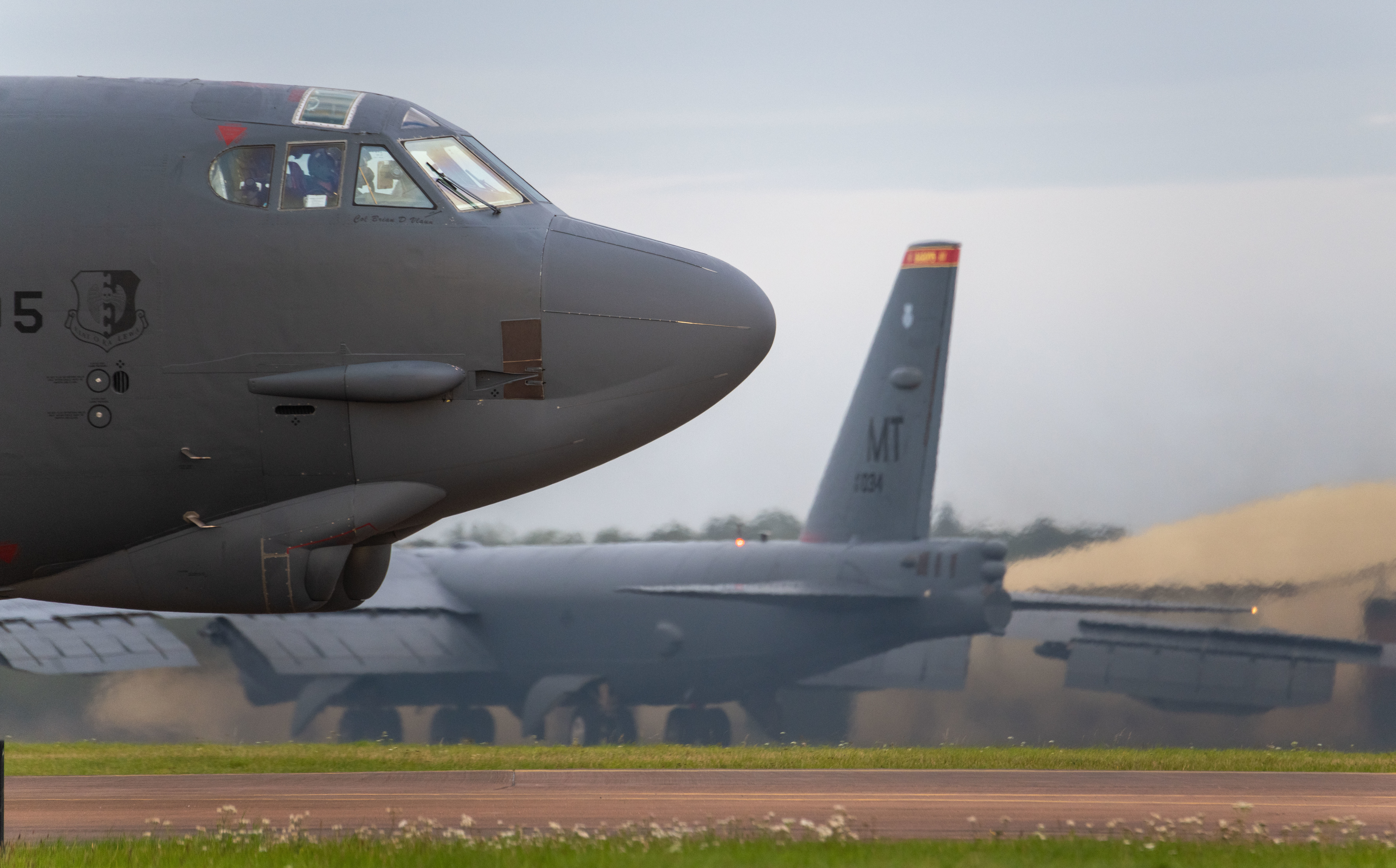 A B-52H Stratofortress assigned to the 5th Bomb Wing, Minot Air Force Base North Dakota, parks on the flightline at RAF Fairford, England, Sept. 4, 2020. Strategic bombers contribute to stability in the European theater, as they are intended to deter conflict rather than instigate it. If called upon, U.S. bombers offer a rapid response capability. (U.S. Air Force photo by Airman 1st Class Jesse Jenny)