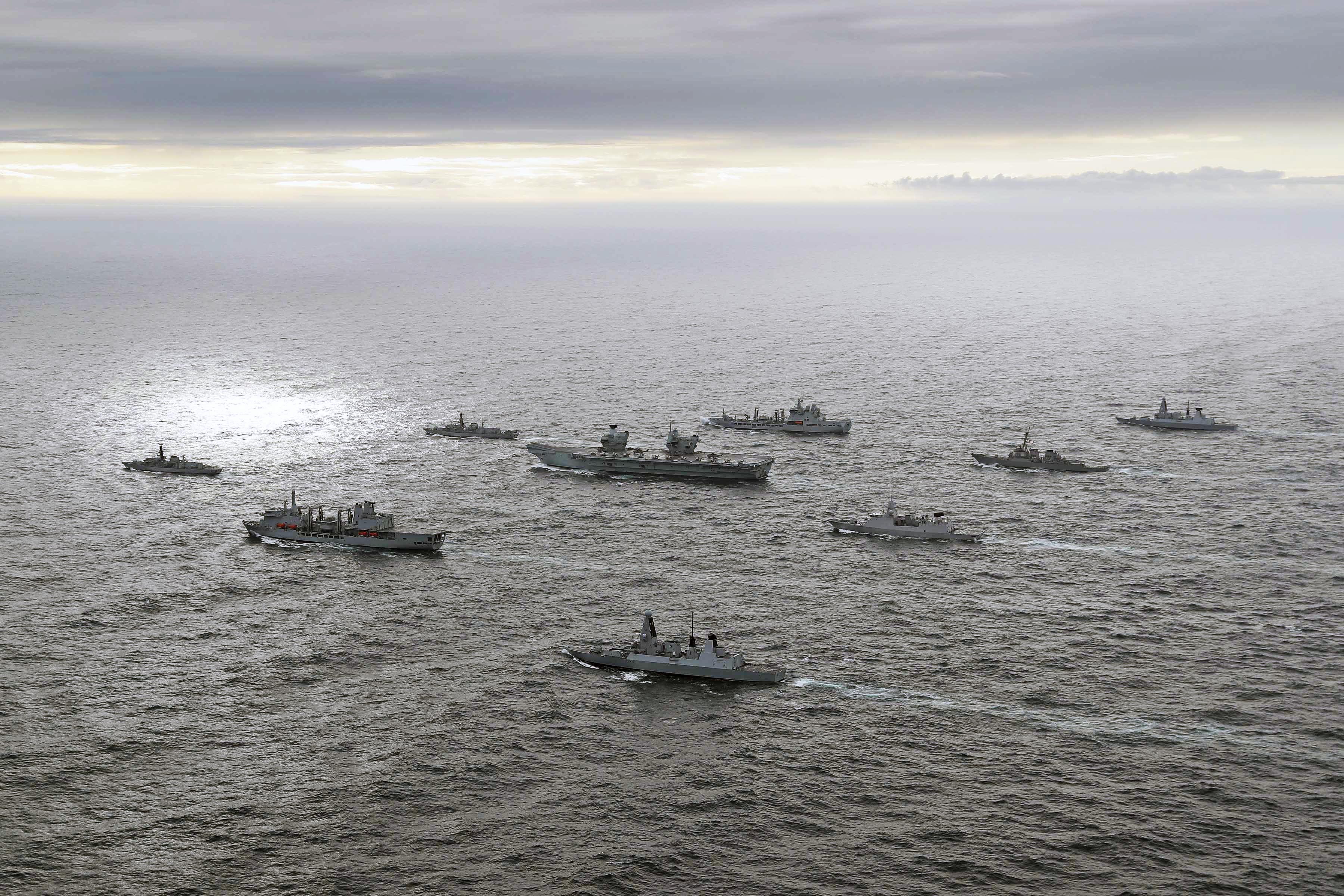 The full United Kingdom (UK) Carrier Strike Group (CSG) assembled at sea on 04 October, 2020. The (CSG) is led by Her Majesty's Ship Queen Elizabeth and includes flotilla of destroyers and frigates from the UK, the Netherlands, the USS The Sullivans, and 15 F-35B Lightning II's from Marine Fighter Attack Squadron 211 and the UK's 617 Squadron. The Navy-Marine Corps team is humbled and proud to represent the United States and serve alongside our United Kingdom counterparts.
