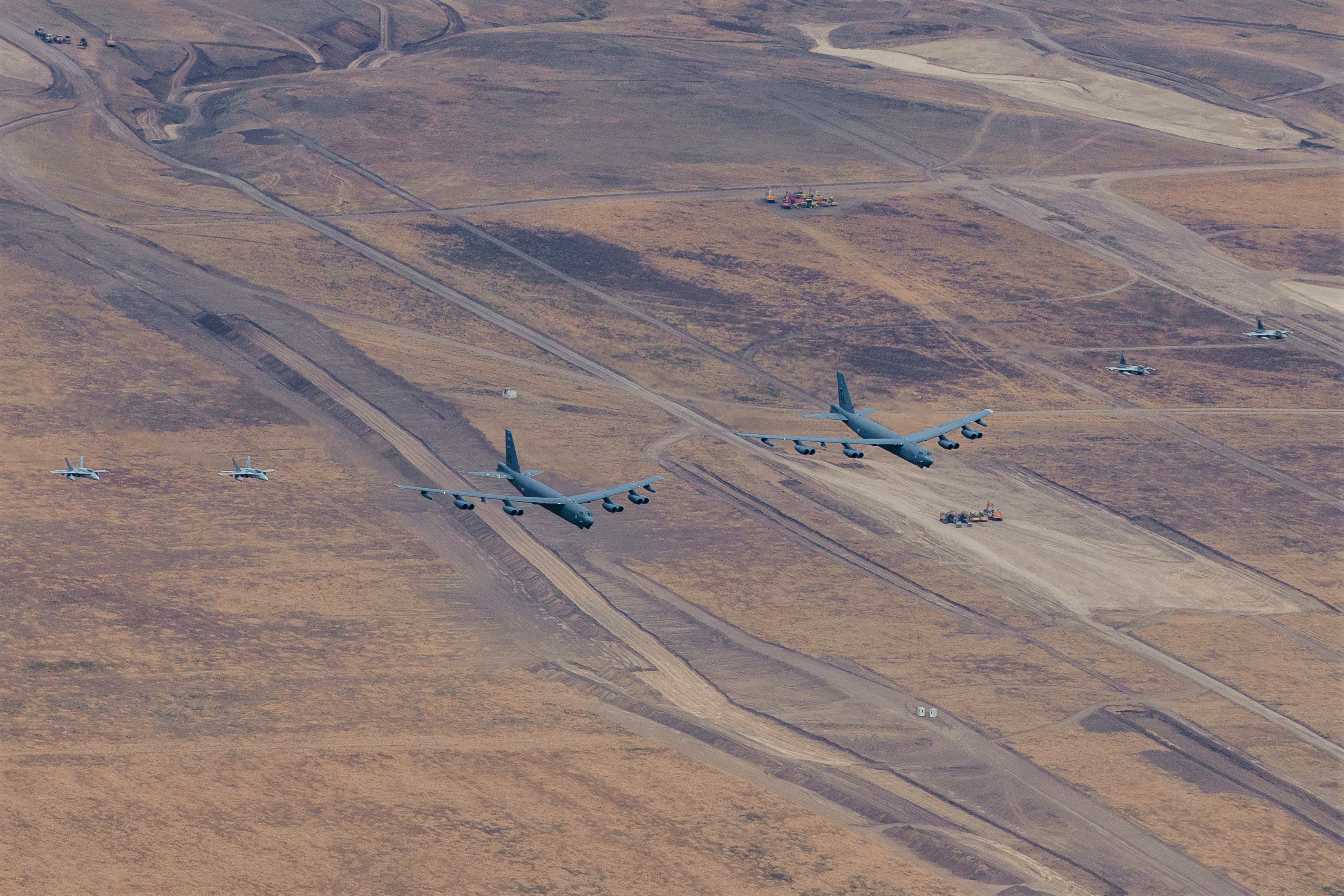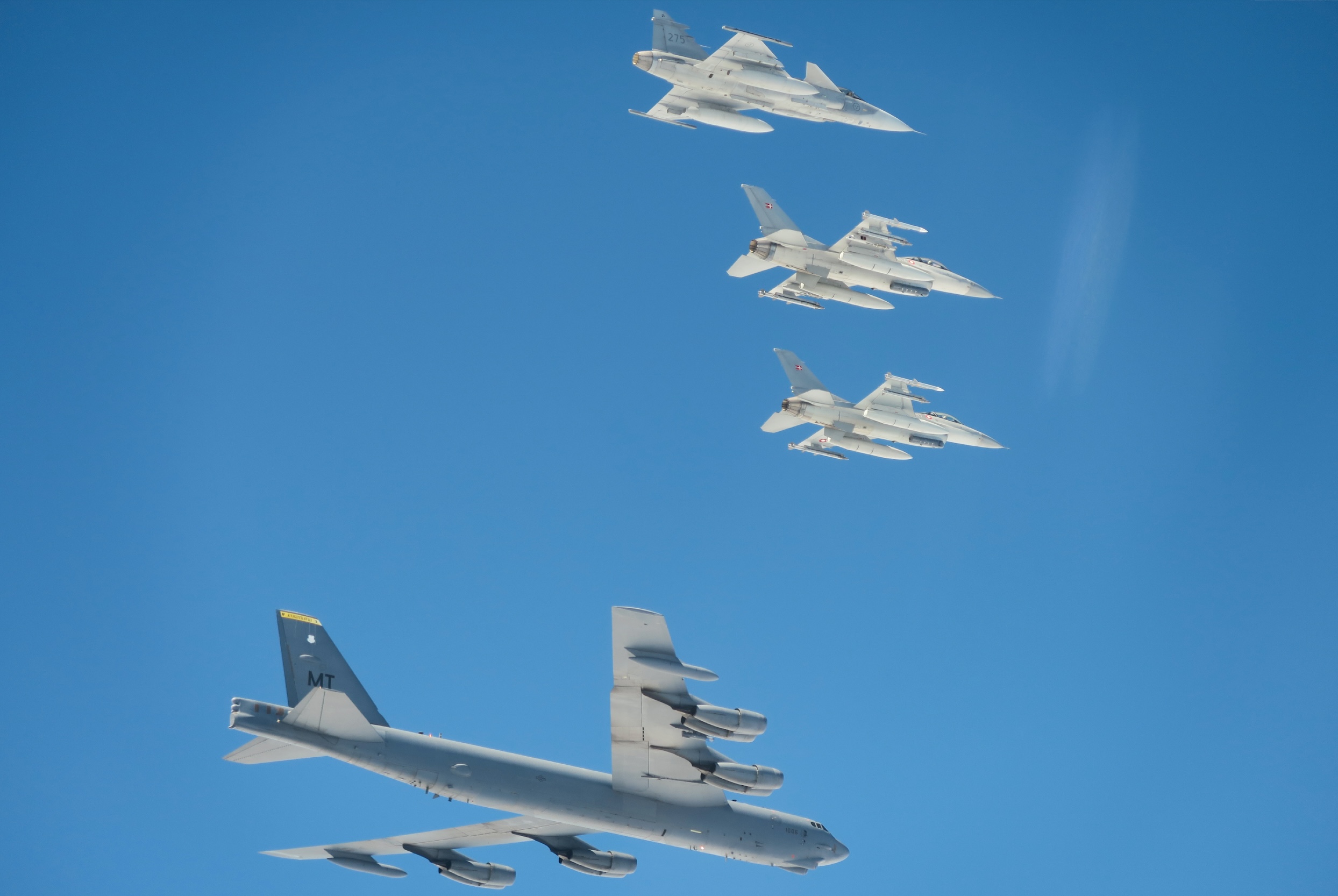 Swedish fighter jets fly alongside a U.S. Air Force B-52 Stratofortress as part of exercise Global Guardian's Bomber Task Force Europe 24-3 deployment, June 20, 2024.