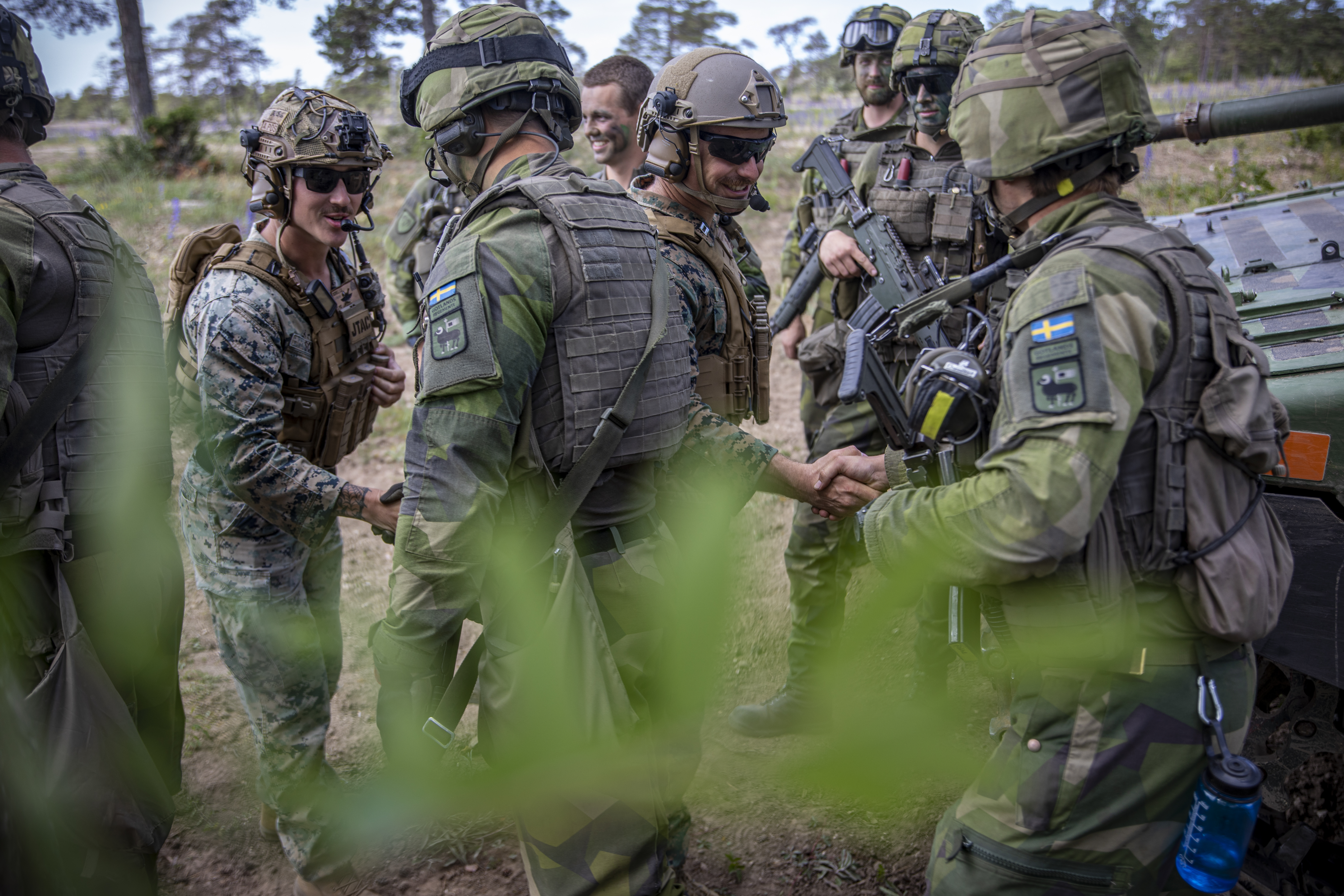 A U.S. Marine with the II Marine Expeditionary Force shakes hands with a Swedish Army soldier with Gotland Regiment's 181st Armored Battalion during exercise Baltic Operations 24 in Gotland, Sweden, June 15, 2024. (U.S. Marine Corps photo by Sgt. Andy O. Martinez)