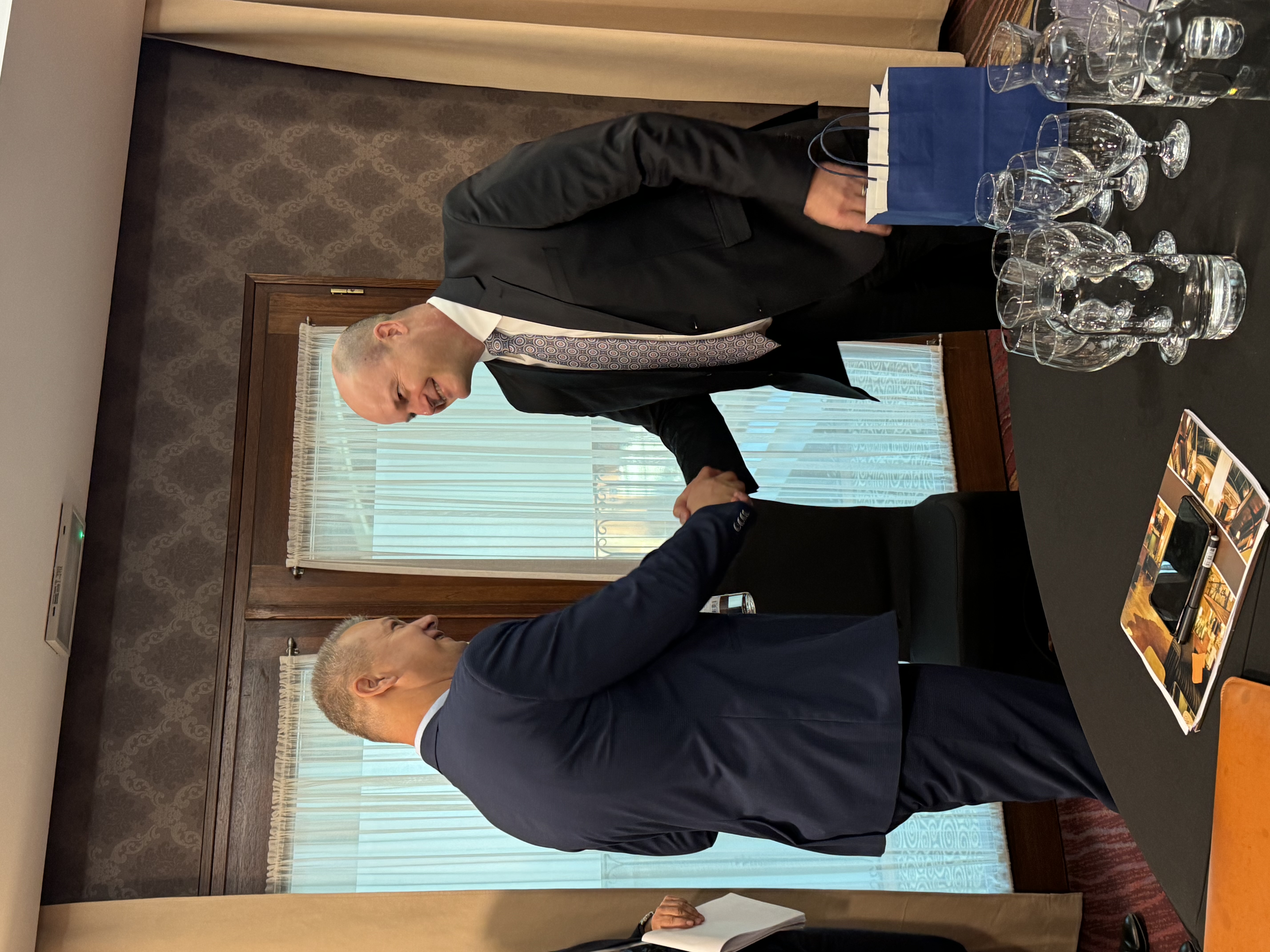 U.S. European Command Staff Judge Advocate U.S. Army Col. Ian Iverson greets Deputy Director of the Ukrainian Ministry of Defense Legal Department Col. Kyrylo Hankevych ahead of a two-week course on operational law held in Poland from July 22 to Aug. 5, 2024. During a key-leader engagement following his remarks, Iverson and Ukrainian counterparts discussed future legal training and exchange opportunities between the U.S. and the UAF to further inform one another's knowledge in a rapidly evolving battlespace.