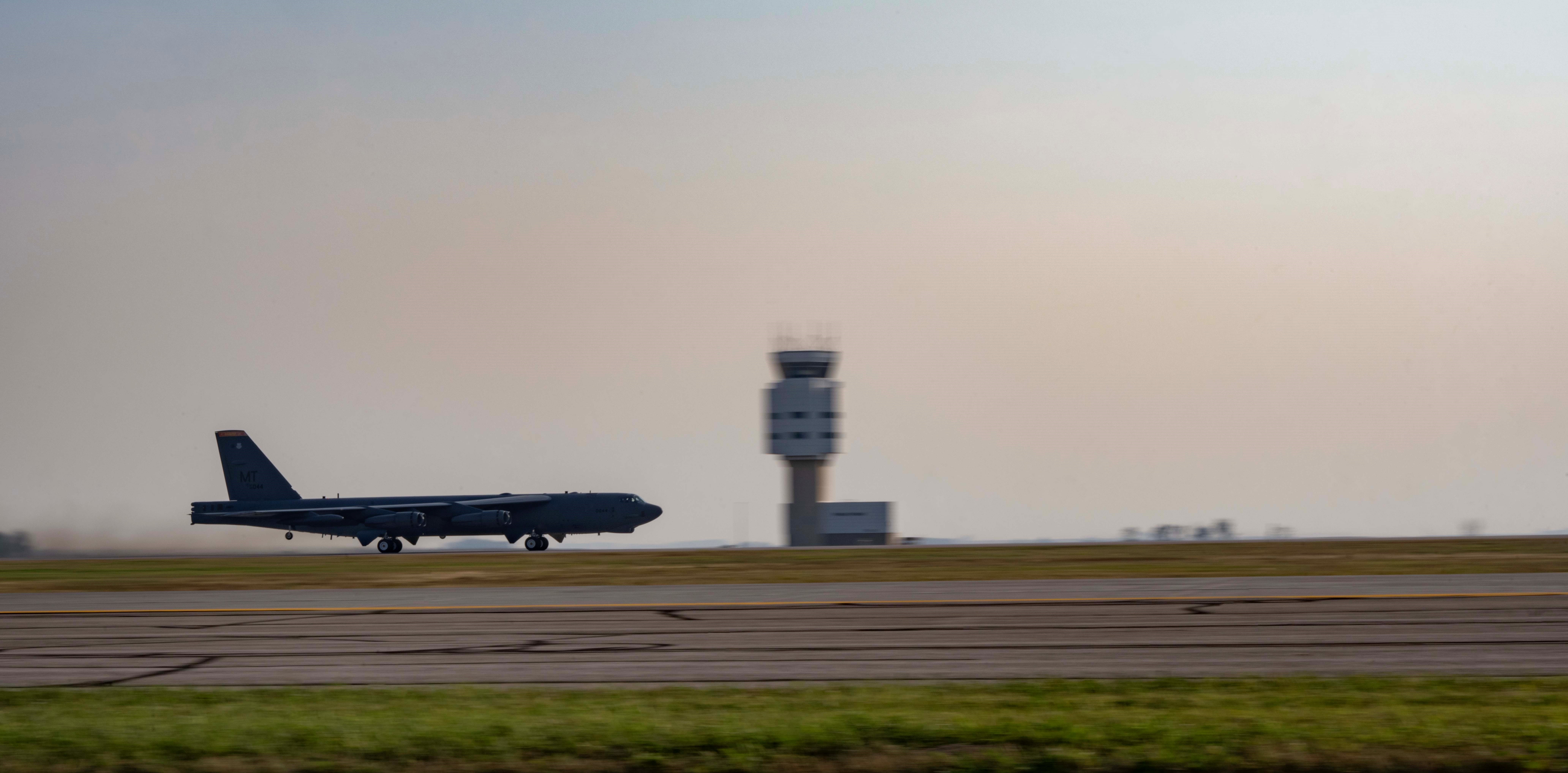 A U.S. Air Force B-52H Stratofortress, assigned to the 23rd Bomb Squadron, passes the air traffic control tower during takeoff for a Bomber Task Force mission from Minot Air Force Base, N.D., Sept. 10, 2024. Bomber Task Force missions enable joint and Allied training, demonstrating the readiness of the U.S. and its Allies to respond to any incident at any time.