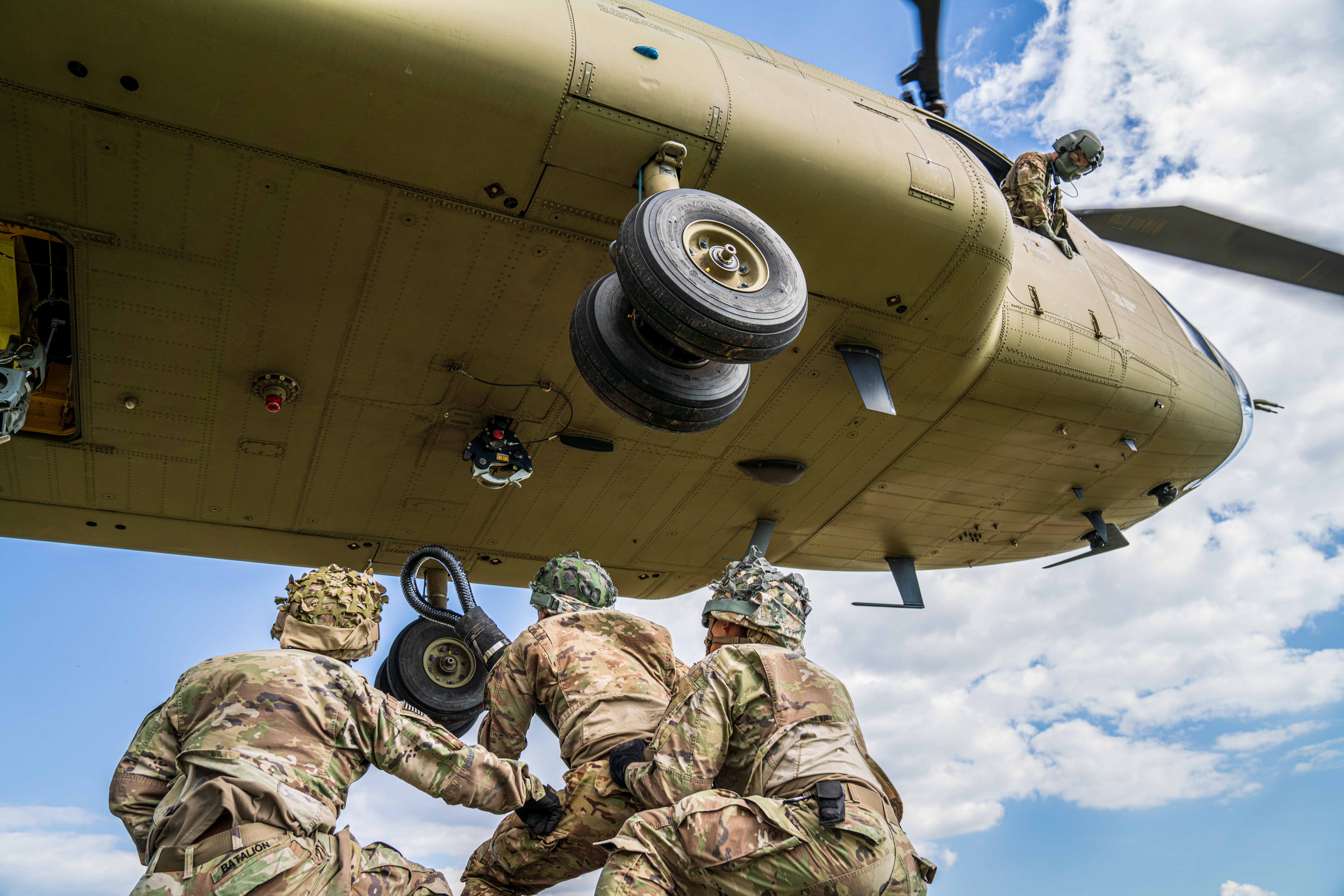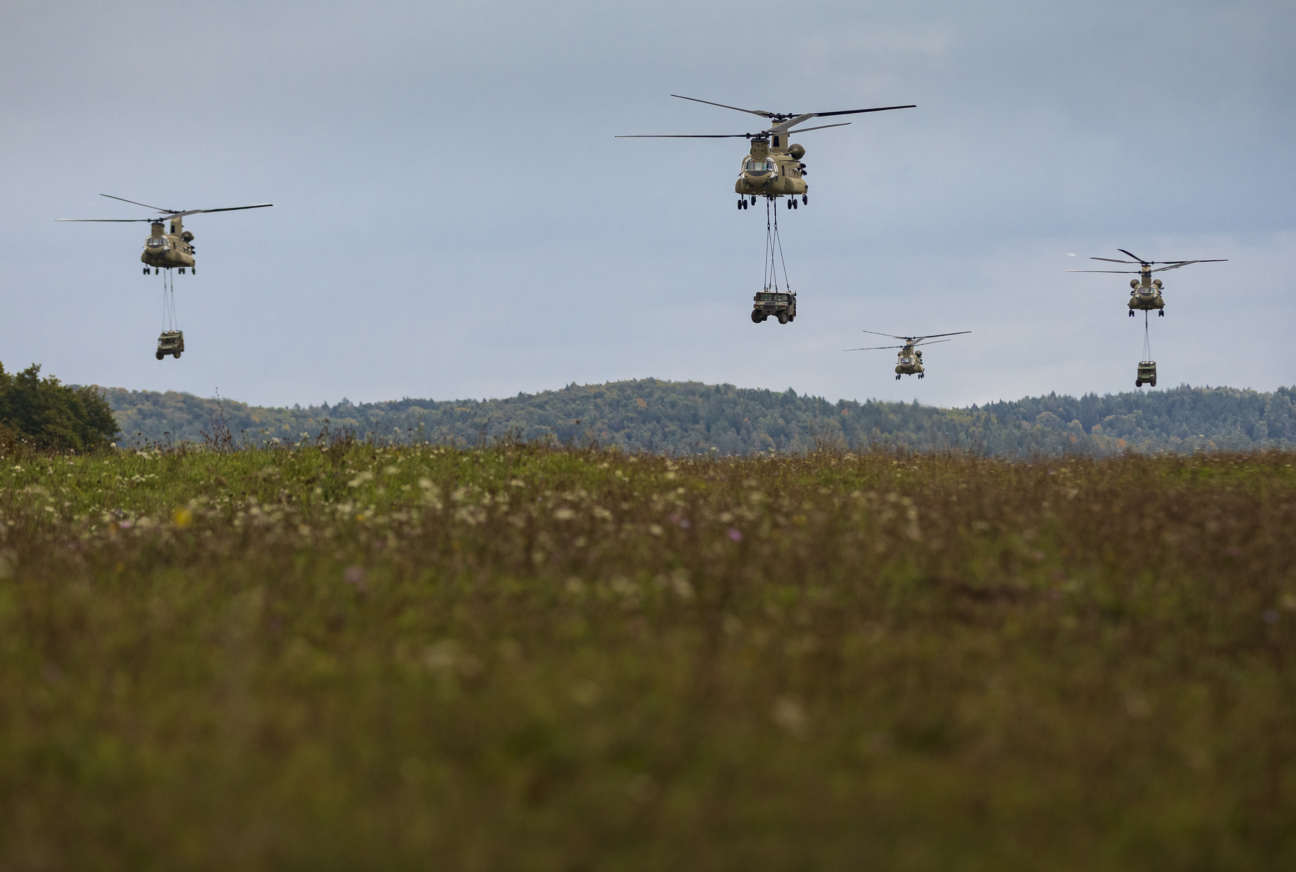 CH-47 Chinook helicopters belonging to the 1st Combat Aviation Brigade transport vehicles as part of an air assault mission, during Saber Junction 19 (SJ19), at the Joint Multinational Readiness Center in Hohenfels, Germany Sept. 26, 2019. SJ19 is an exercise involving nearly 5,400 participants from 16 ally and partner nations at the U.S. Army's Grafenwoehr and Hohenfels Training Areas, Sept. 3 to 30 Sept. 2019. SJ19 is designed to assess the readiness of the U.S. Army's 173rd Infantry Airborne Brigade to execute land operations in a joint, combined environment and to promote interoperability with participating allies and partner nations. (U.S. Army photo by Sgt. Thomas Mort)