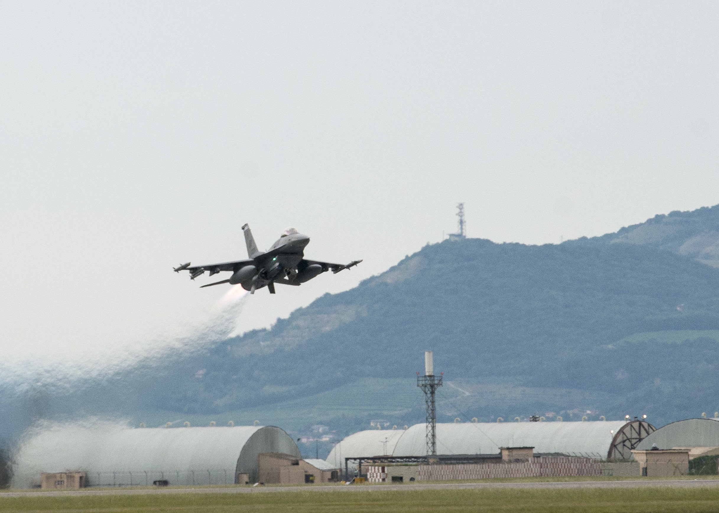 A U.S. Air Force F-16 Fighting Falcon assigned to the 510th Fighter Squadron takes off from Aviano Air Base, Italy, July 22, 2020. The F-16 flew operations over the Black Sea integrating with assets across all domains demonstrating the ability of U.S. forces to operate within international boundaries in the Black Sea. (U.S. Air Force photo by Staff Sgt. Valerie Halbert)