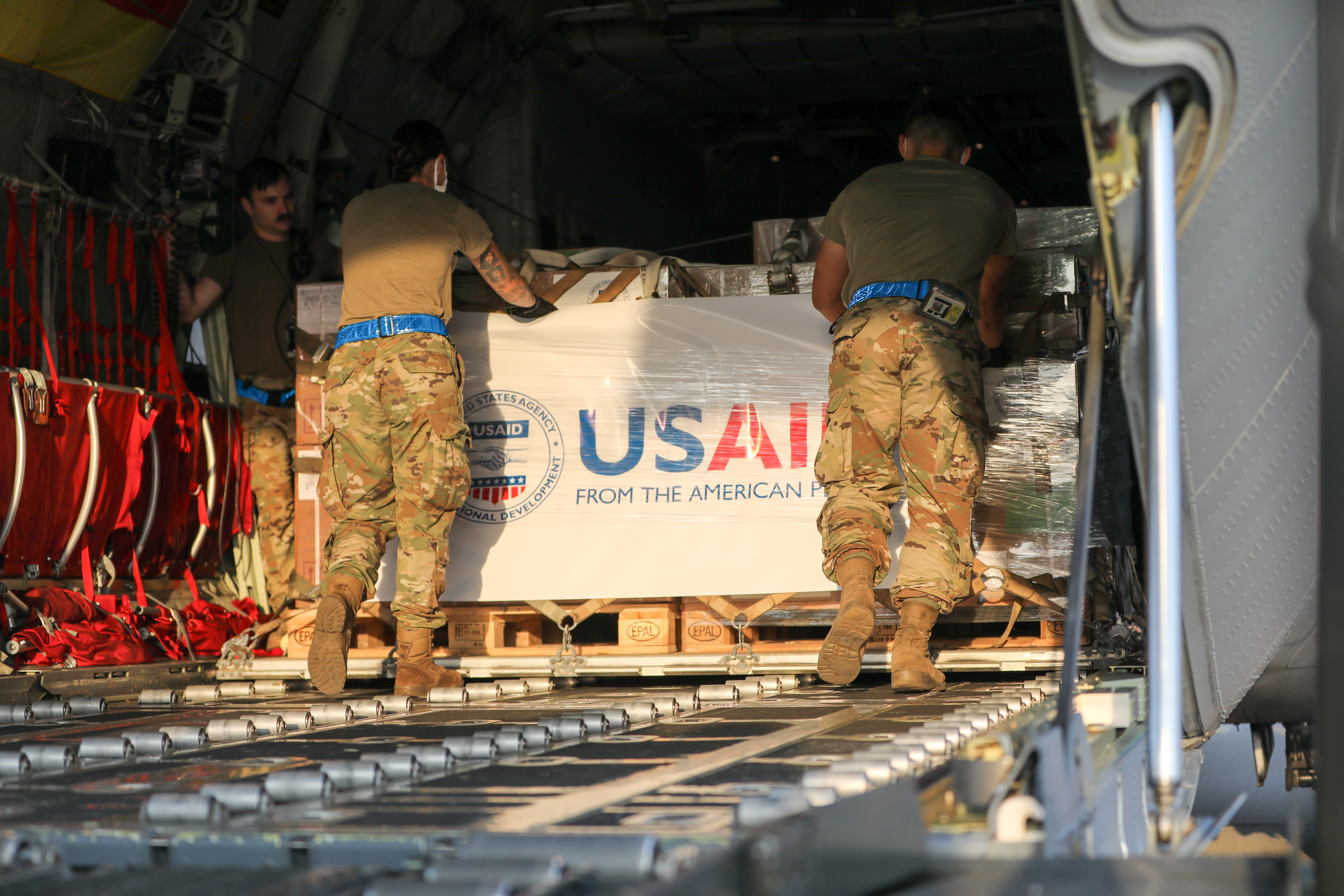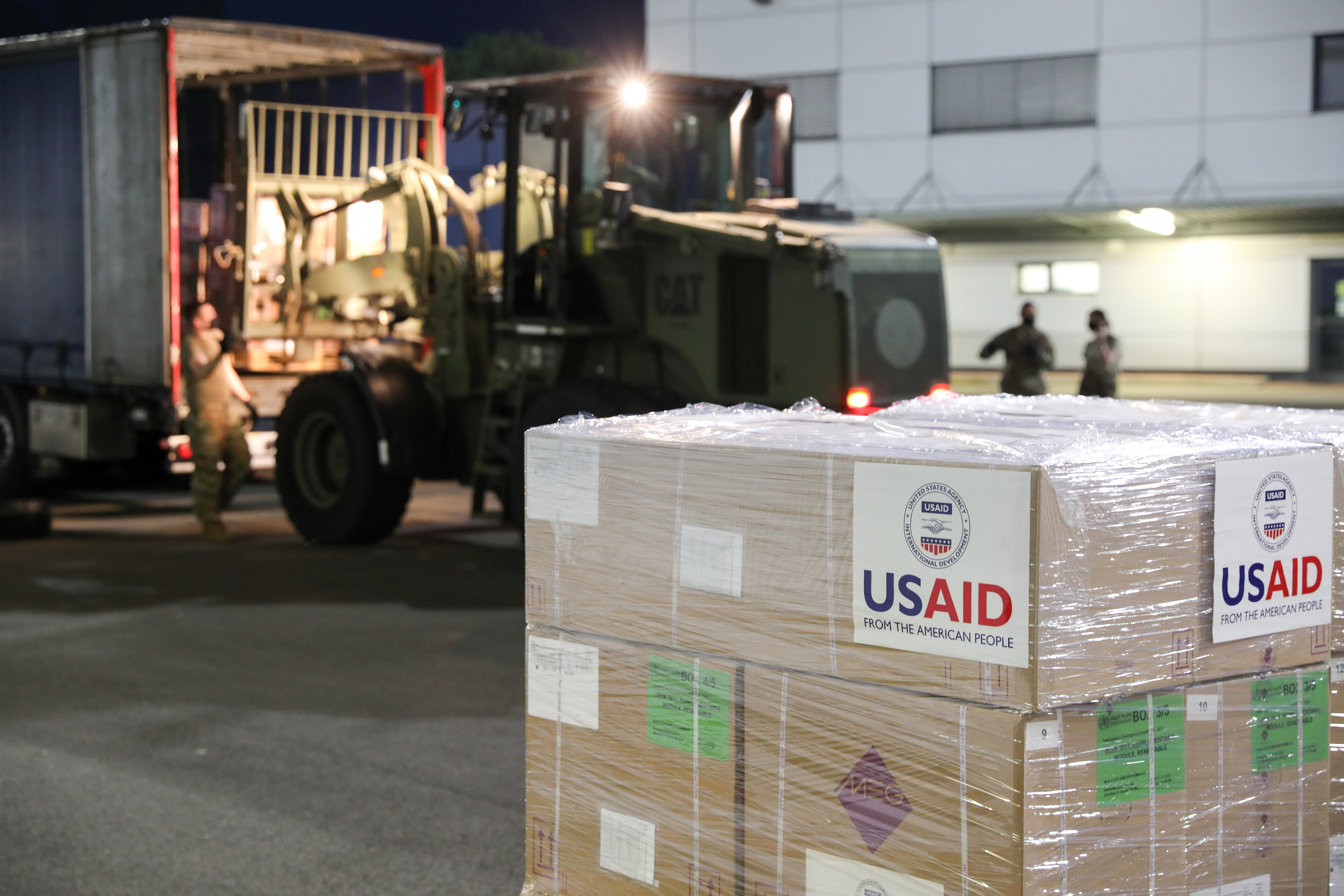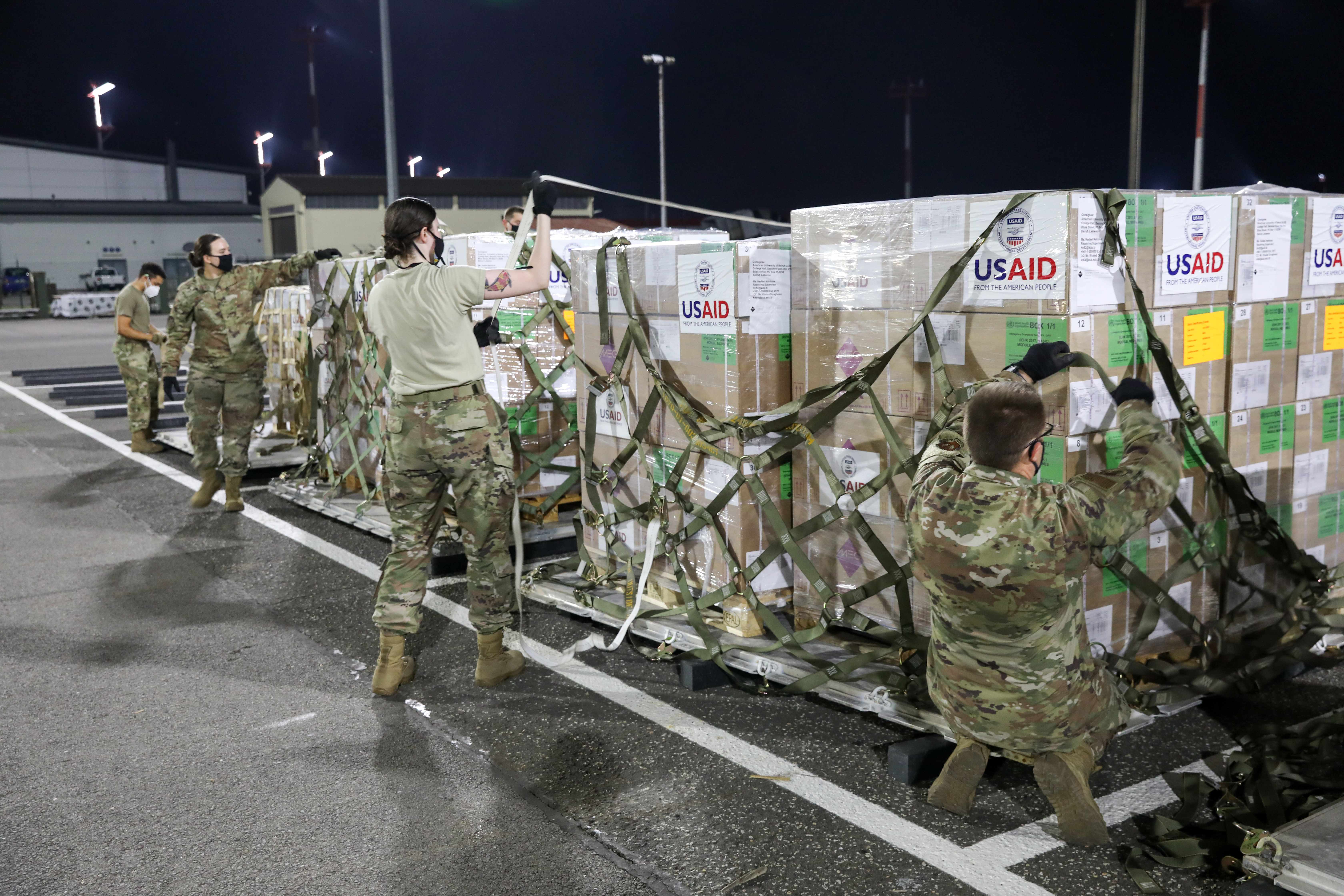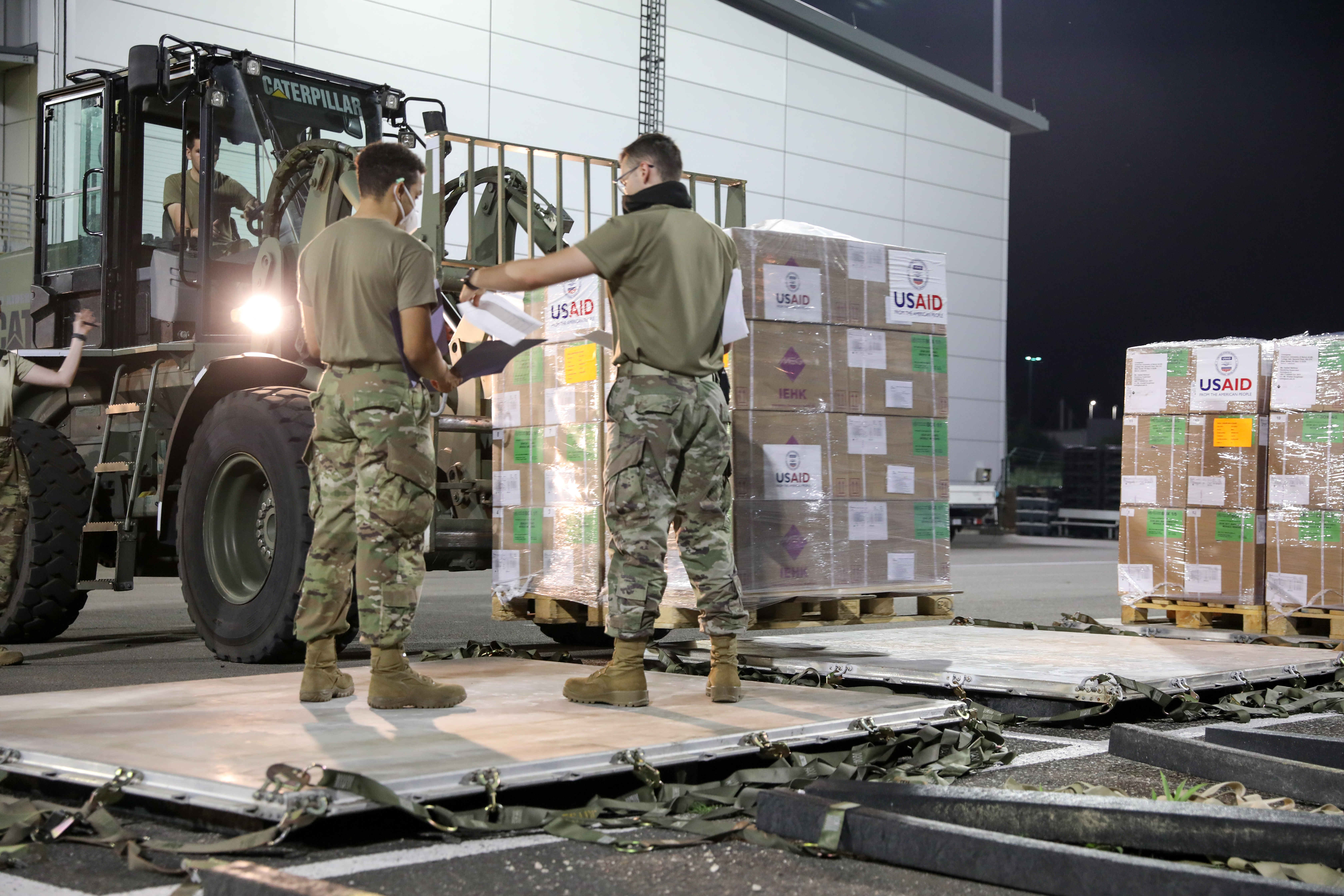 U.S. Army and Air Force service members assisted USAID with the transportation of nearly 12,000 pounds of medical kits from the Netherlands, through Germany and on to Lebanon. These kits contain items such as medicines, bandages, gauze, examination gloves, thermometers and syringes. The International Emergency Medical Kits are designed to enable local hospitals address the critical medical needs of the victims of the recent explosion and COVID-19. (U.S. Army photo by Staff Sgt. Benjamin Northcutt, 21st Theater Sustainment Command)and)