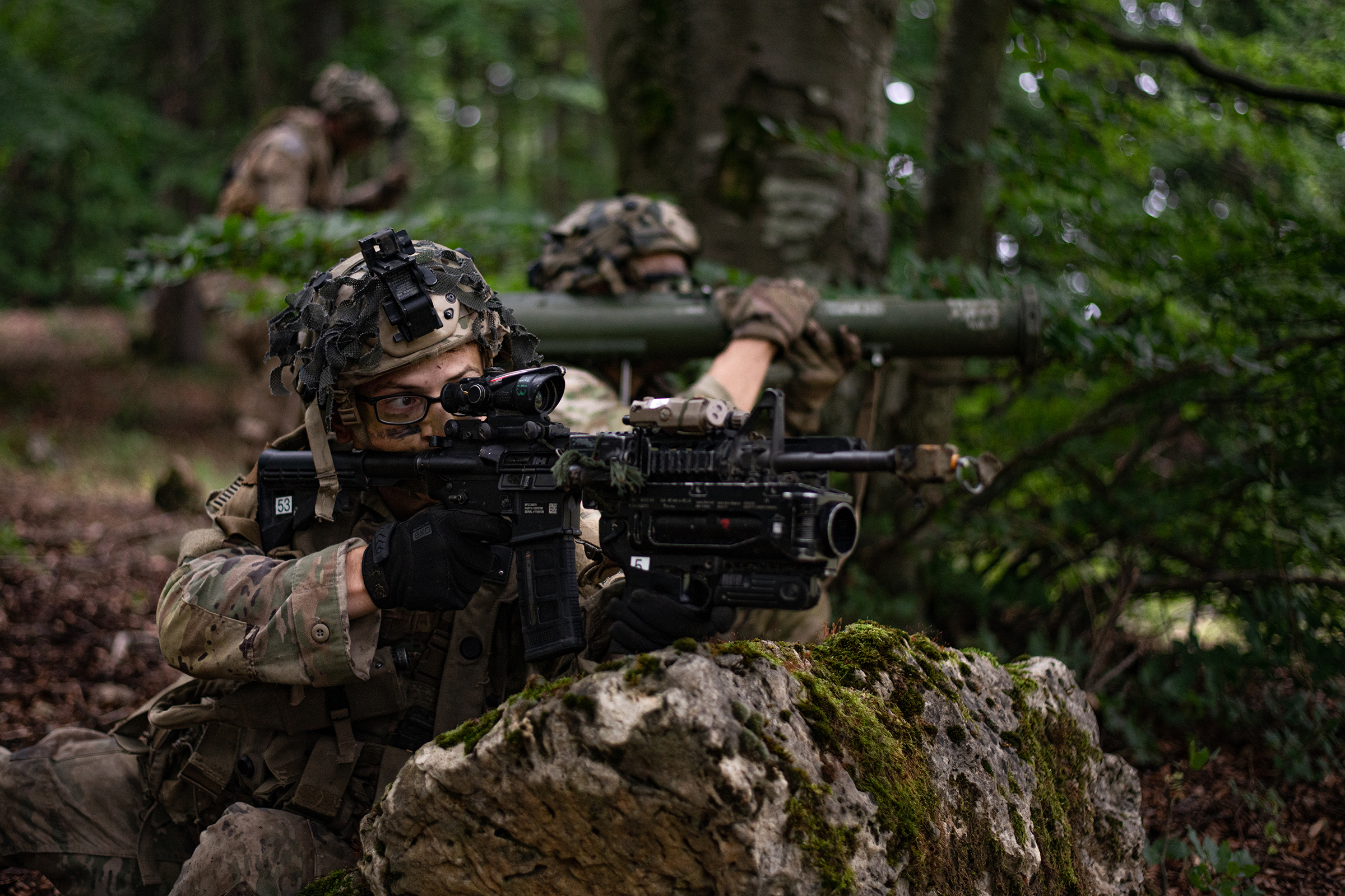 A U.S. Army paratrooper assigned to 2nd Battalion, 503rd Parachute Infantry Regiment, 173rd Airborne Brigade fires at hatch gunners fighting from a BMP-2M tank during a battalion engagement Aug. 16, 2020 as part of Exercise Saber Junction 20. This exercise is taking place at the Joint Multinational Training Center in the Hohenfels Training Area, Germany from Aug. 10 to Aug. 26, 2020.