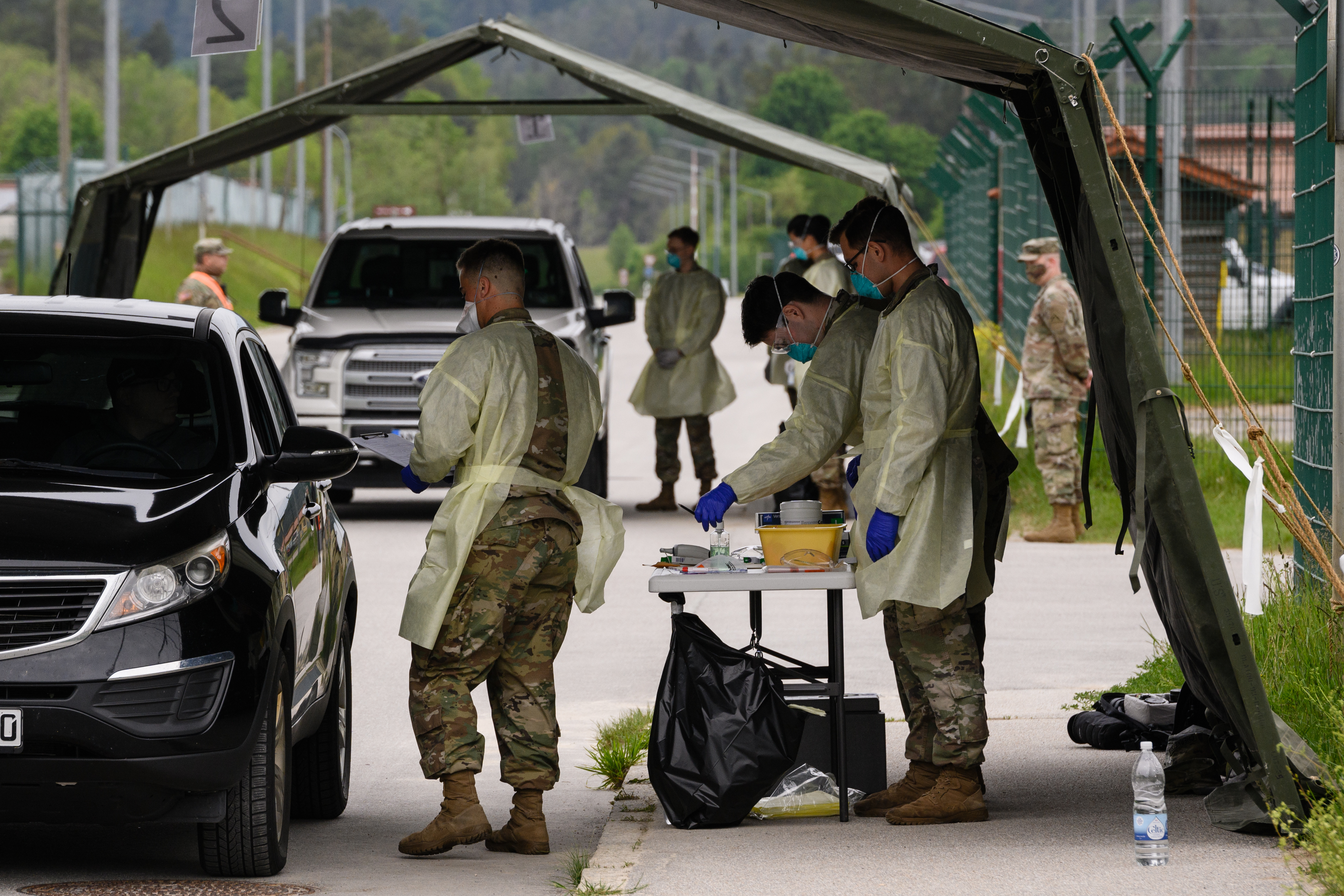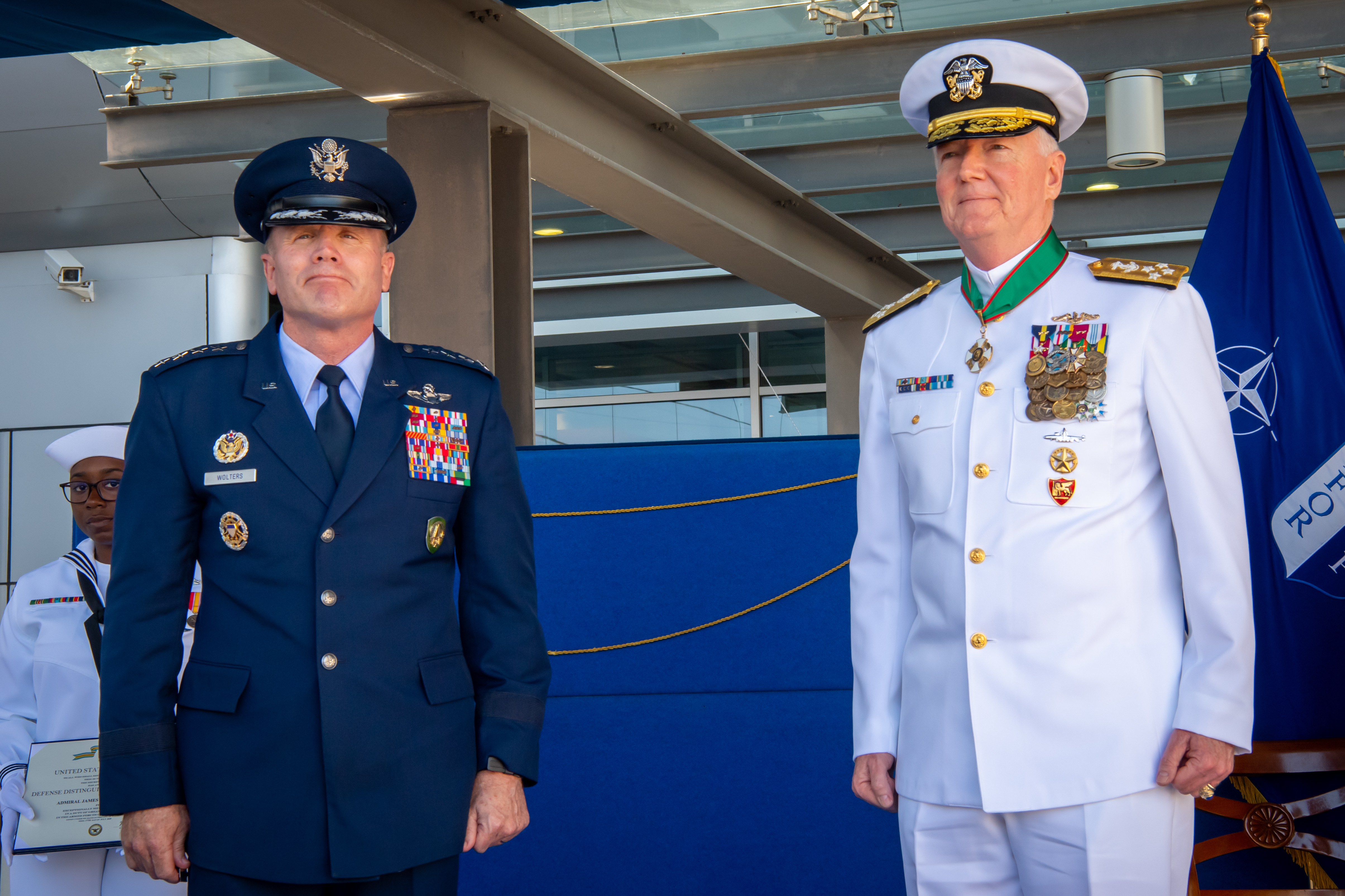200717-N-NO090-1002 NAPLES, Italy (July 17, 2020) Adm. Robert P. Burke, Gen. Tod D. Wolters, commander, U.S. European Command and Supreme Allied Commander Europe, and Adm. James G. Foggo III, commander, U.S. Naval Forces Europe-Africa and commander, Allied Joint Force Command-Naples, salute the colors during the U.S. Naval Forces Europe-Africa, Allied Joint Force Command change of command ceremony. Adm. Foggo was relieved by Adm. Robert P. Burke at Allied Joint Force Command (JFC) Naples, Italy, July 17, 2020. U.S. Naval Forces Europe-Africa, headquartered in Naples, Italy, conducts the full spectrum of joint and naval operations, often in concert with allied and interagency partners, in order to advance U.S. national interests and security and stability in Europe and Africa. (Photo courtesy of JFC Public Affairs, German Airforce Master Sergeant Florian Fergen)