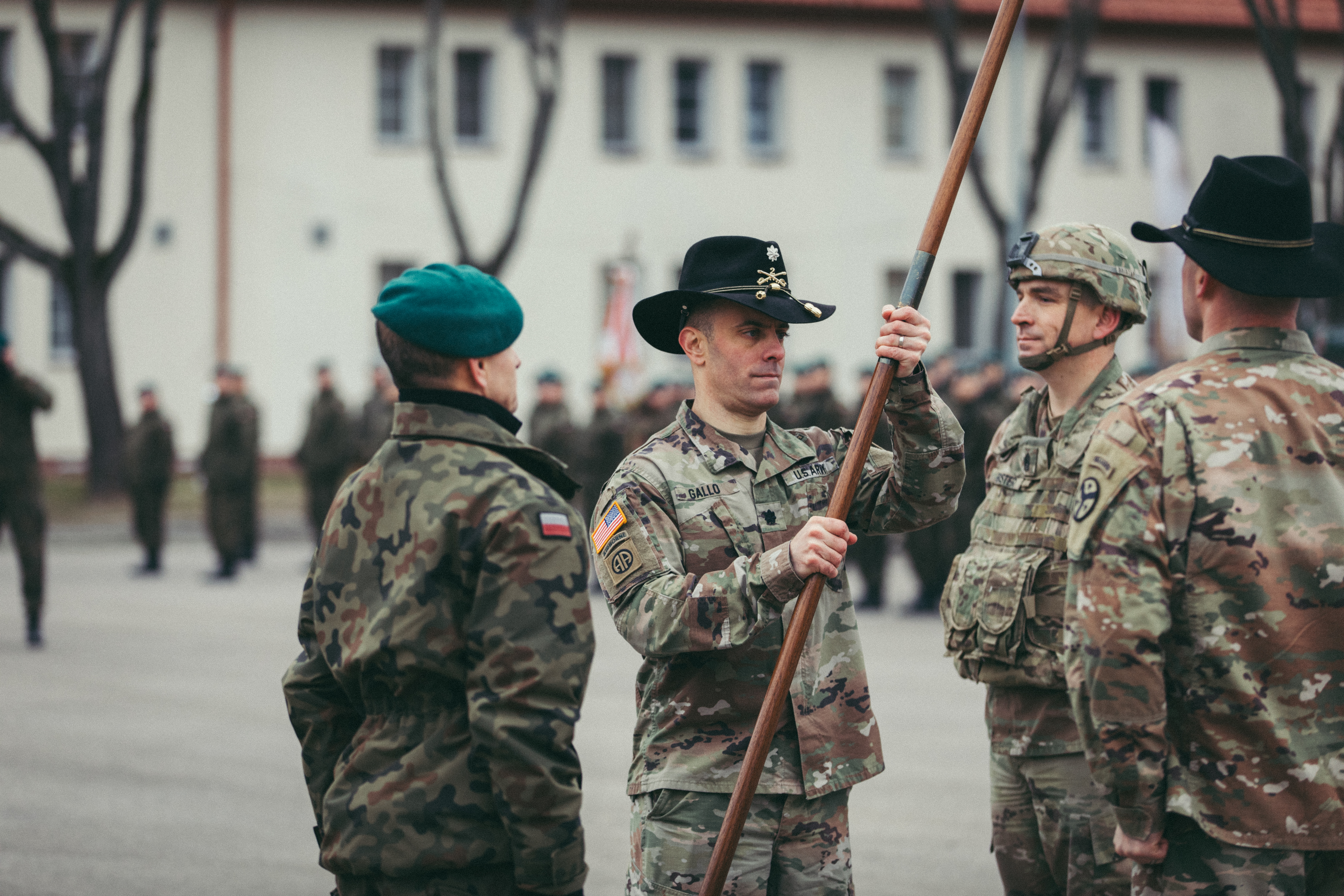 U.S. Army Lt. Col. Andrew Gallo, (center) commander assigned to the 3rd Squadron, 2d Cavalry Regiment, holds the NATO's enhanced Forward Presence Battle Group Poland flag during a transfer of authority ceremony in Bemowo Piskie, Poland, Jan. 20, 2020. NATO’s enhanced Forward Presence consists of four battalion-sized battle groups deploying on a persistent rotational basis to Estonia, Latvia, Lithuania and Poland to demonstrate the alliance’s determination and ability to act as one in response to any aggression against its members. (U.S. Army photo by Sgt. Timothy Hamlin)