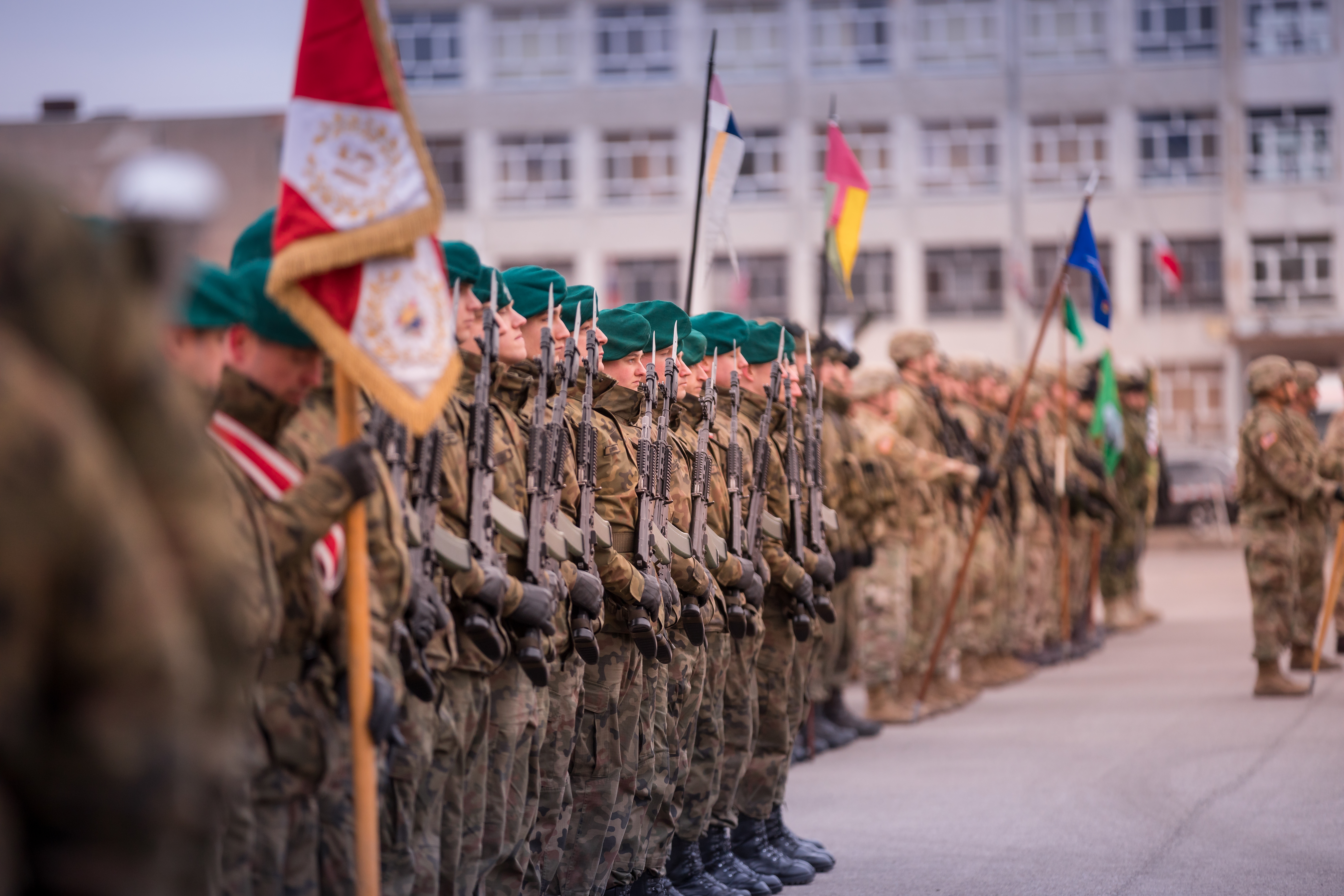 Soldiers from Poland, Croatia, Romania, United Kingdom and the United States stand in unison during a transfer of authority ceremony for the NATO's enhanced Forward Presence Battle Group Poland in Bemowo Piskie, Poland, Jan. 20, 2020. NATO’s enhanced Forward Presence consists of four battalion-sized battle groups deploying on a persistent rotational basis to Estonia, Latvia, Lithuania and Poland to demonstrate the alliance’s determination and ability to act as one in response to any aggression against its members. (U.S. Army photo by Sgt. Timothy Hamlin)