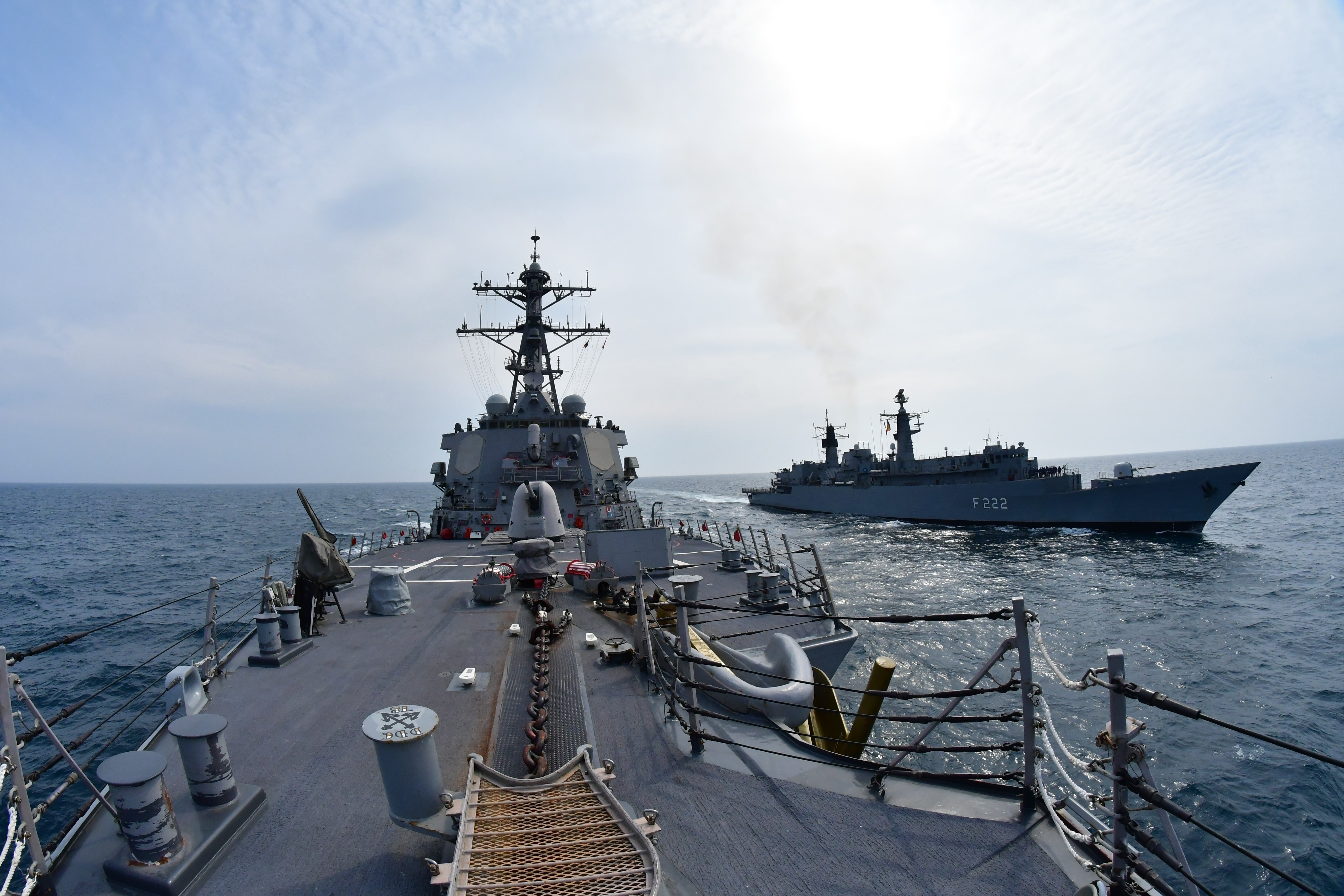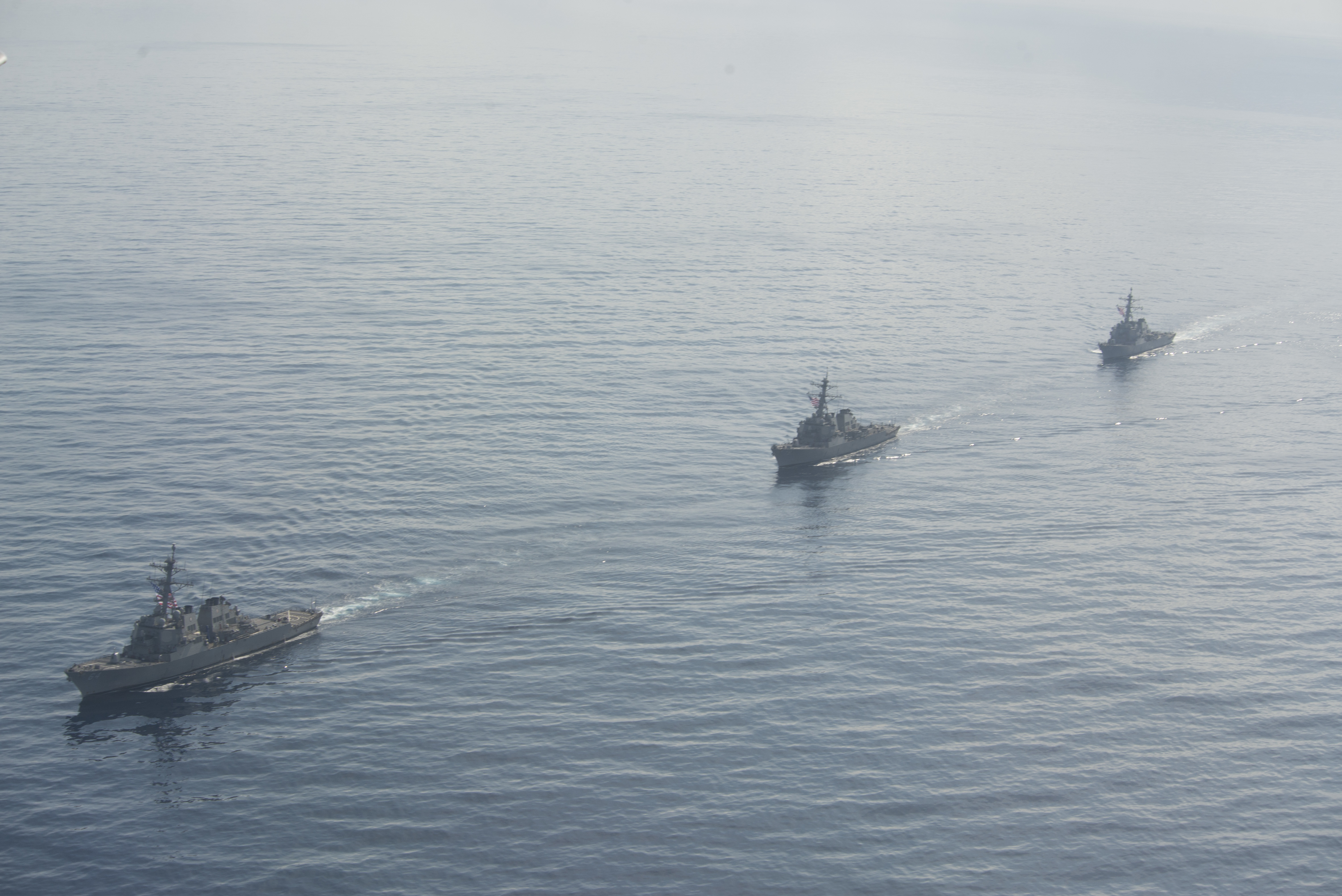 Three Navy destroyers operate with a pair of P-8As