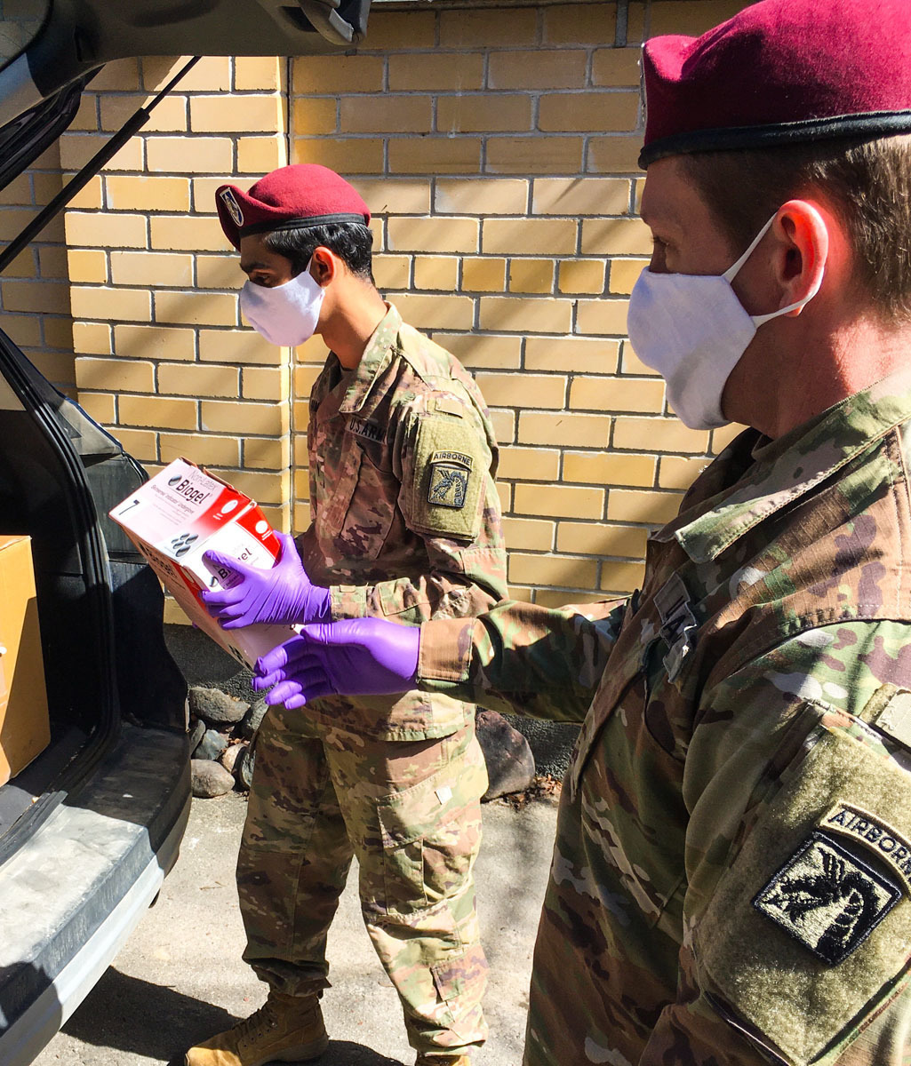 Staff Sgt. Elijah Zieg (right), a team sergeant for Bravo Company, 331st Civil Affairs Team, 418th Civil Affairs Battalion, and Spc. Nicholas Rampersaud (left), a medic for Bravo Company, 331st CAT, unload supplies from the back of a van in Nemencine, Lithuania, on April 14, 2020. The 331st along with the US Embassy Office of Defense Cooperation (ODC) and the Defense Attaché Office (DATT), delivered medical supplies to a Lithuanian state distribution center. These medical supplies will be dispersed throughout the community.