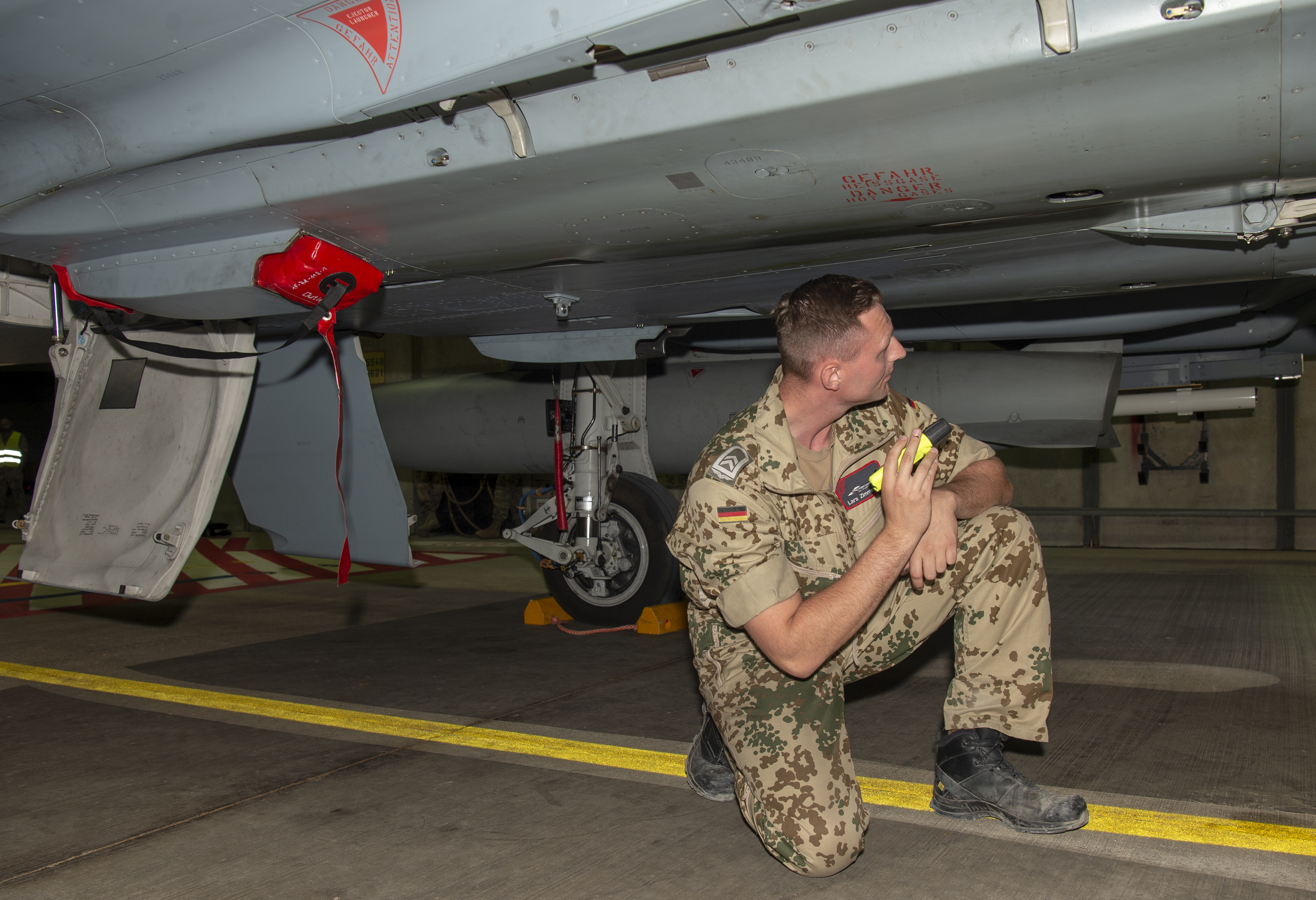 German air force Tech. Sgt. Lars Zimmerman, 71st Fighter Wing F-2000 Eurofighter Typhoon crew chief, inspects an F-2000 during Blue Flag 2019 at Uvda Air Base, Israel, November 11, 2019. The F-2000 is known as a four and a half generation fighter because it is a 4th generation platform that has upgraded systems. (U.S. Air Force photo by Airman 1st Class Kyle Cope)