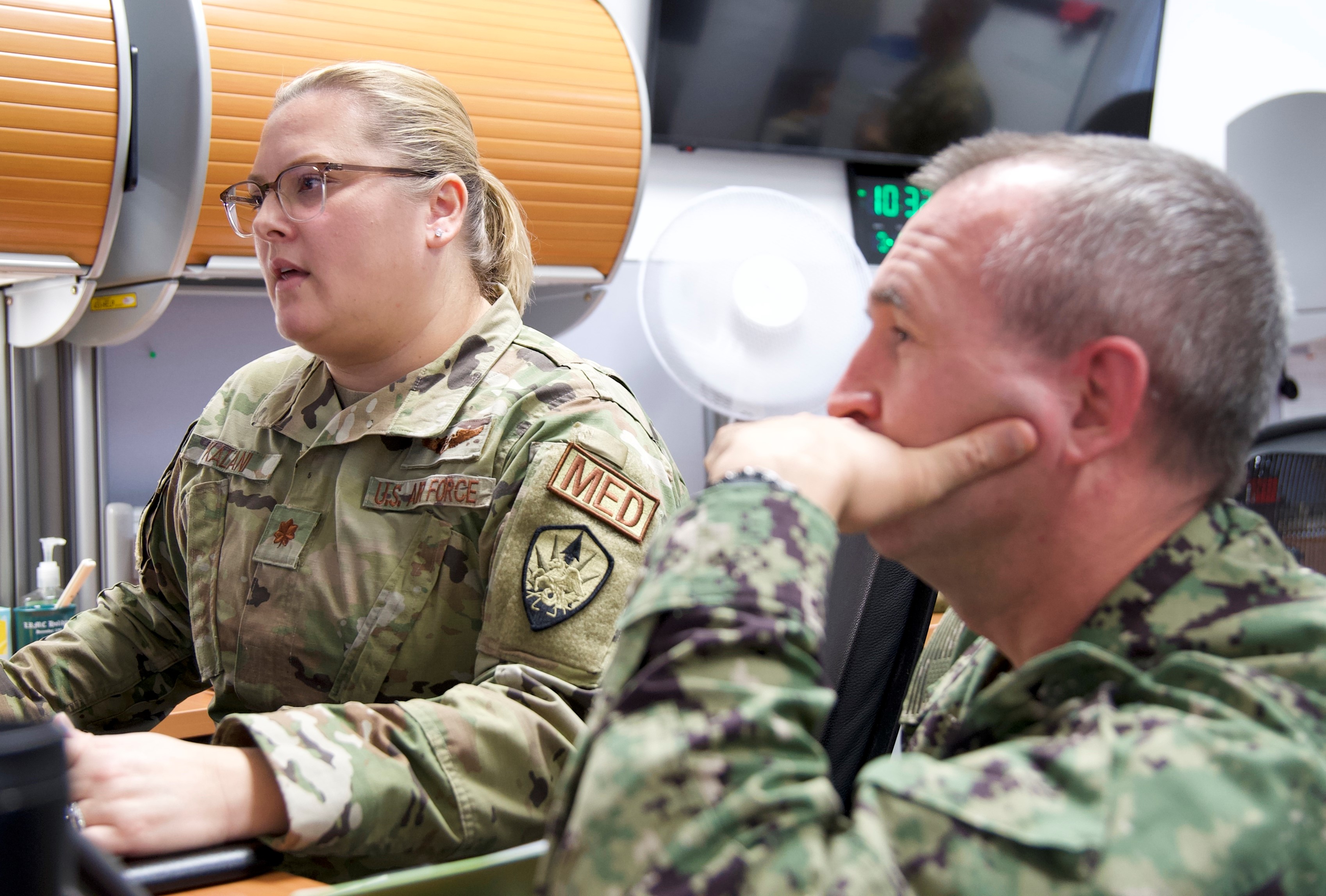 U.S. Air Force, Maj. Lauren Kalani, patient movement clinical coordinator for U.S. Transportation Command's Patient Movements Requirement Center- Europe, speaks with U.S. Navy Senior Chief, Vlad Voronov, to resolve a simulated patient movement request sent to the Joint Patient Evacuation Coordination Center during U.S. European Command's command post exercise, Austere Challenge 24, at Patch Barracks, Stuttgart, Germany, March 7, 2024. (Photo by U.S. Air Force 1st. Lt. Gabriele Gocso)