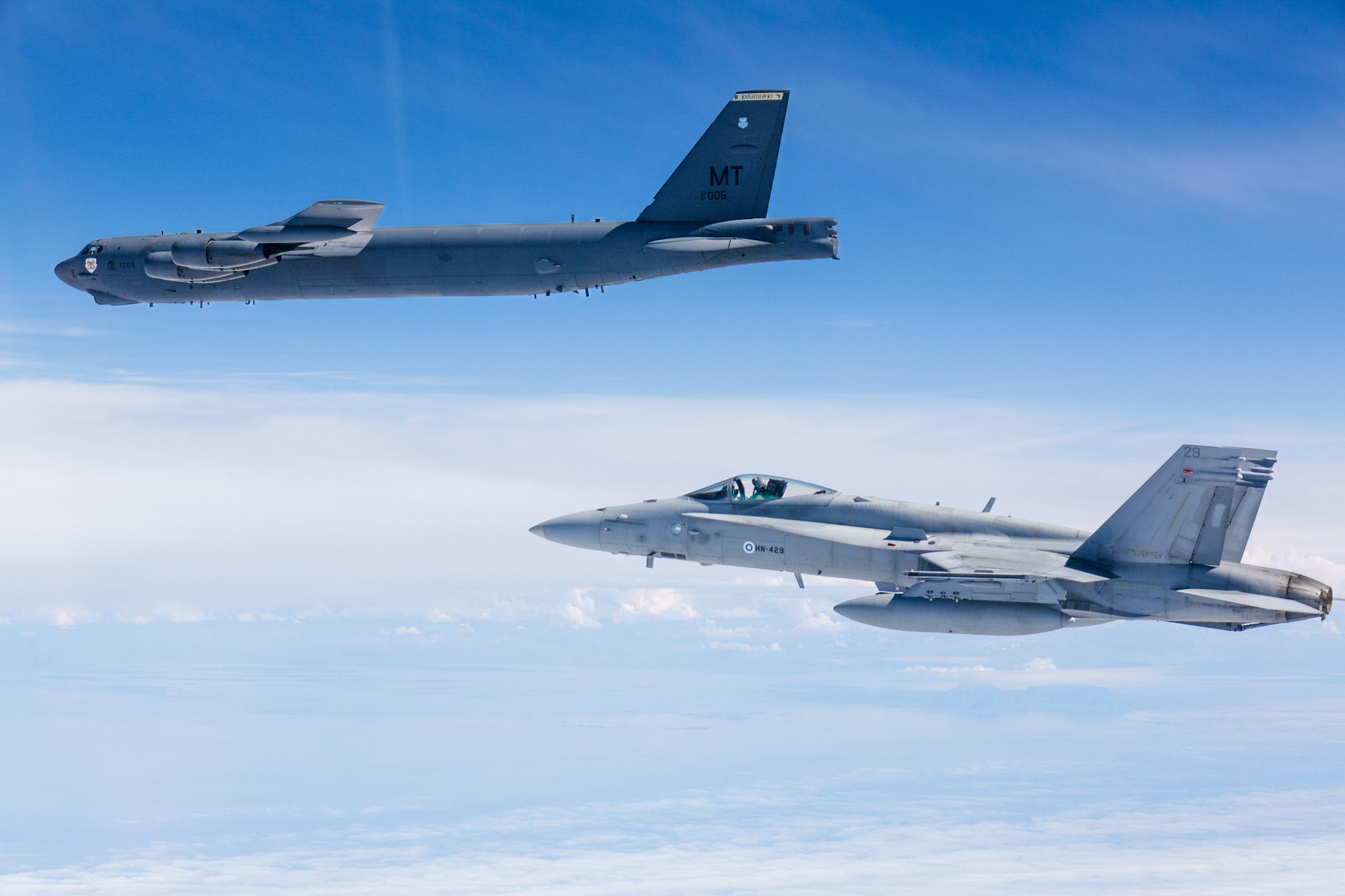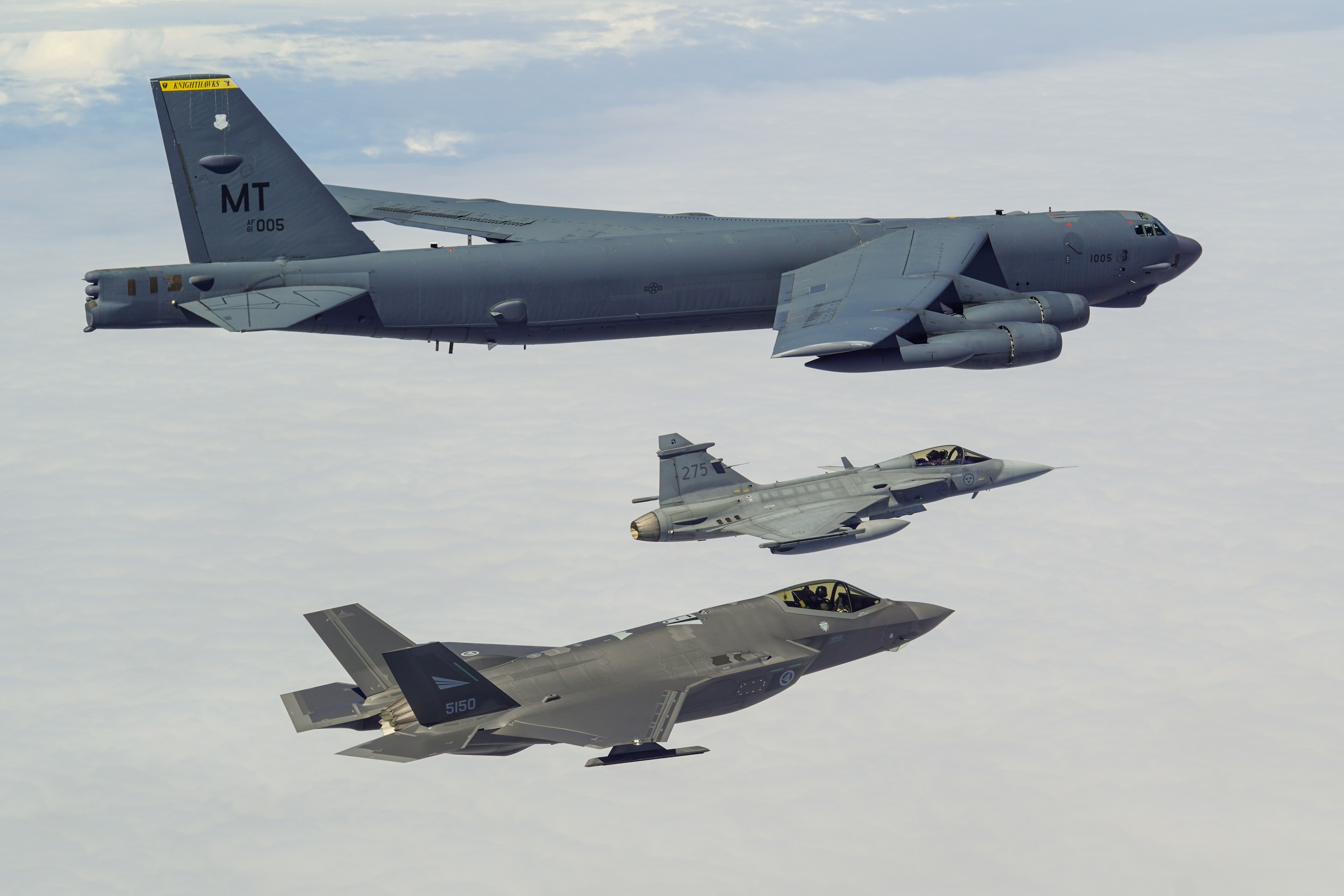 A Finish Air Force fighter jet flies alongside a U.S. Air Force B-52 Stratofortress as part of exercise Global Guardian's Bomber Task Force Europe 24-3 deployment, June 20, 2024.