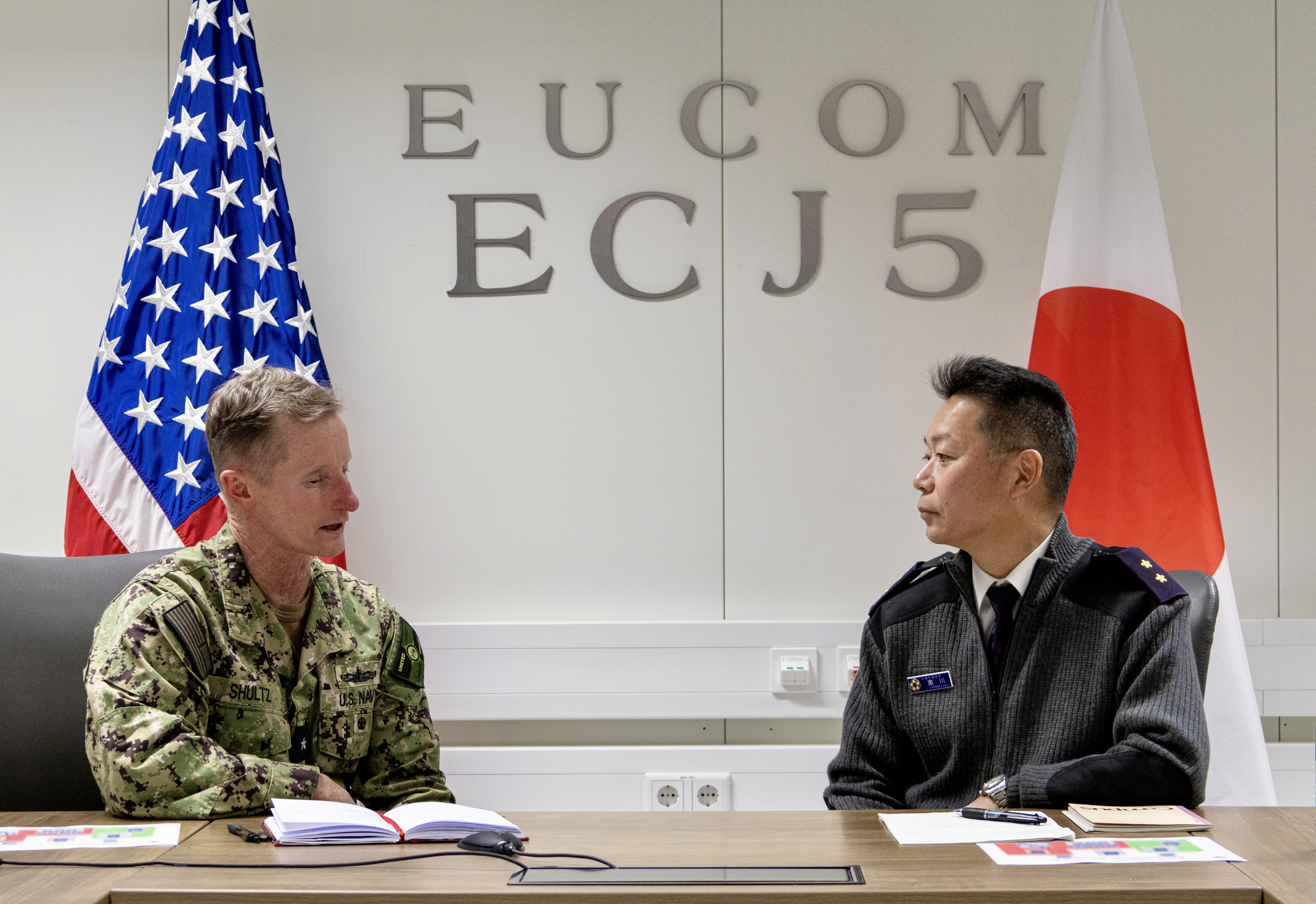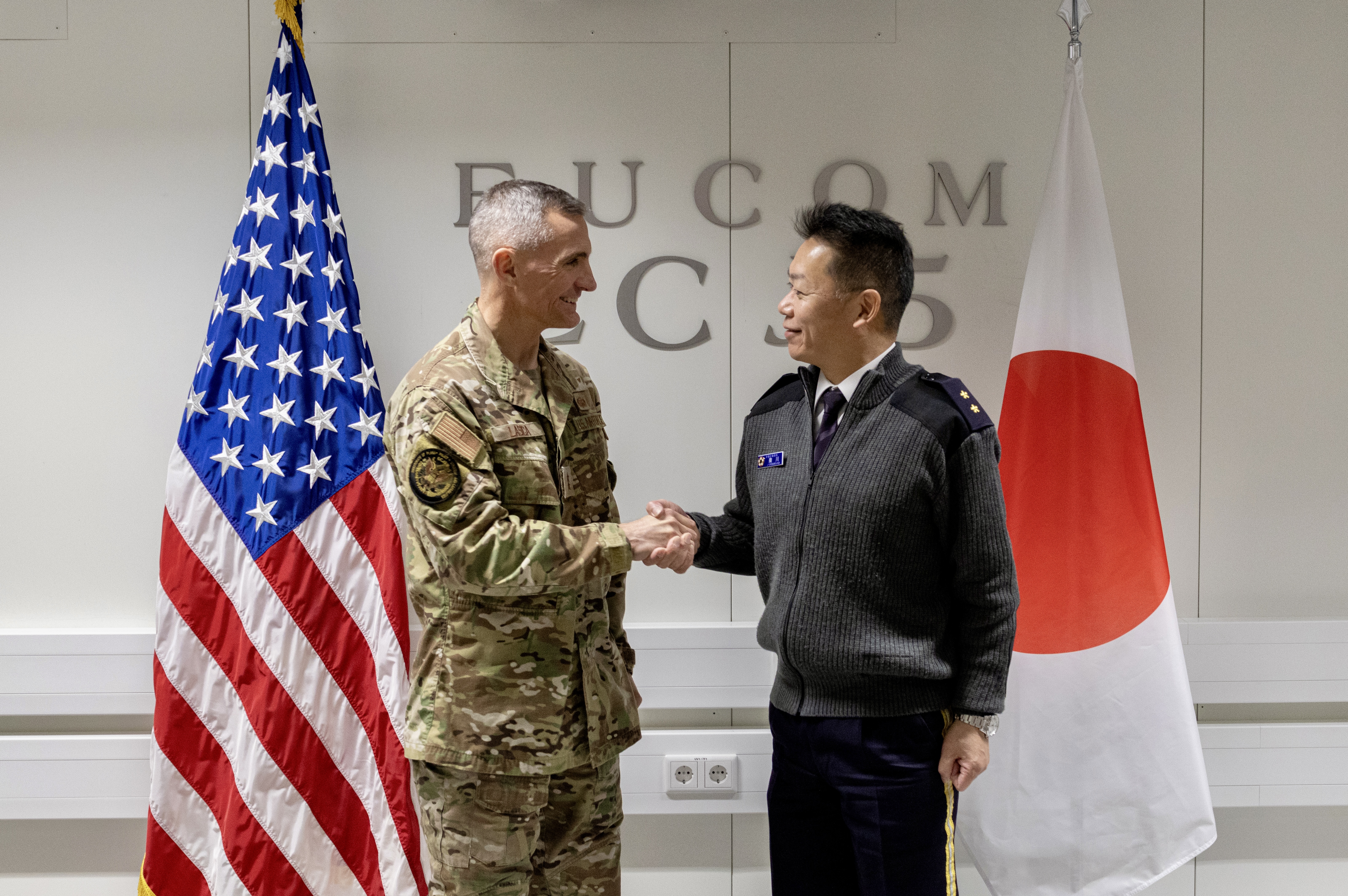U.S. Air Force Maj. Gen. Daniel Lasica, director for U.S. European Command plans, policy, strategy and capabilities, hosted Japan Joint Staff Maj. Gen. Nobutaka Minamikawa, director of defense plans and policy department, at USEUCOM‘s headquarters in Stuttgart, Germany, on March 11, 2024.
