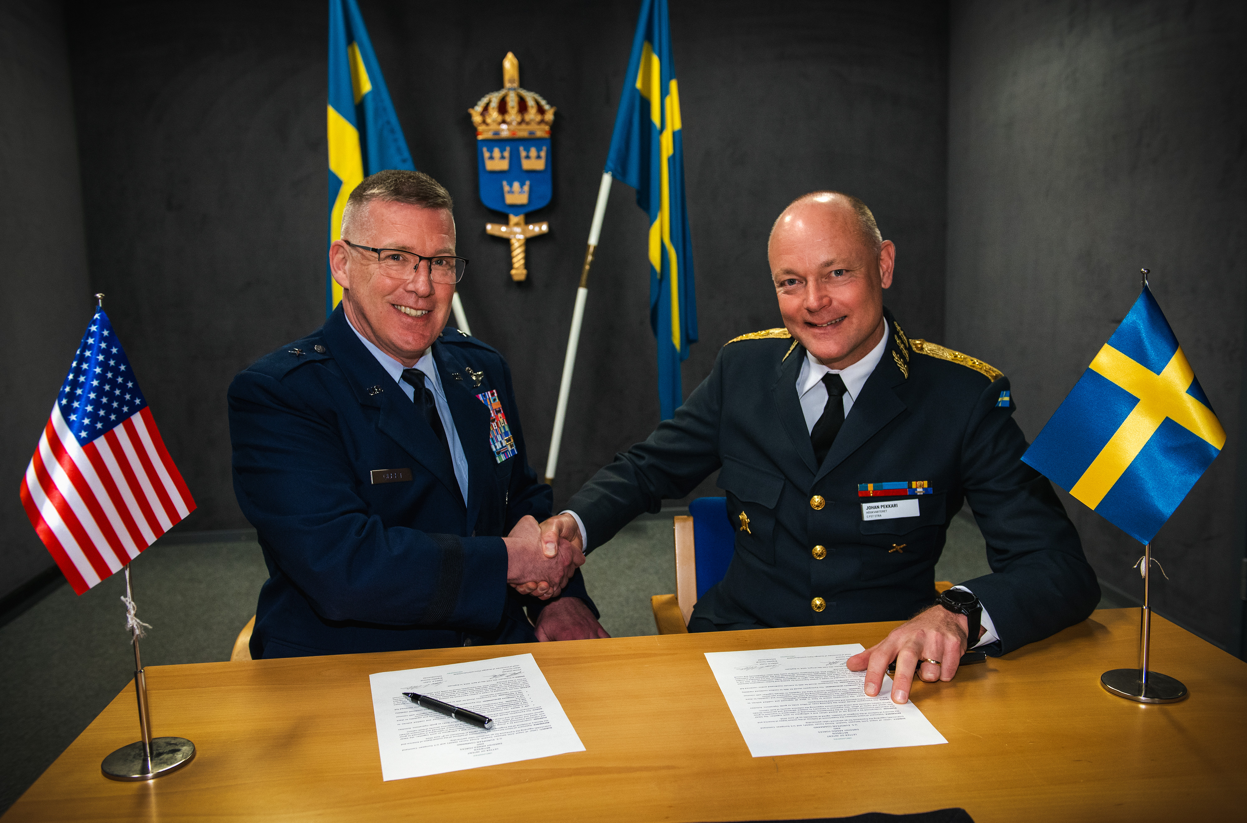 Maj. Gen. Johan Pekkari, the Swedish chief director of strategic plans and policy, and U.S. Air Force Brig. Gen. James D. Cleet, USEUCOM’s deputy director of plans and operations sign a letter of intent on April 12, 2024 in Stockholm, Sweden. This outlines a framework for an advanced cyber partnership between Sweden and the United States.